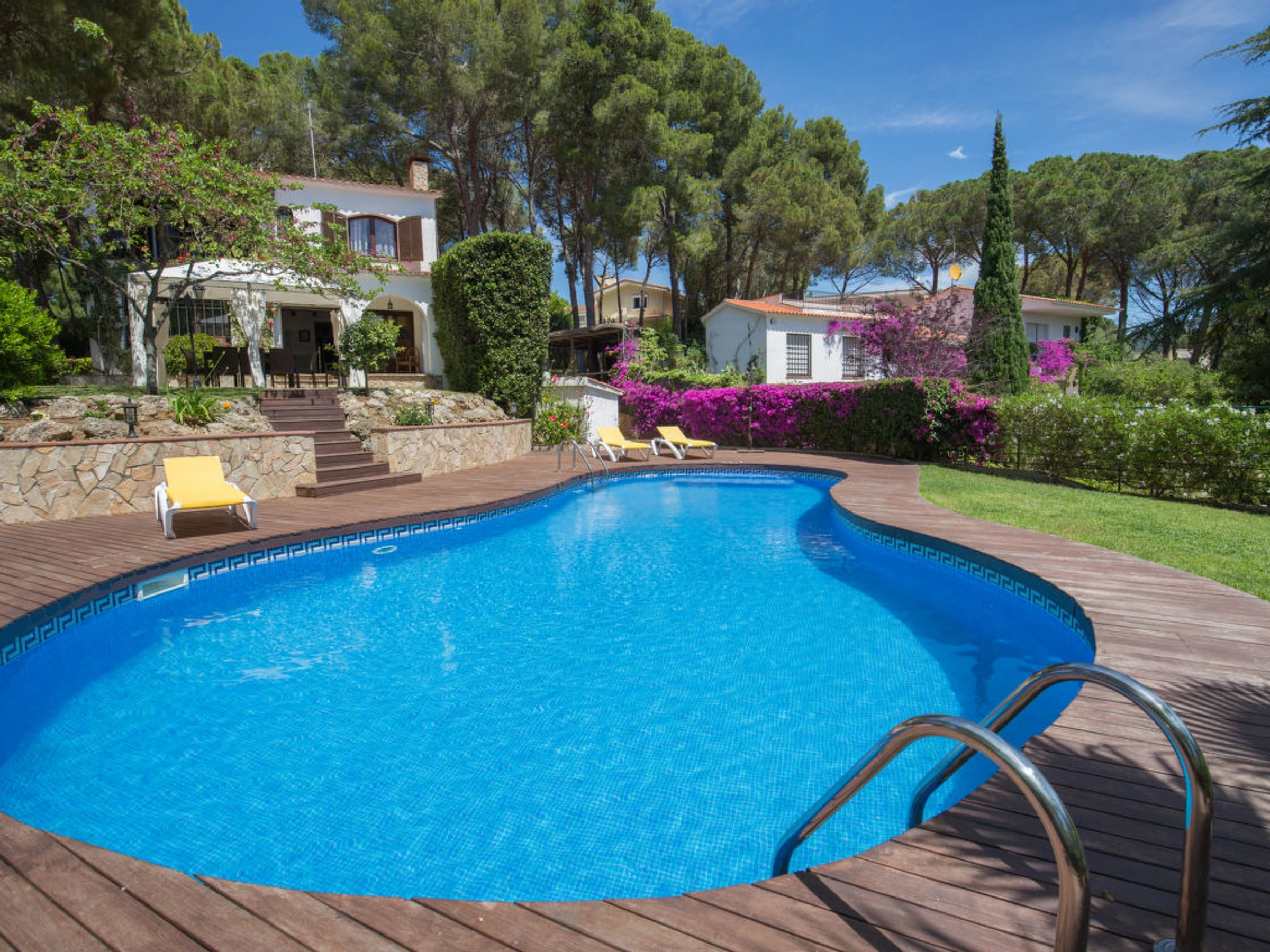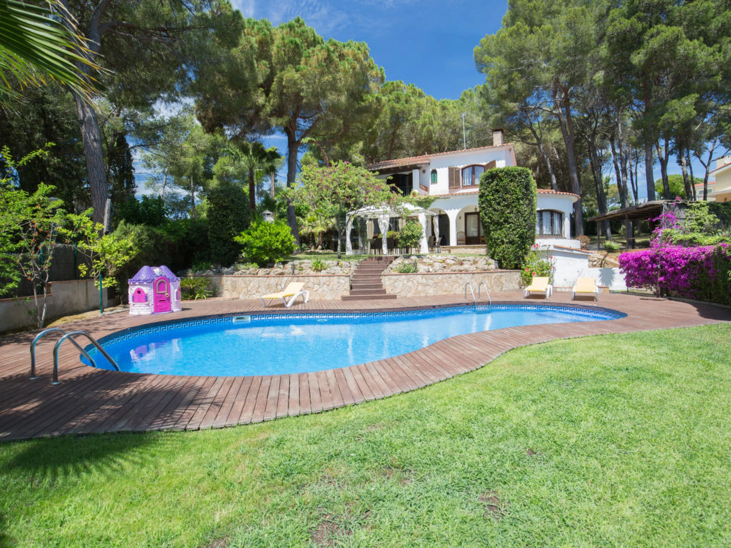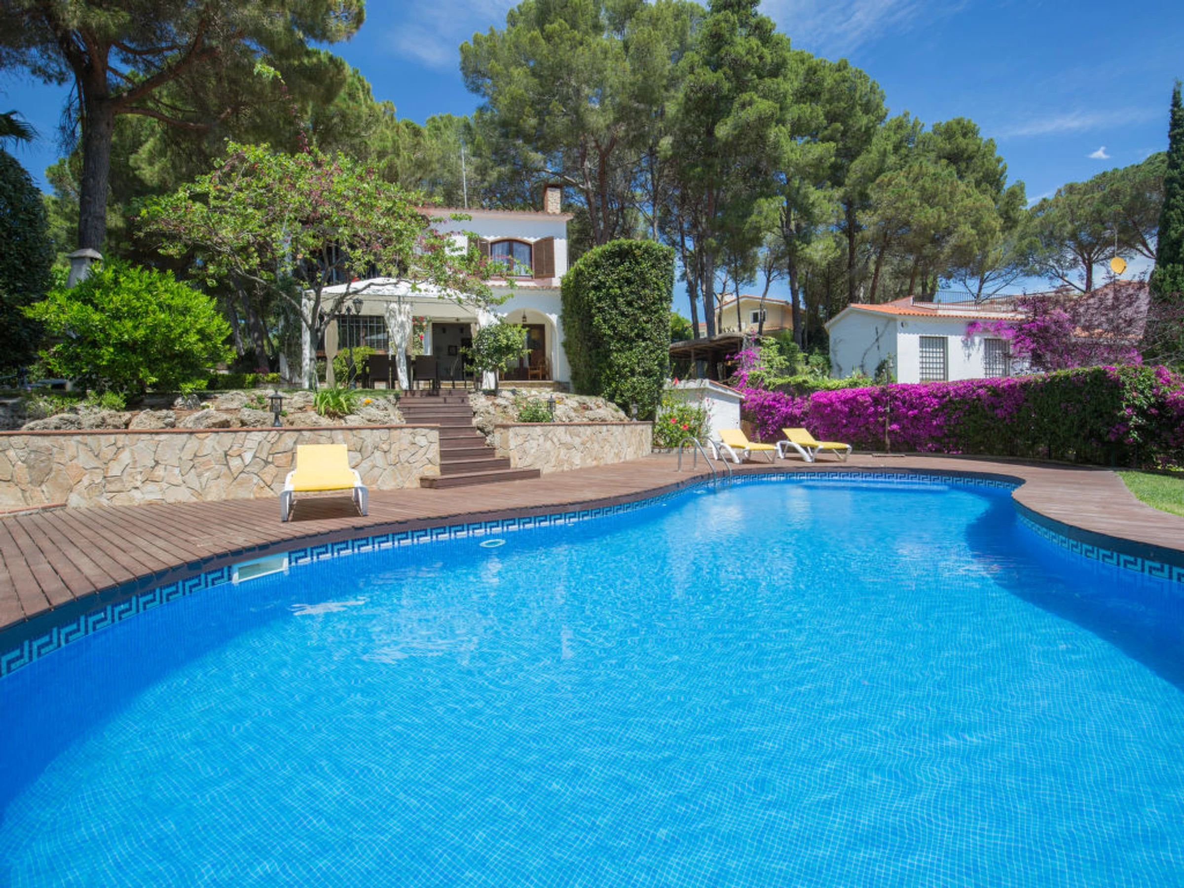 Villa "Palangre", muy bonita, lujosa de 3 plantas. En la localidad, a 500 m del centro de Lloret de Mar, lugar soleado, a 150 m del mar, a 150 m de la playa. Privado: terreno en estado natural 250 m2, jardín natural, bonito jardín para relajarse, piscina en forma de riñon (9 x 5 m,[hidden].) con escalera interior. Ducha/WC en zona de piscina, tobogán, barbacoa, parque infantil (tobogán, columpio), garaje individual junto a la casa posibilidad de aparcamiento en la calle. Tienda 500 m, supermercado 2 km, restaurante, panadería 500 m. Puerto deportivo 2 km, campo de golf (18 hoyos) 8 km, minigolf 2 km. Atracciones en los alrededores: Waterworld Lloret de mar 6 km, Pueblo medieval de tossa de mar 9 km, Marinland blanes 12 km. A tener en cuenta: coche indispensable. Adecuado para familias. Grupos de jóvenes sólo bajo petición. Residencia con vigilancia.