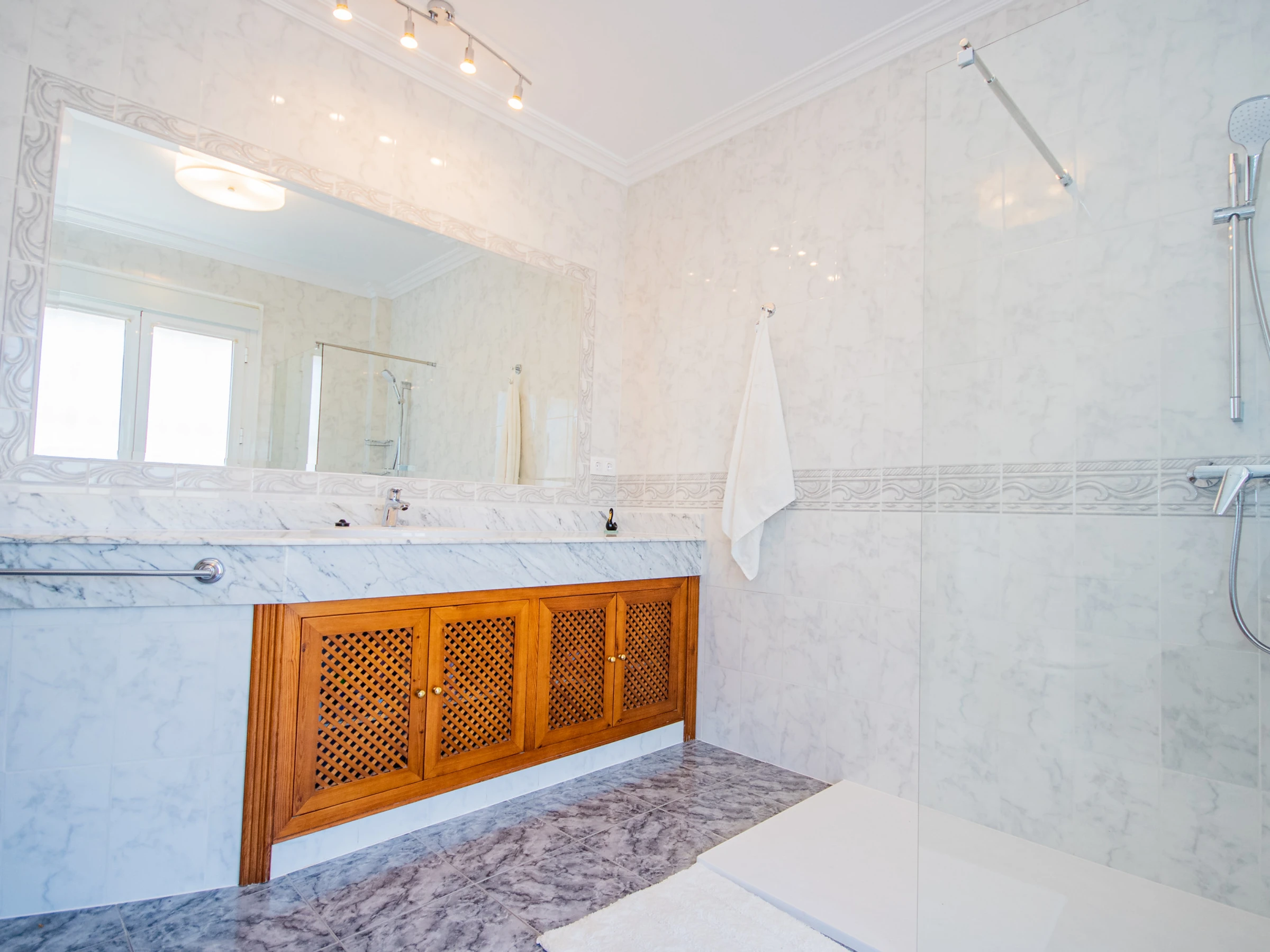 En el interior, la villa de 215 m² ofrece cinco dormitorios amueblados con buen gusto, luminosos y acogedores, con capacidad para 10 personas. Destacan dos habitaciones especiales: una buhardilla con claraboyas que proporciona una luz única y un escritorio ideal para trabajar o estudiar, y la habitación principal en la segunda planta con televisión propia, sala de estar privada y un amplio baño para relajarte tras un día de excursiones o playa.