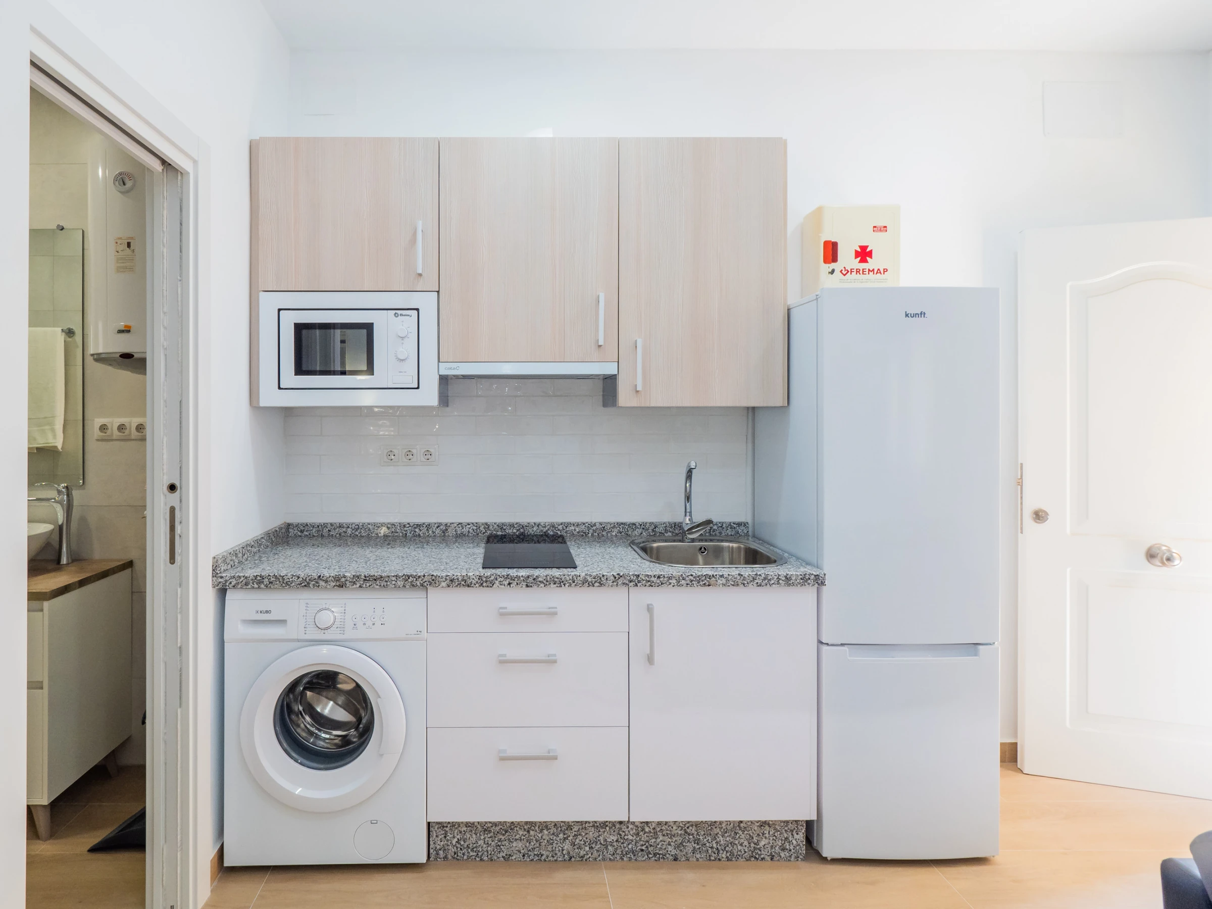 El estudio está equipado con fibra óptica de alta velocidad, ideal para teletrabajar con total estabilidad y fluidez en la transmisión de archivos. Al entrar, se aprecia un espacio abierto y funcional que integra una cocina americana equipada con inducción, nevera, microondas, congelador, lavadora, cafetera, tostadora, hervidor, exprimidor y todo lo necesario para preparar sus comidas cómodamente. La zona de descanso cuenta con un sofá para relajarse y una cómoda cama de matrimonio para un descanso óptimo. El baño es amplio y dispone de plato ducha.