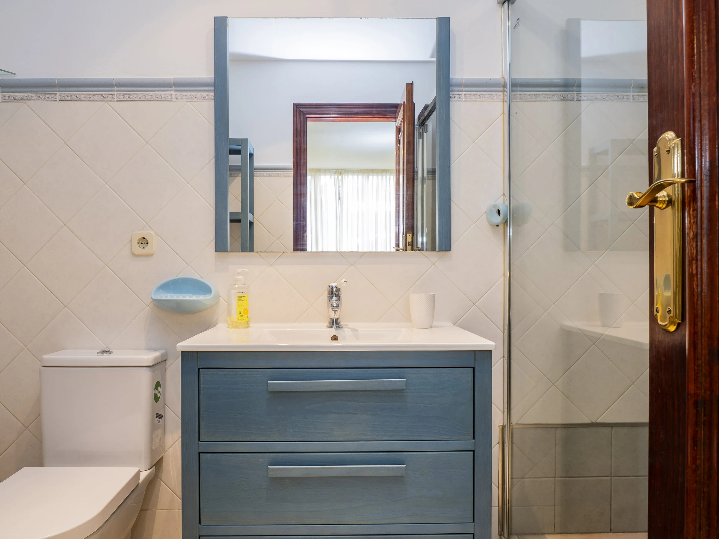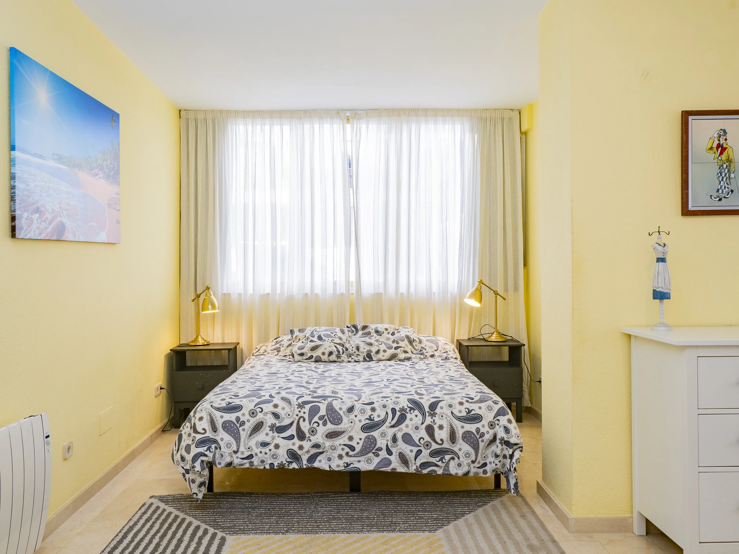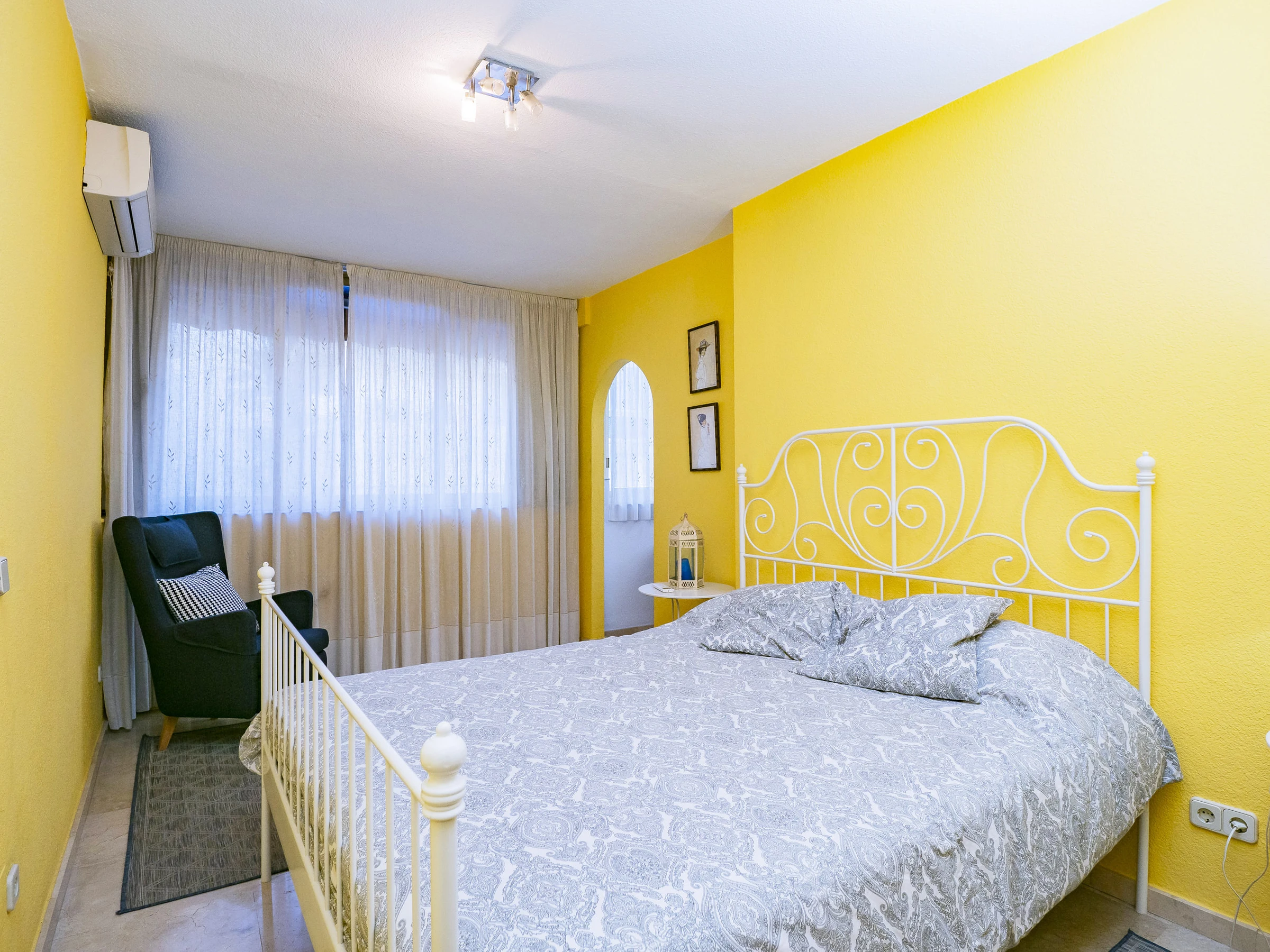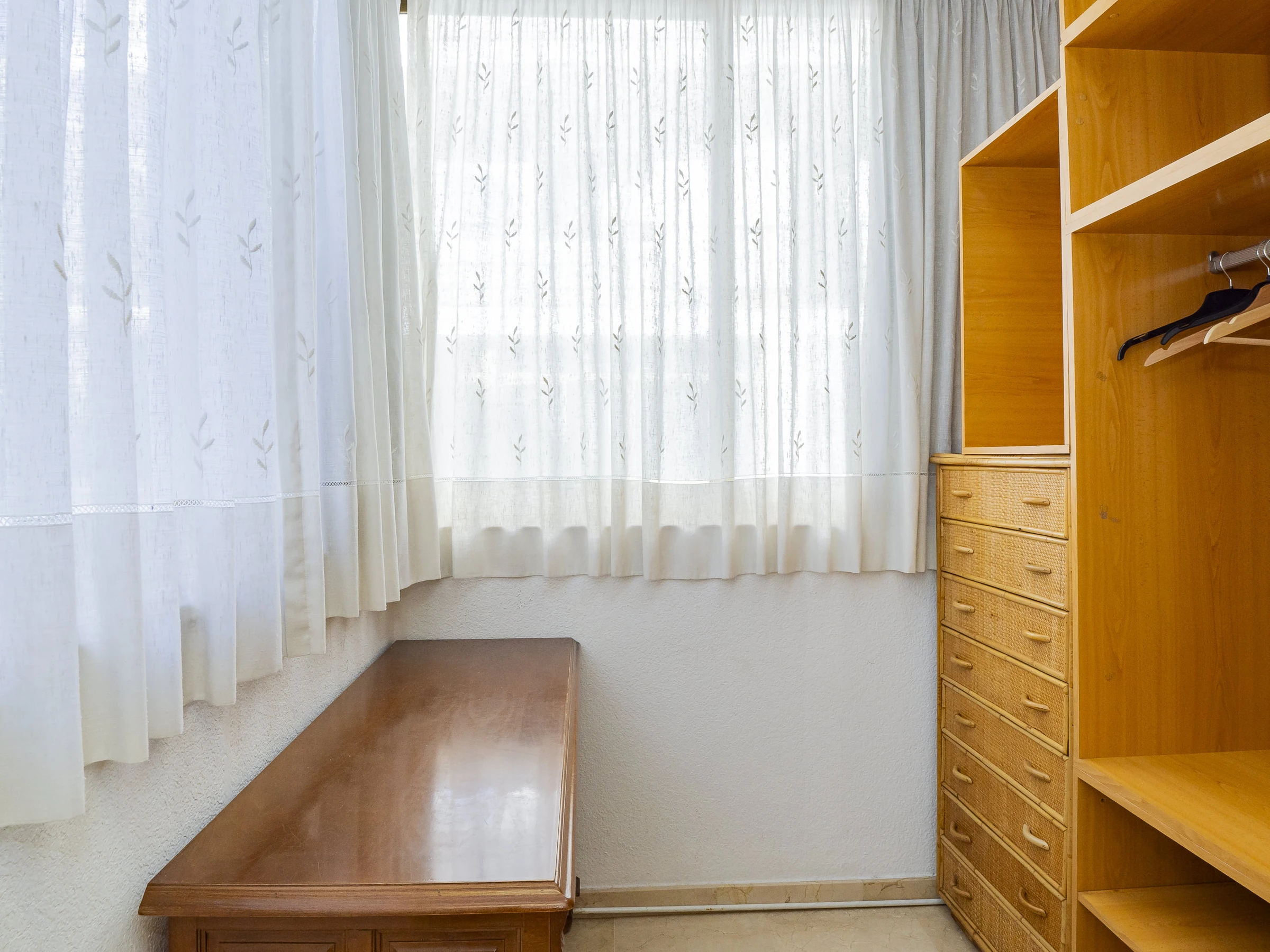 El apartamento cuenta con tres dormitorios: dos con camas de matrimonio y vestidor, uno de ellos con baño en suite con plato ducha 🚿, y un tercer dormitorio con cama nido que ofrece dos camas individuales. Hay un segundo baño con plato ducha y zona de lavandería cerca de las habitaciones. Además, el salón y algunos dormitorios disponen de aire acondicionado y ventiladores para tu confort.