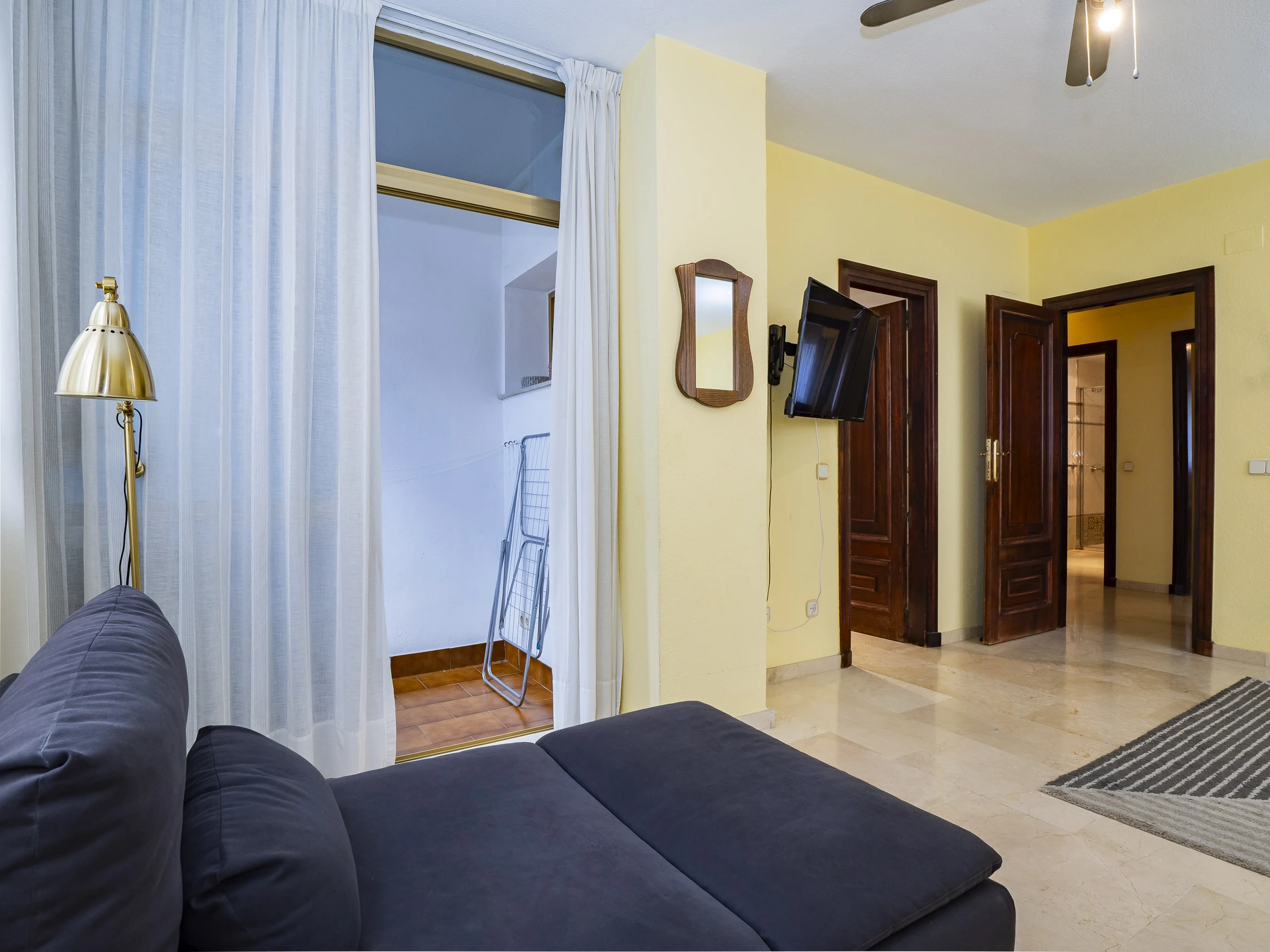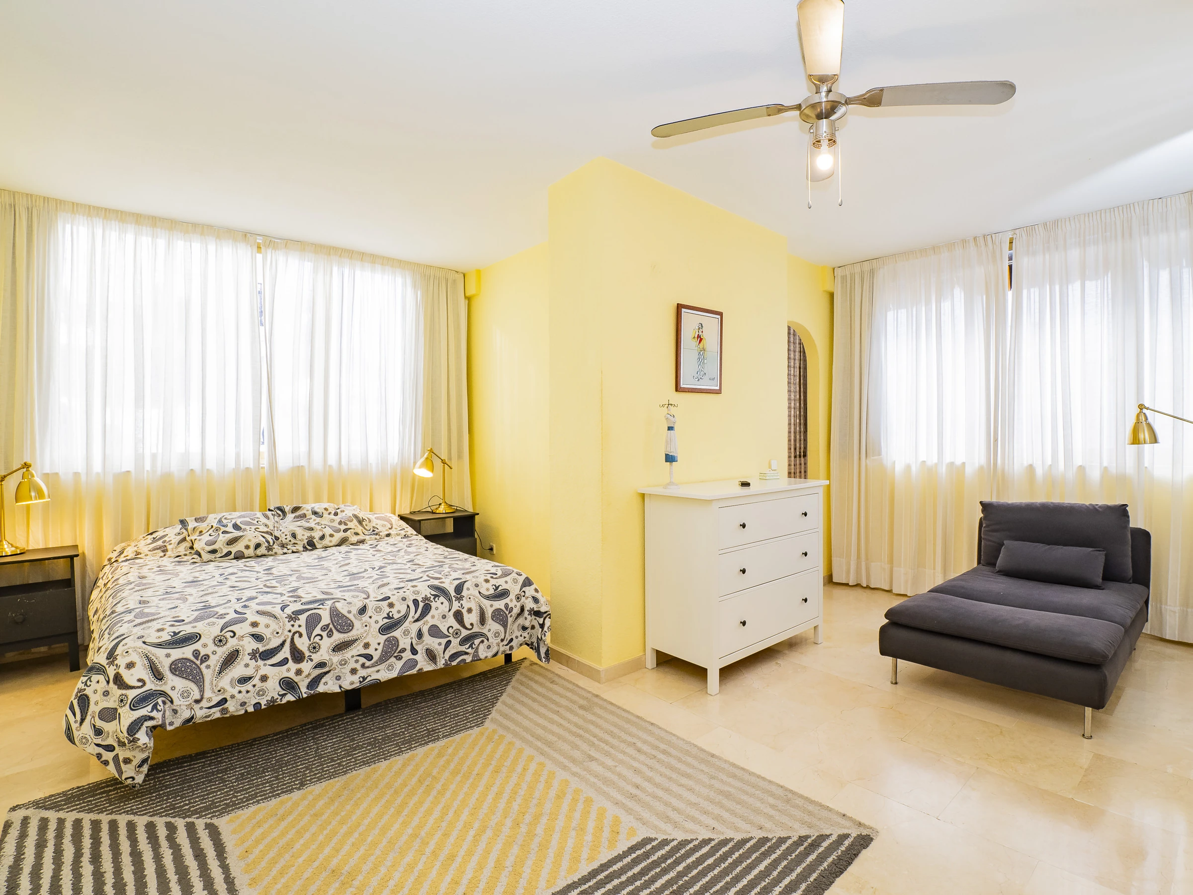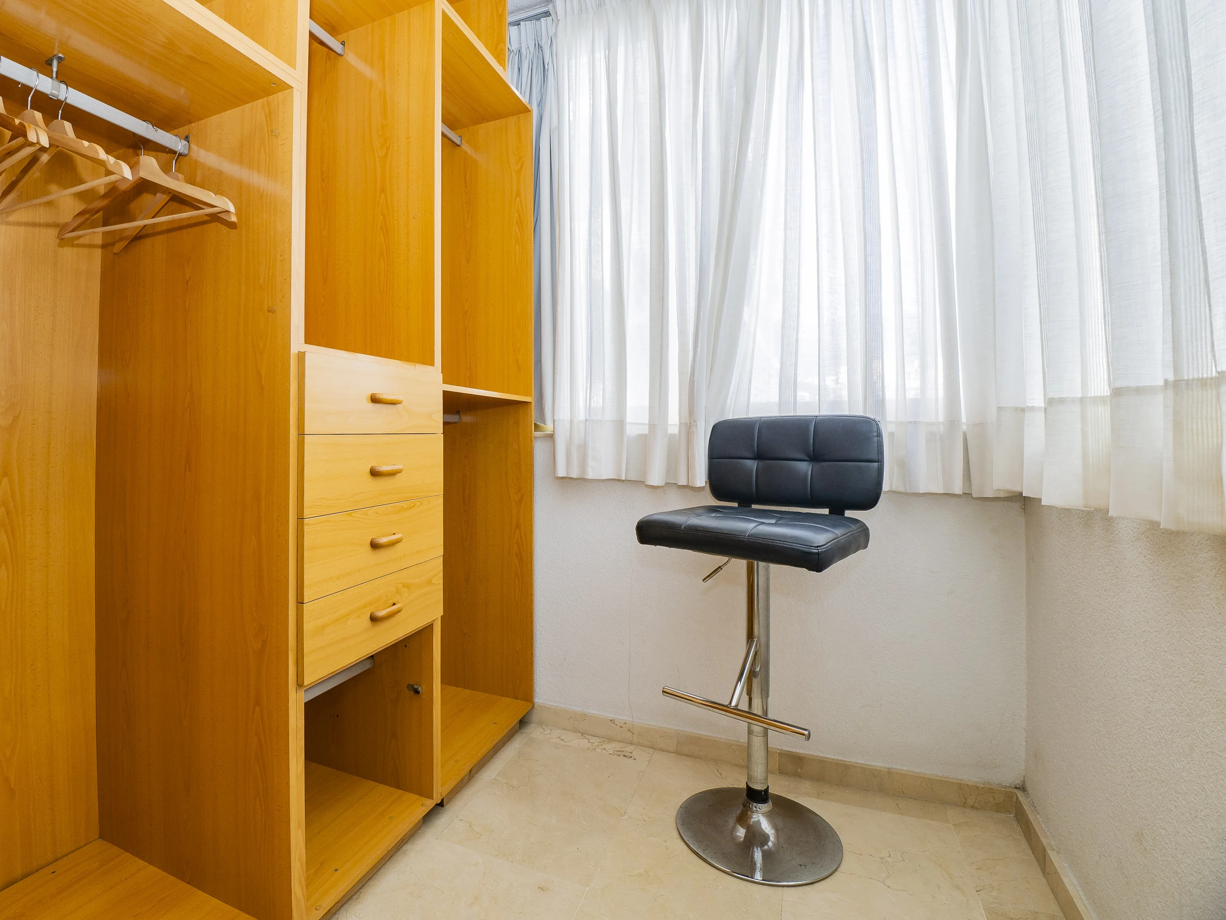 El apartamento cuenta con tres dormitorios: dos con camas de matrimonio y vestidor, uno de ellos con baño en suite con plato ducha 🚿, y un tercer dormitorio con cama nido que ofrece dos camas individuales. Hay un segundo baño con plato ducha y zona de lavandería cerca de las habitaciones. Además, el salón y algunos dormitorios disponen de aire acondicionado y ventiladores para tu confort.
