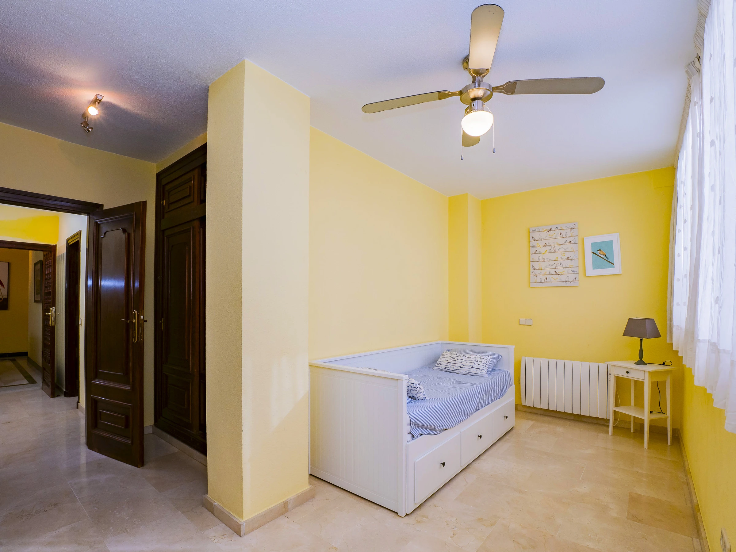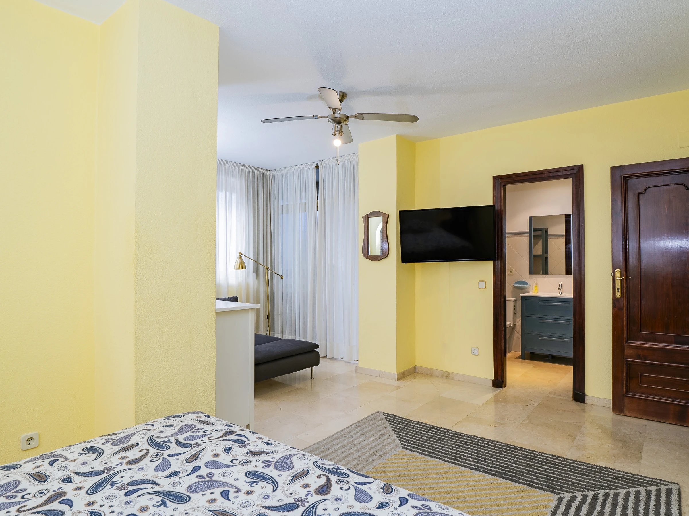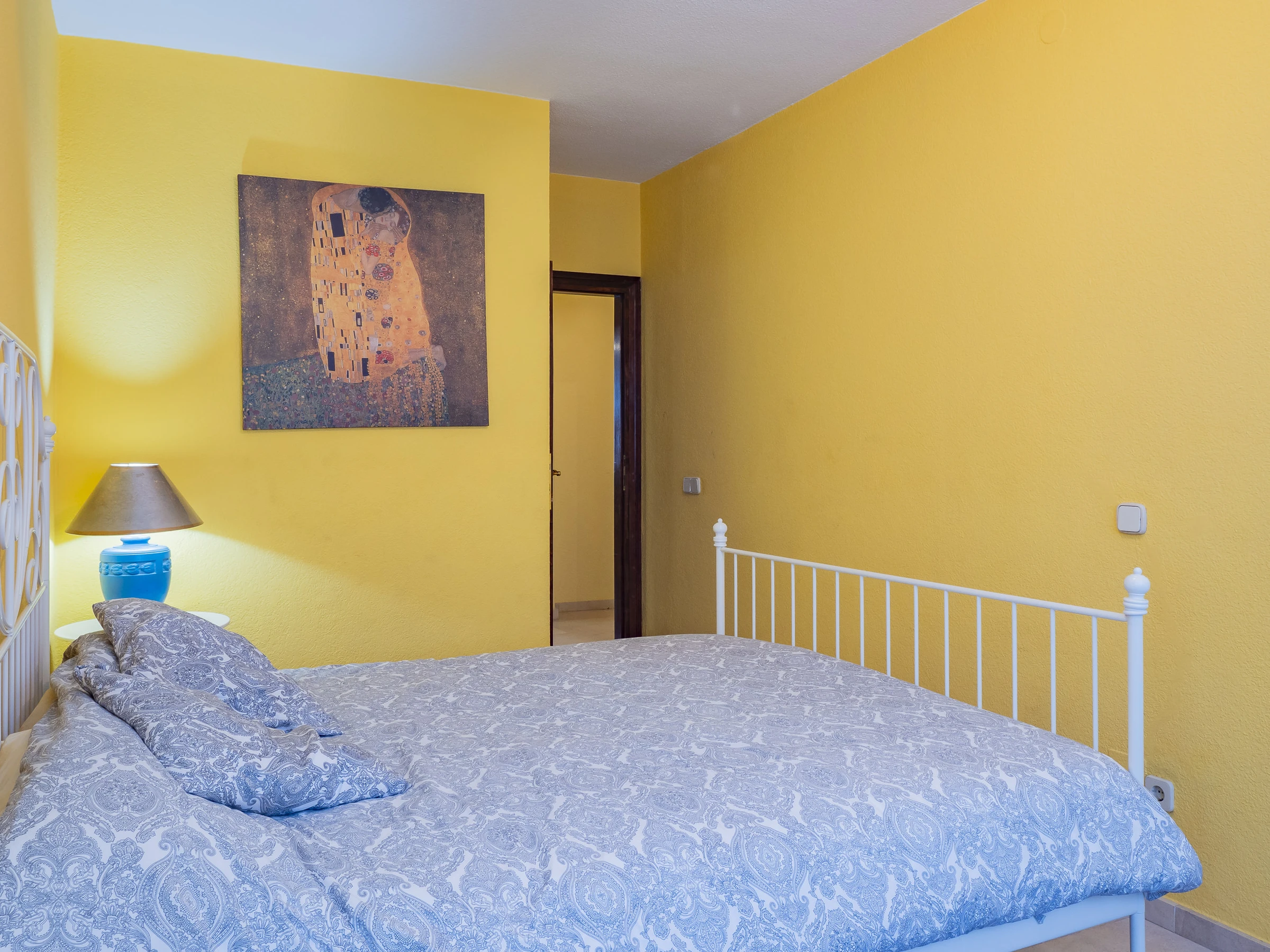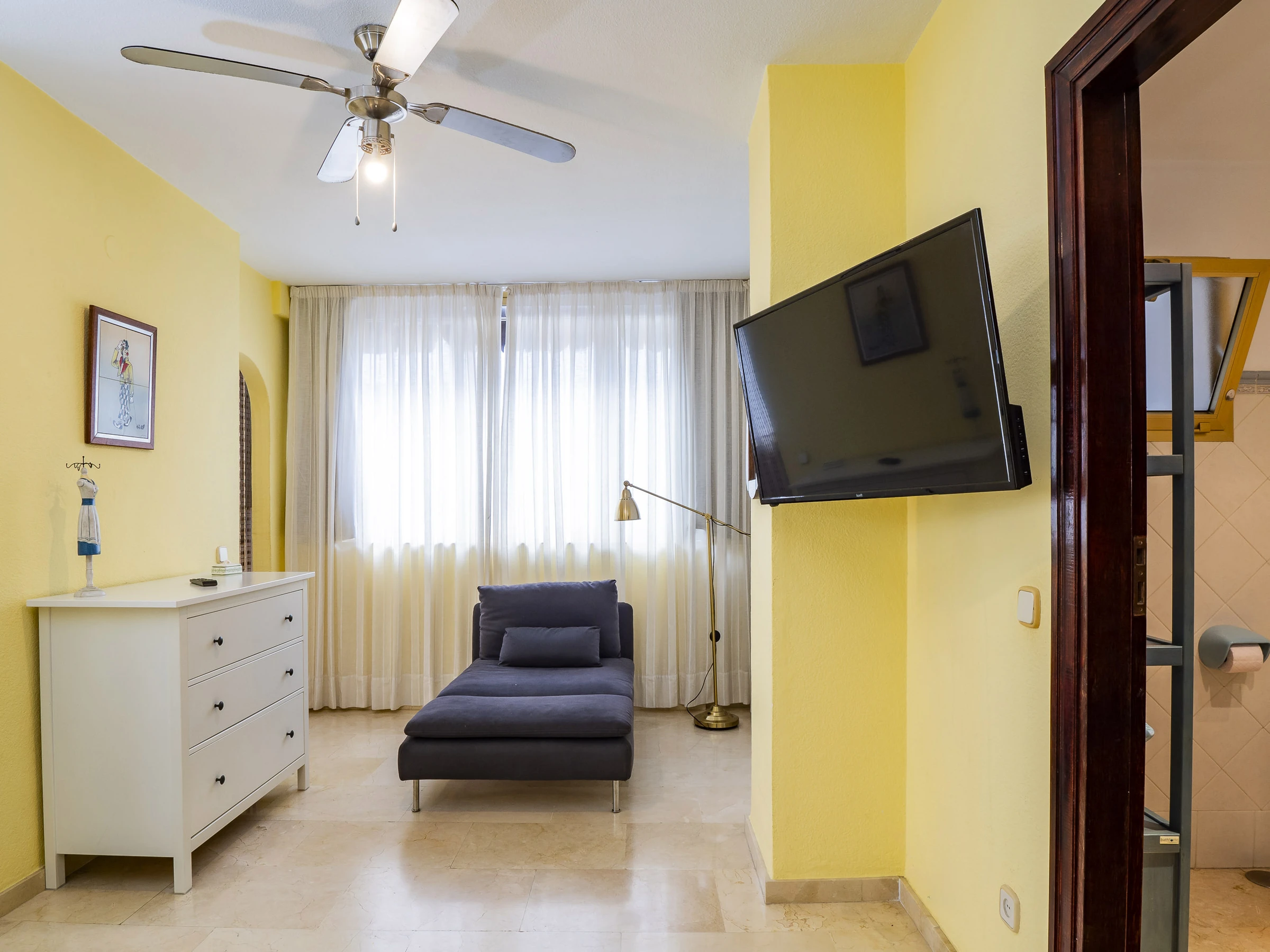 El apartamento cuenta con tres dormitorios: dos con camas de matrimonio y vestidor, uno de ellos con baño en suite con plato ducha 🚿, y un tercer dormitorio con cama nido que ofrece dos camas individuales. Hay un segundo baño con plato ducha y zona de lavandería cerca de las habitaciones. Además, el salón y algunos dormitorios disponen de aire acondicionado y ventiladores para tu confort.