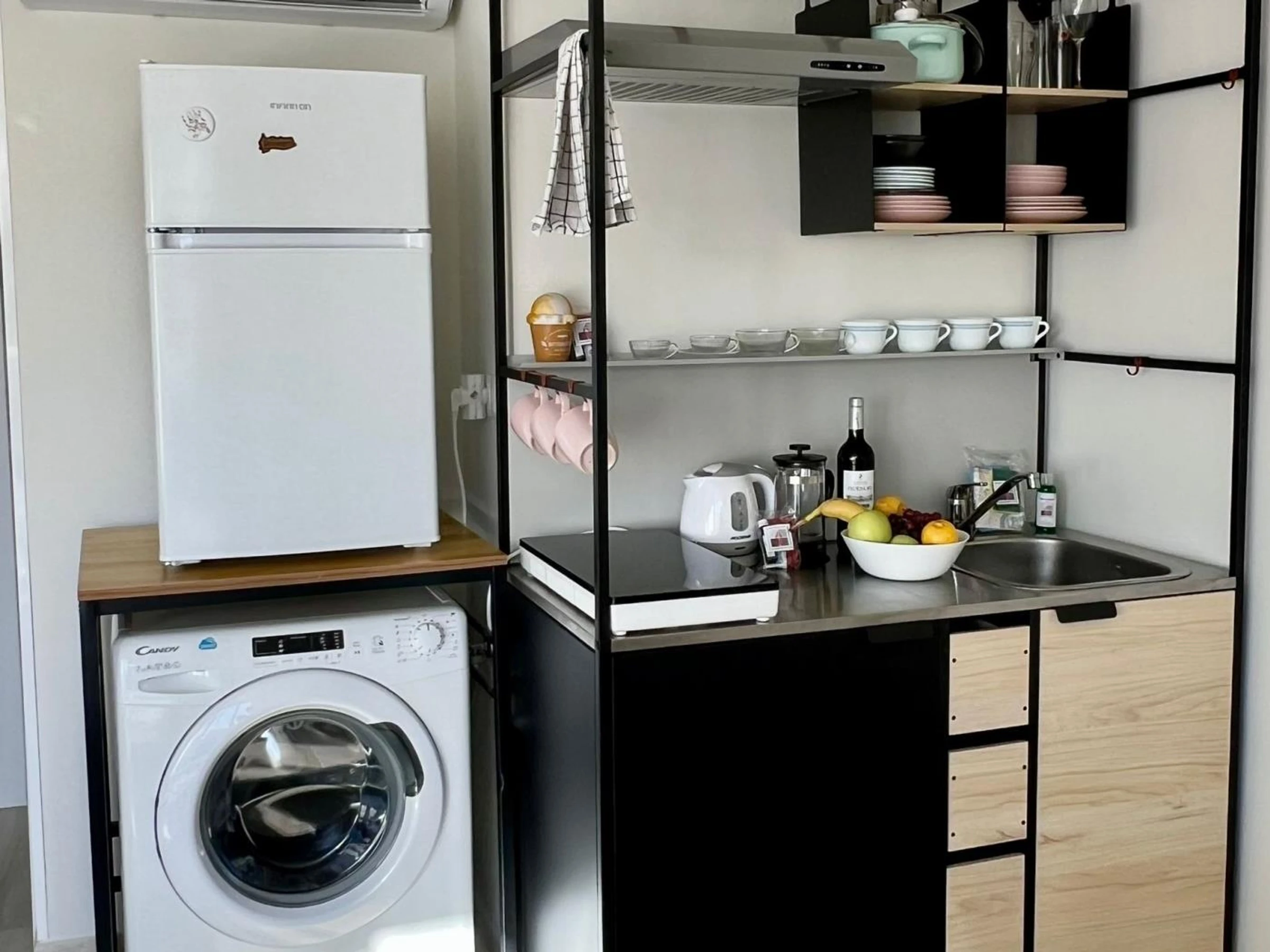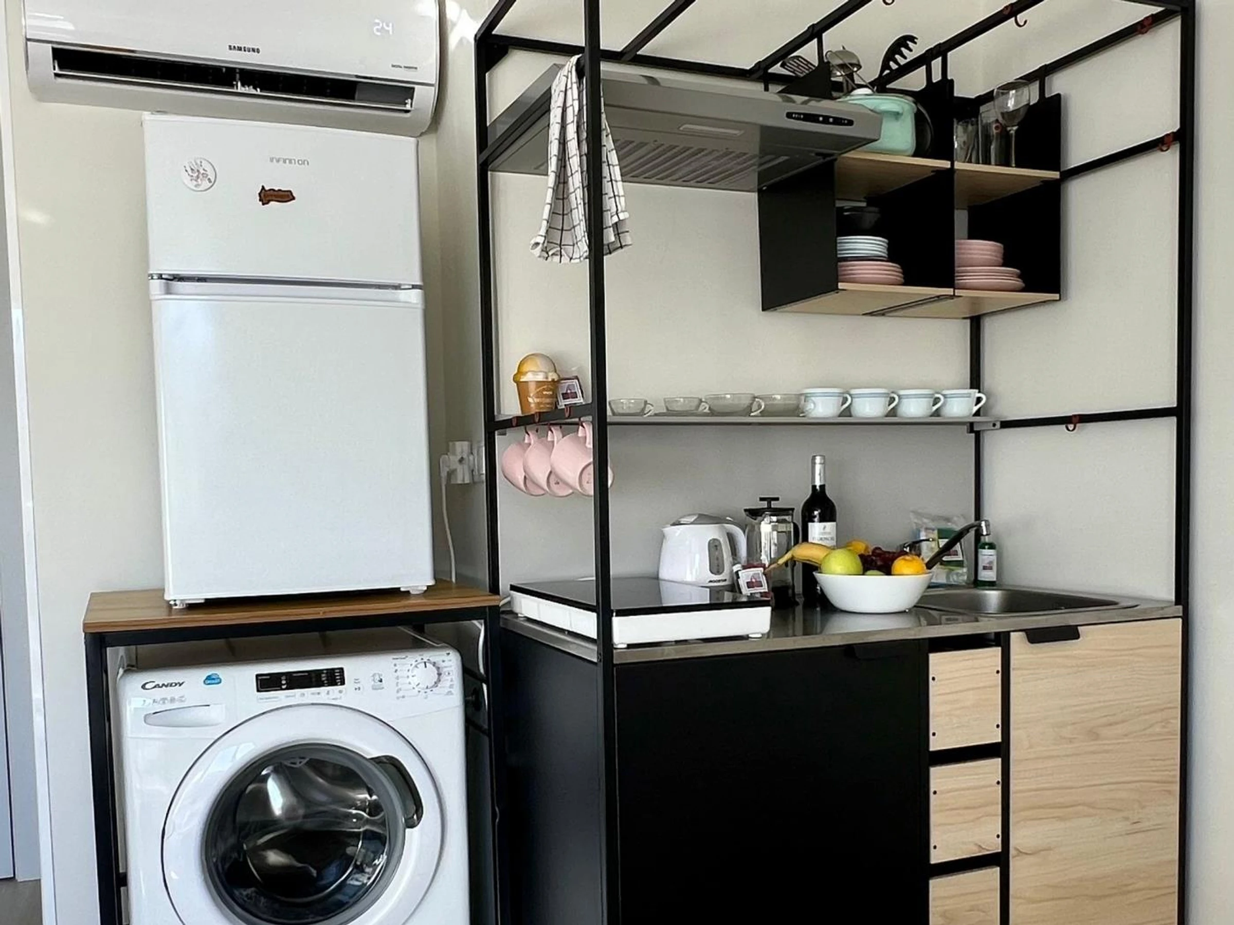 Cocina totalmente equipadacon microondas, fogones, nevera y lavadora