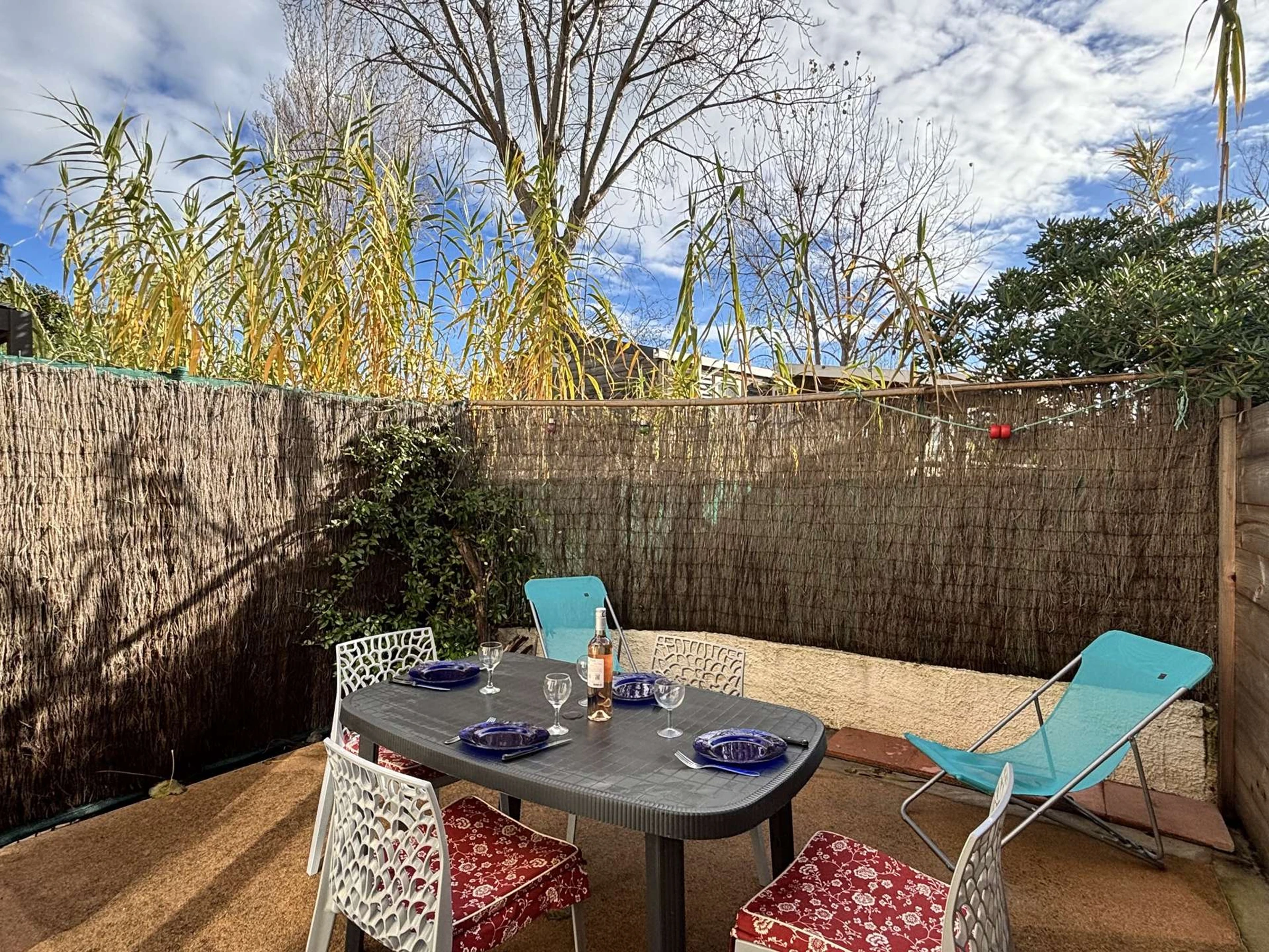 • Terraza con muebles de jardín, 2 tumbonas y sombrilla.