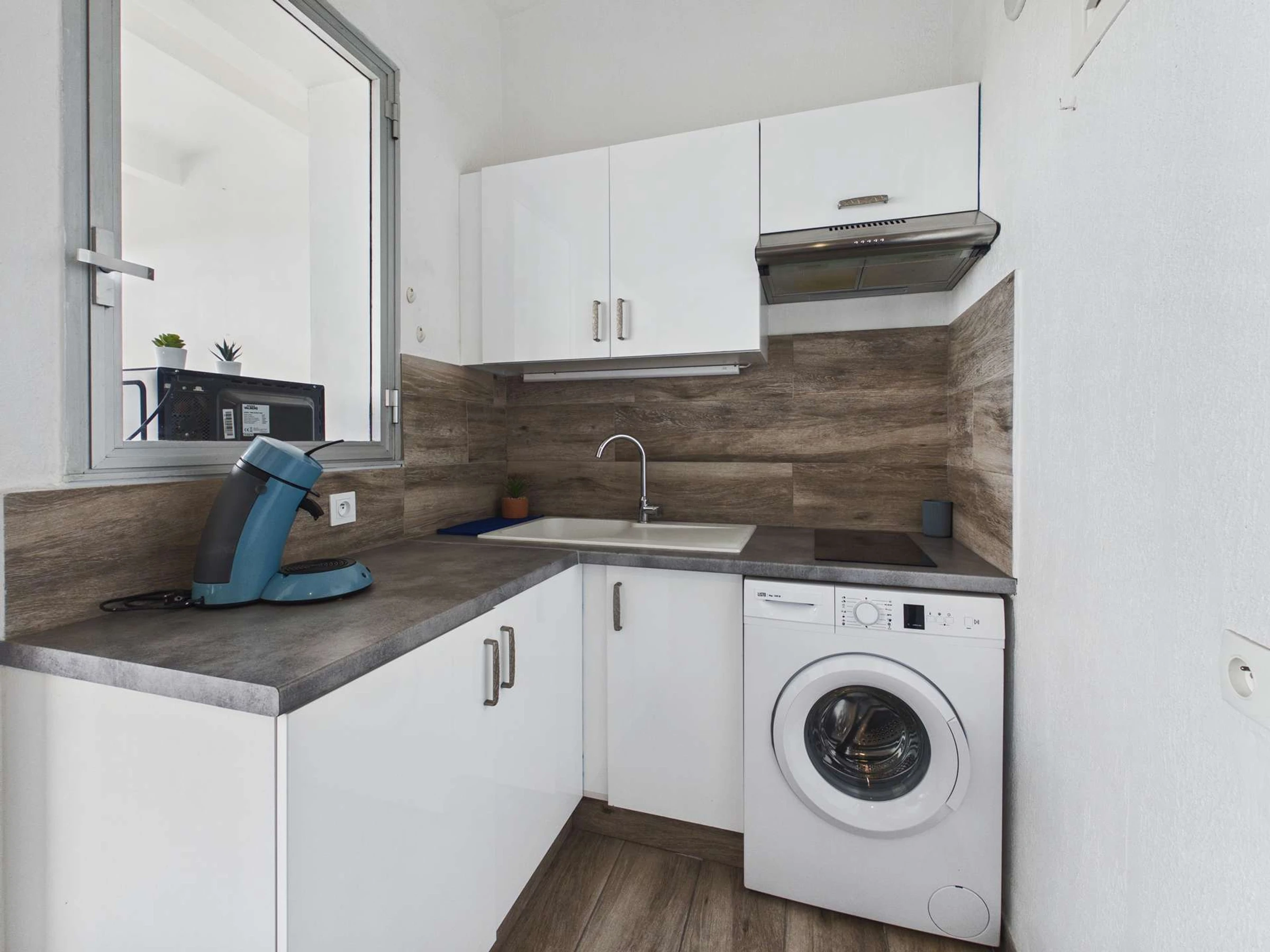 Cocina americana con placa eléctrica, microondas, nevera/congelador, mini horno y cafetera eléctrica.