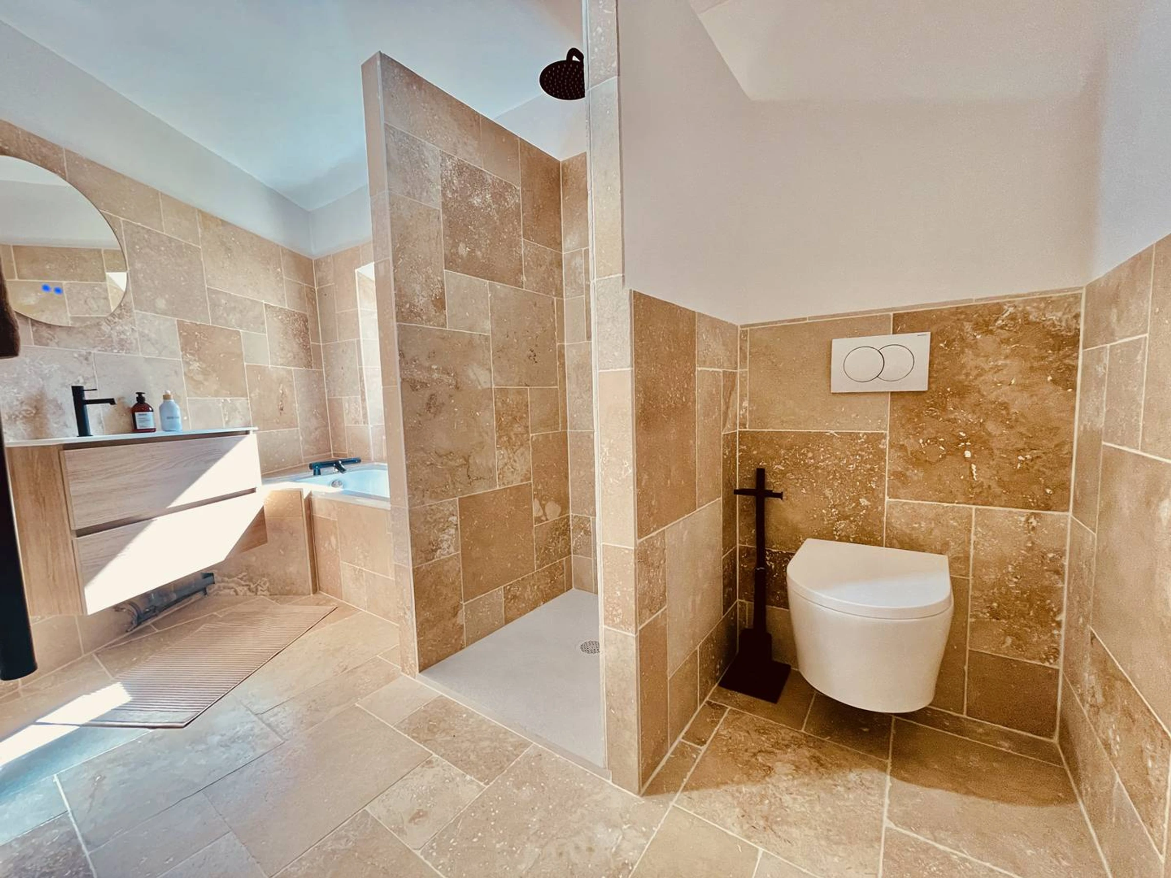 Cuarto de baño: ducha, bañera, lavabo, calentador de toallas y WC.