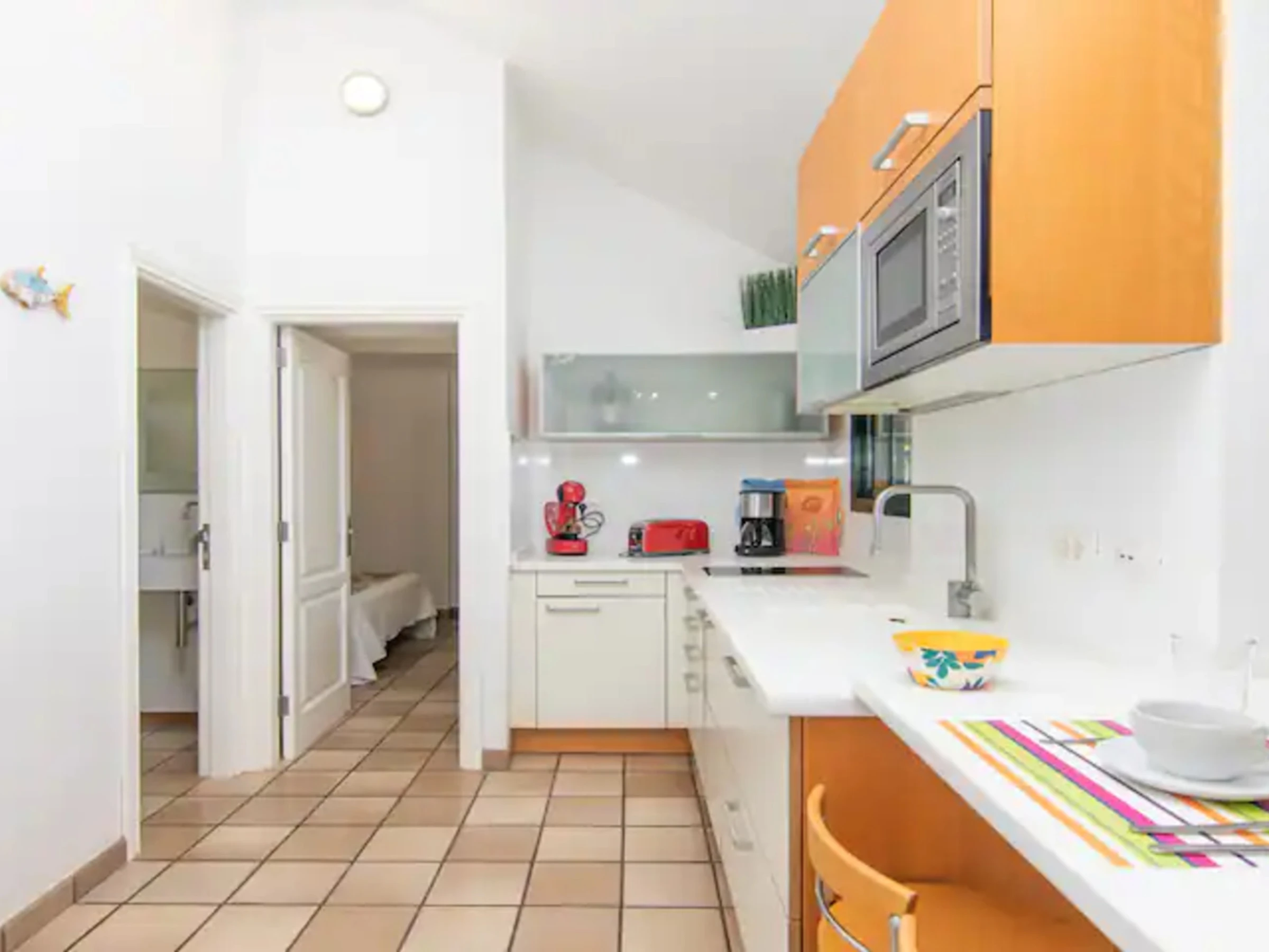 El apartamento cuenta con 2 dormitorios y 1 baño con ducha. La cocina americana está completamente equipada con nevera, congelador, lavadora, cafetera, horno, microondas, lavavajillas y todos los utensilios necesarios.