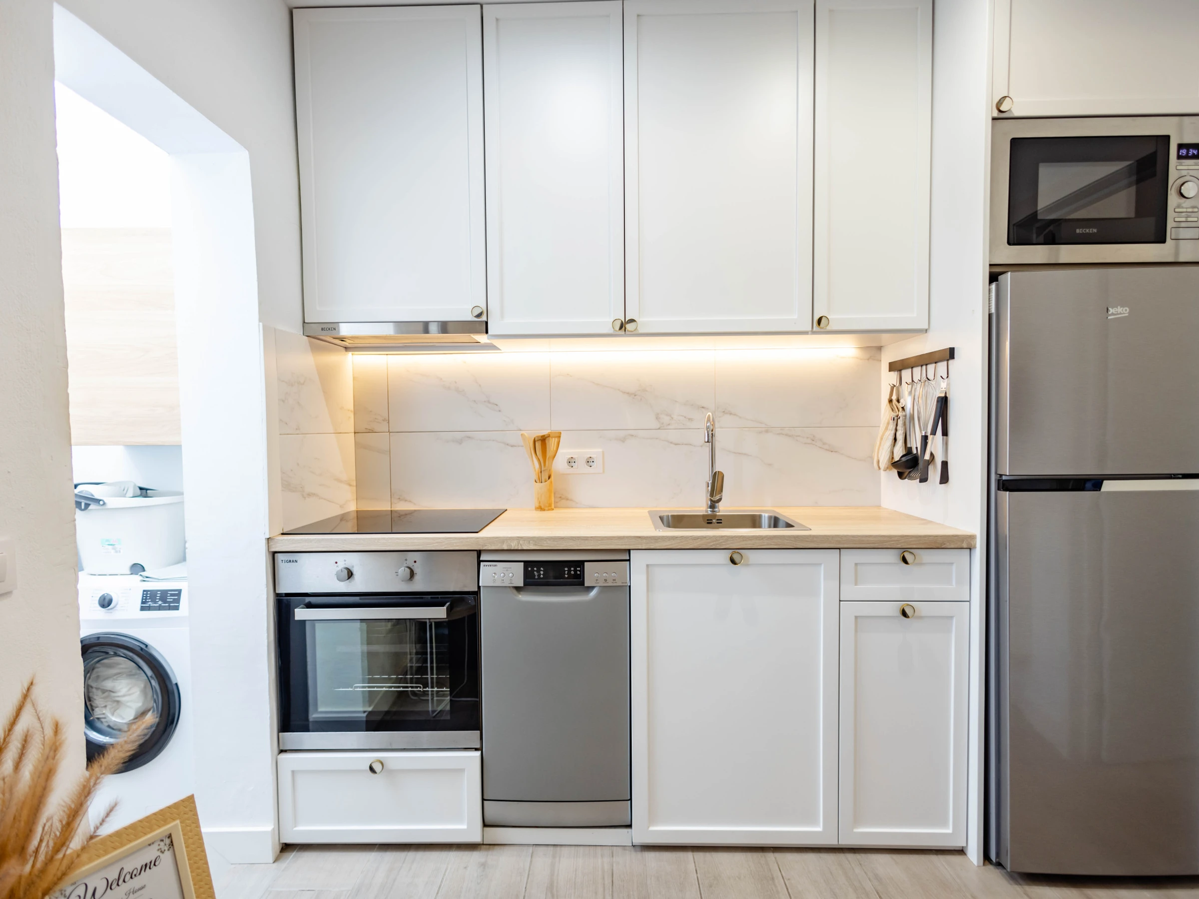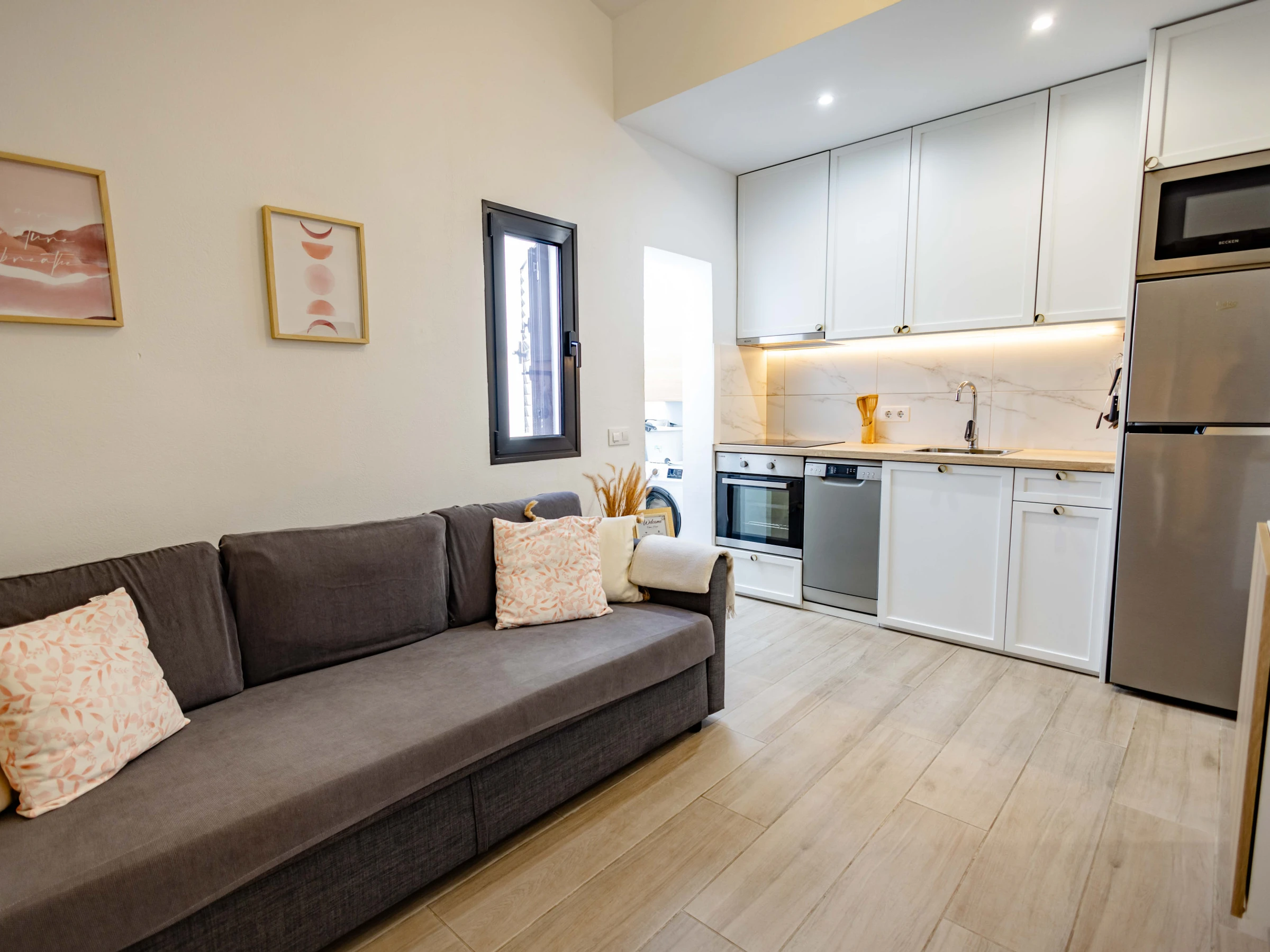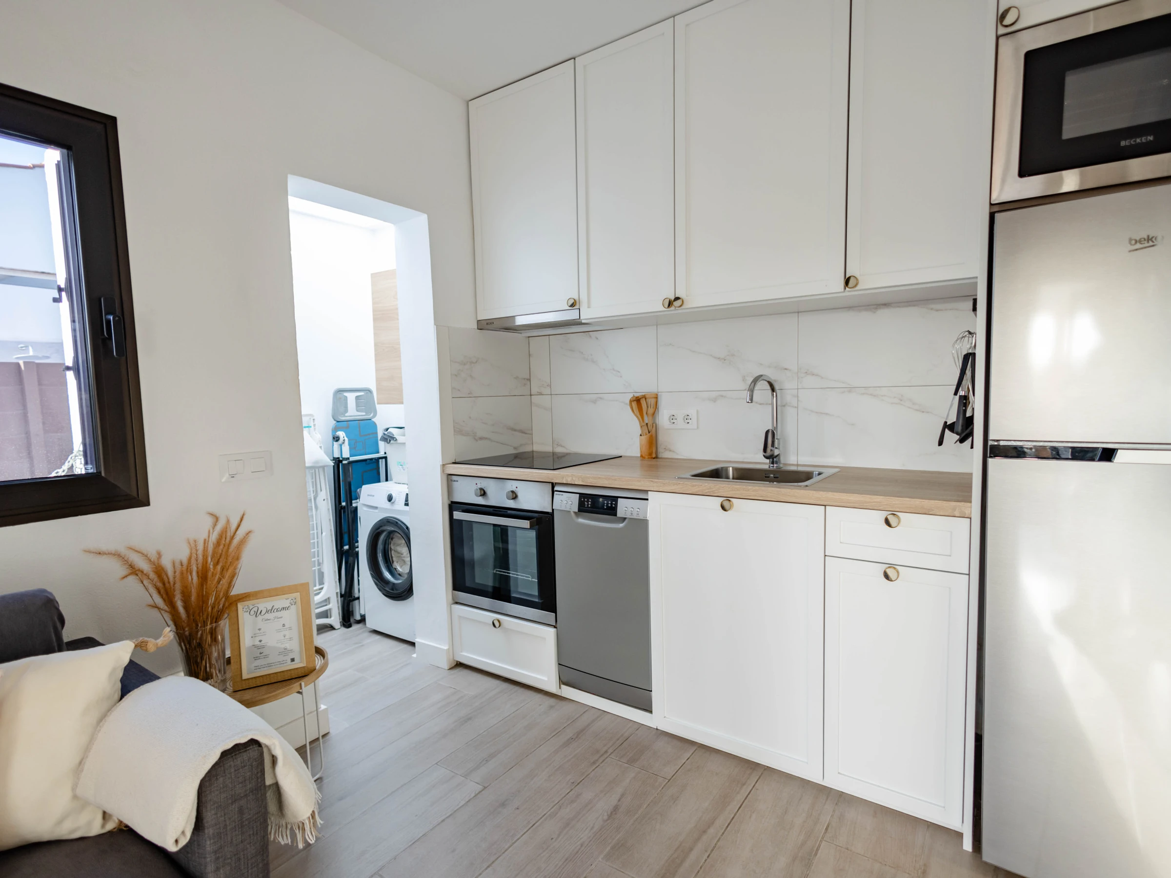 El apartamento cuenta con una cocina americana totalmente equipada, que incluye nevera, congelador, lavadora, cafetera, horno, microondas, lavavajillas y todos los utensilios necesarios. Además, dispone de una sala de estar con un cómodo sofá-cama doble y dos camas individuales, lo que permite alojar hasta 4 personas.
