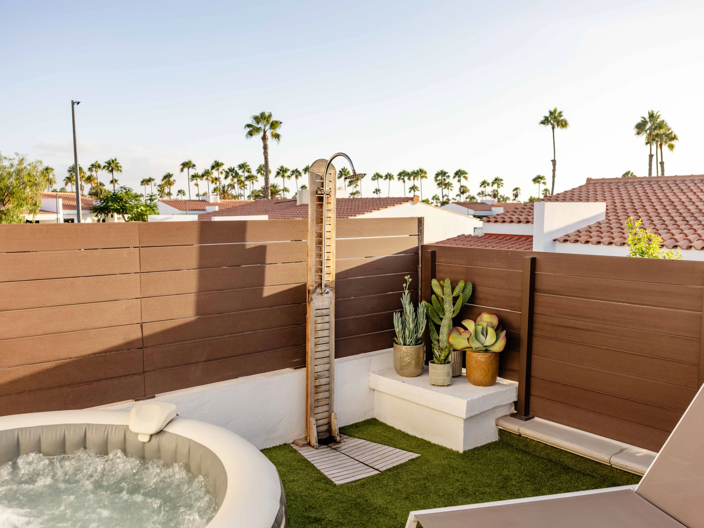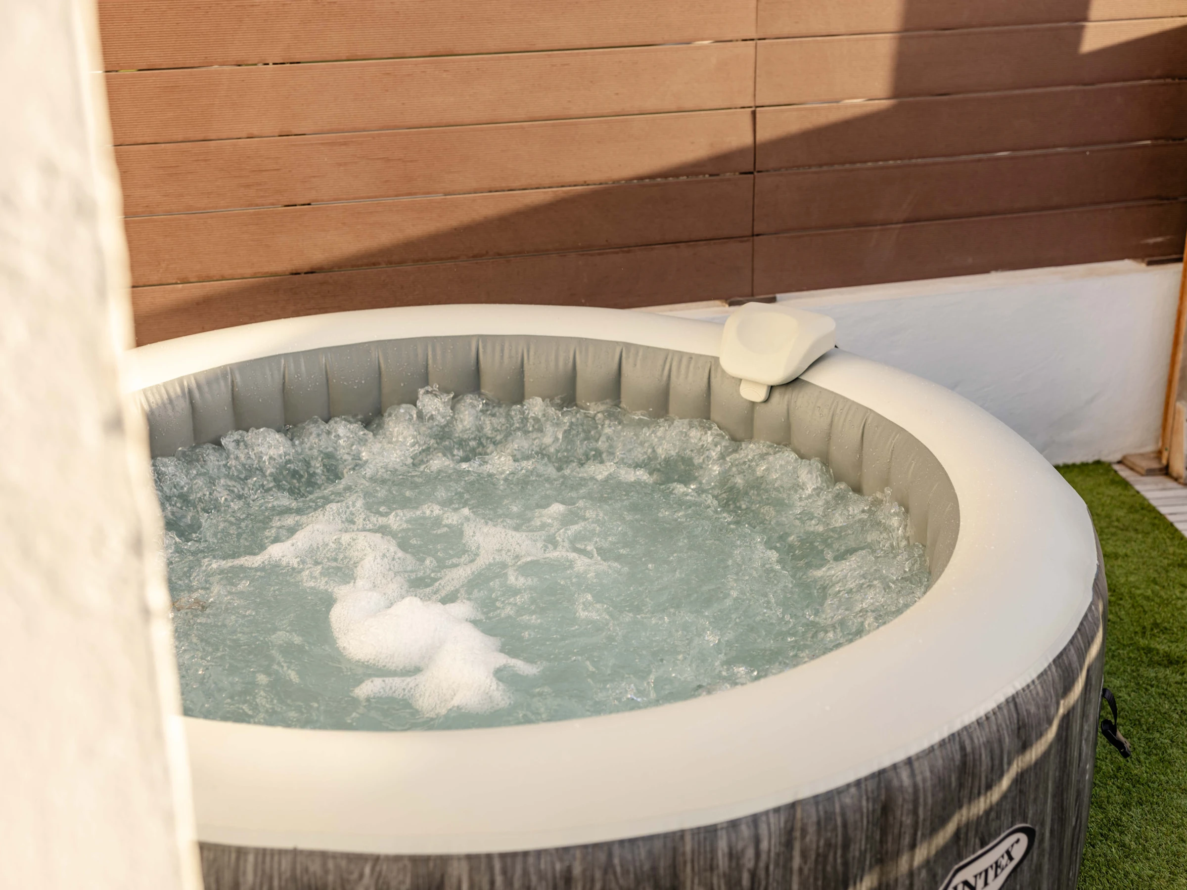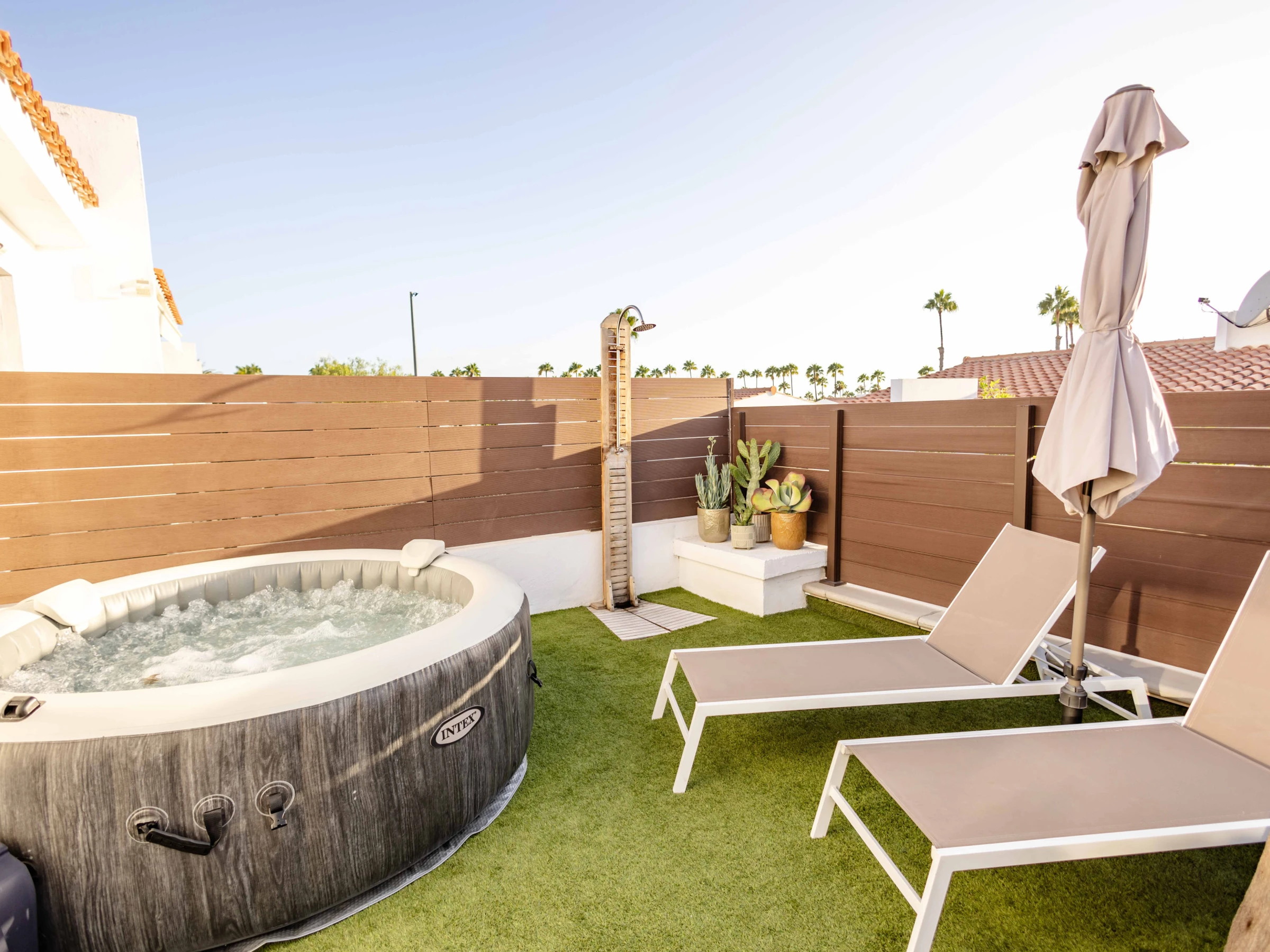 En el exterior, los huéspedes pueden disfrutar de una terraza privada amueblada, perfecta para relajarse o disfrutar de una comida al aire libre. Dispone además del Jacuzzi, de una ducha de exterior, barbacoa, tumbonas y una hamaca de tela. También tienen acceso a un jardín comunitario y una piscina compartida.