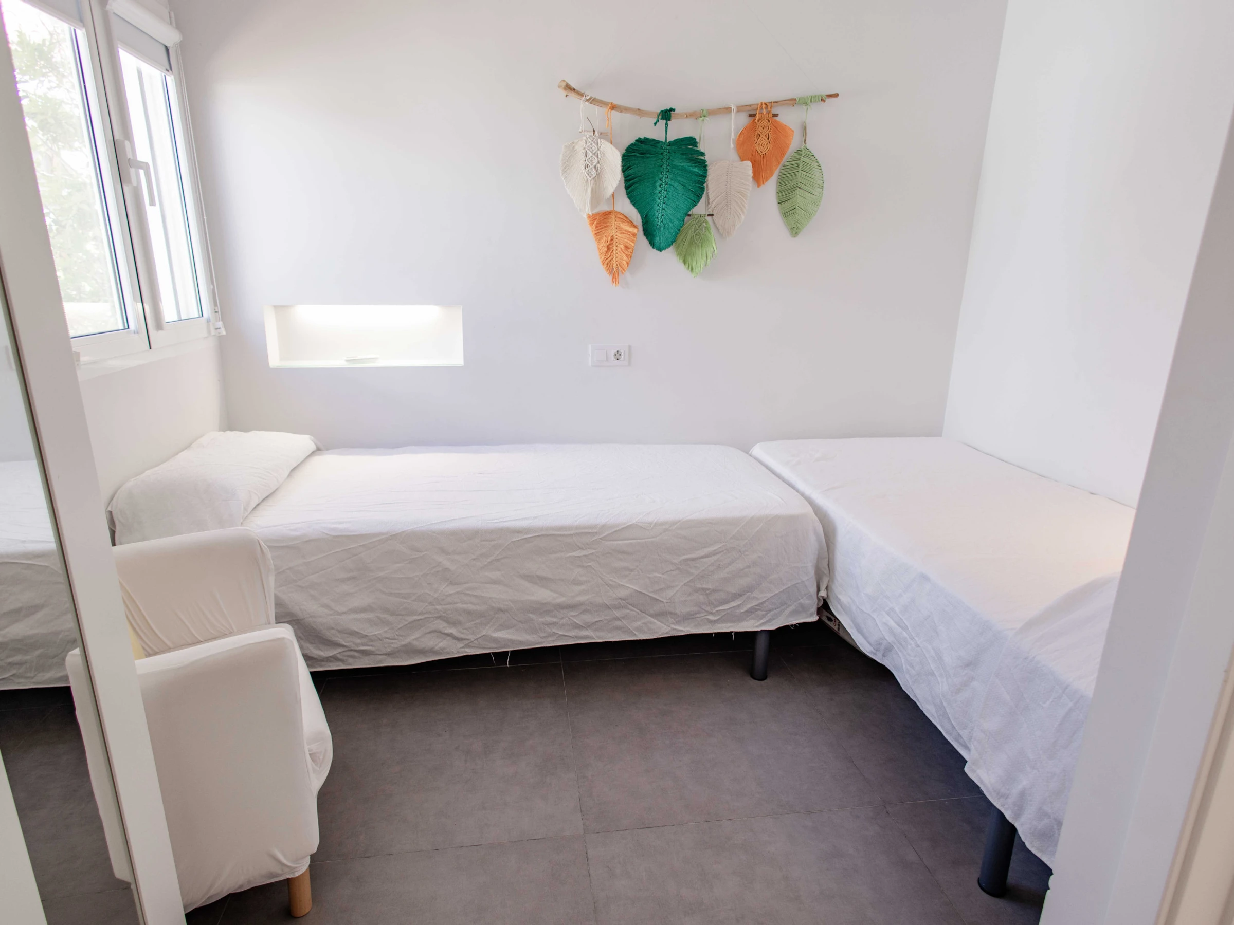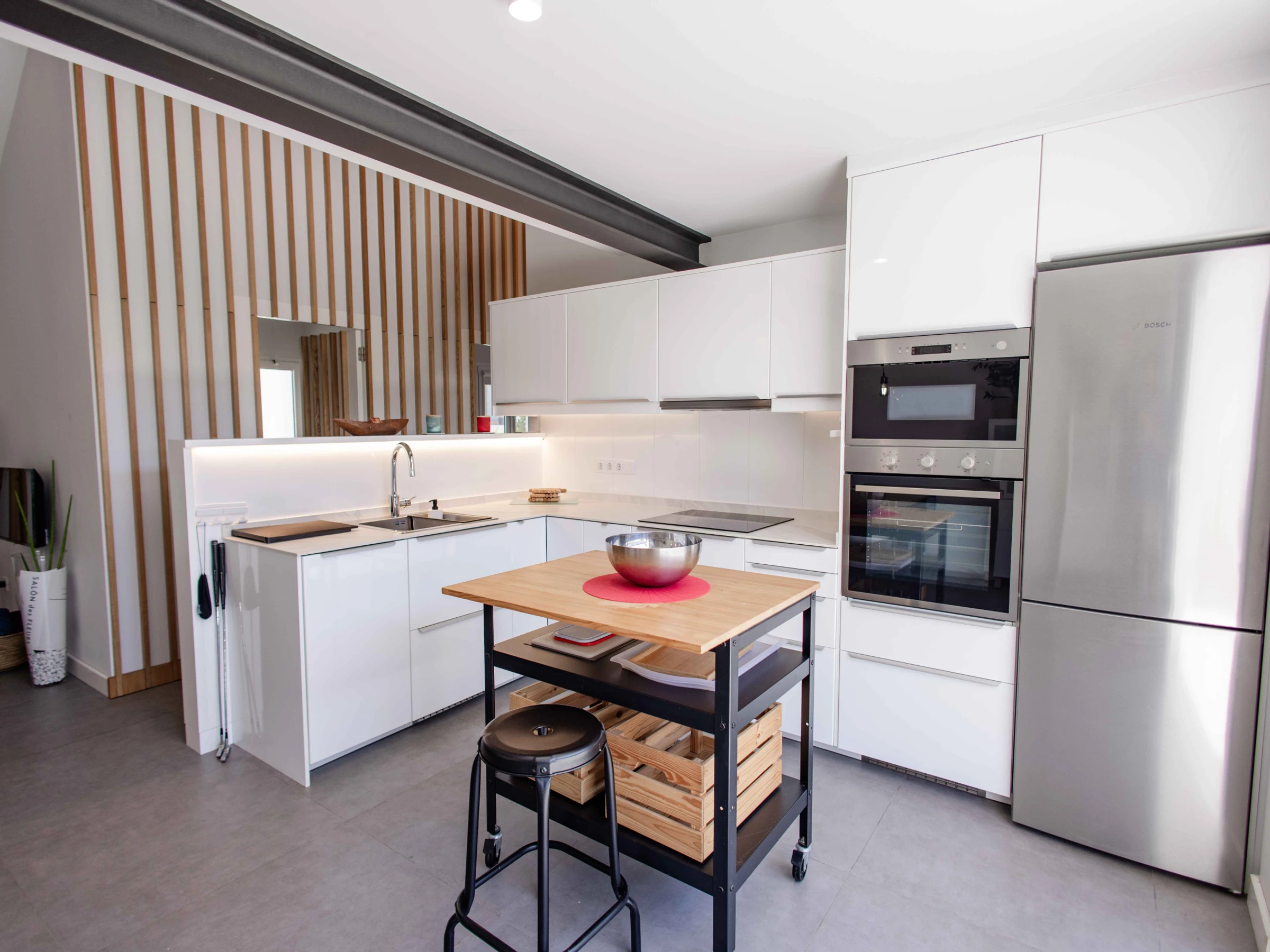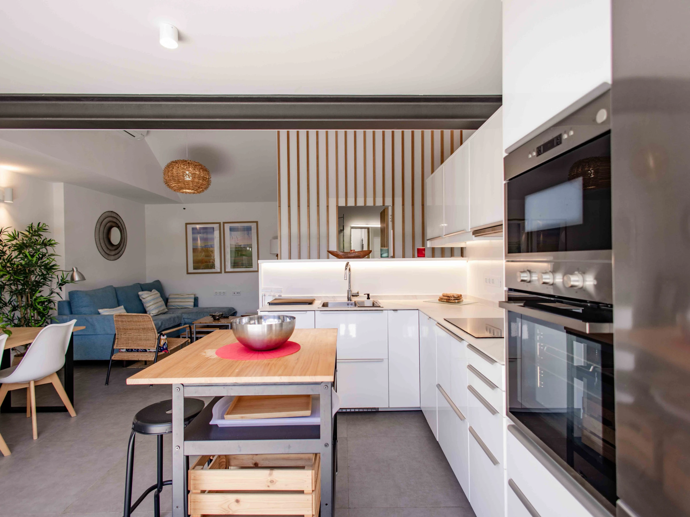 Dispone de dos dormitorios, cocina completamente equipada con nevera, congelador, cafetera, horno, microondas, lavavajillas y todos los utensilios necesarios para preparar comidas en casa; así como lavadora en el cuarto de baño.