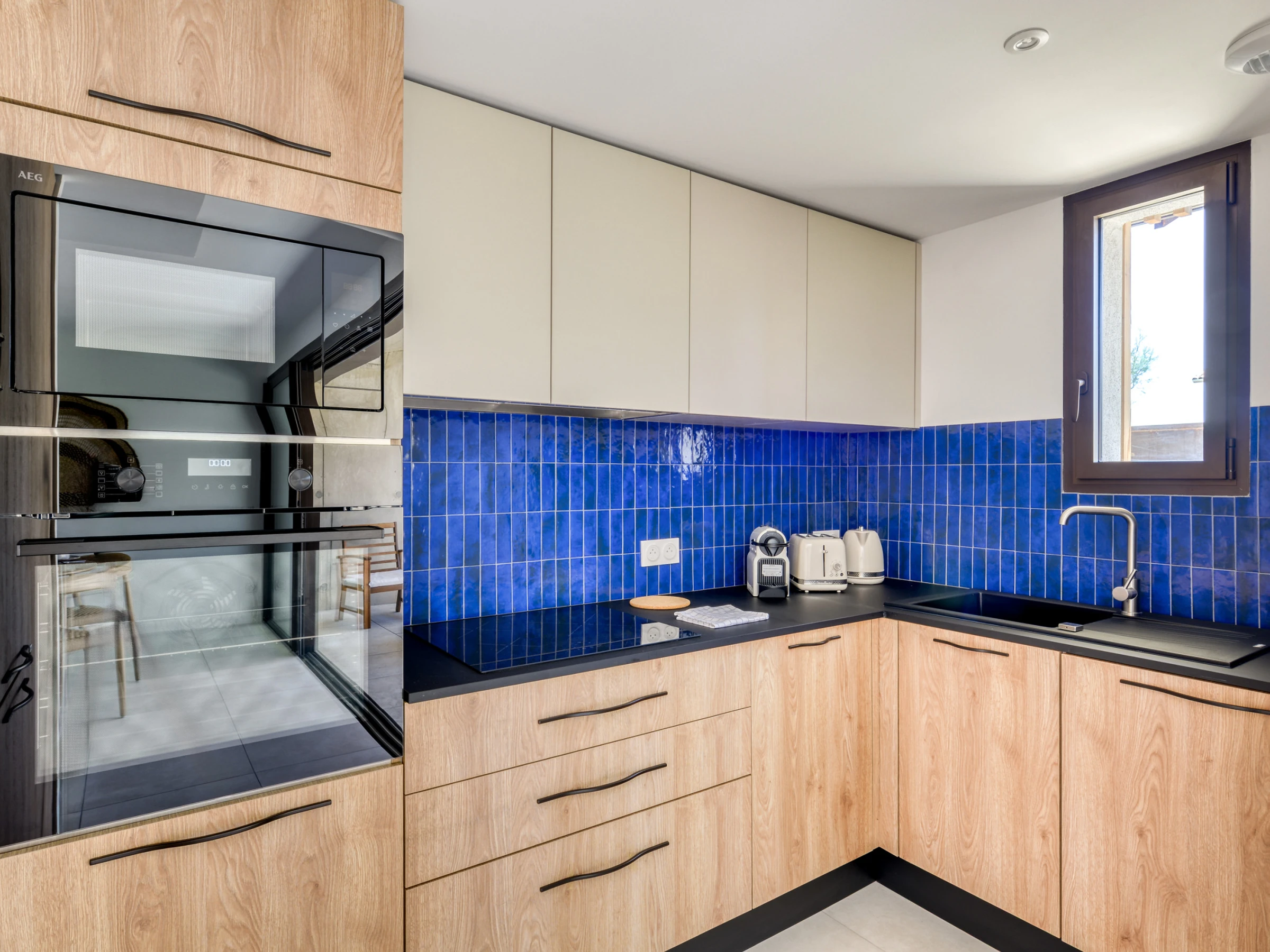 Cocina equipada con materiales elegidos, placa vitrocerámica, refrigerador, congelador, lavavajillas de gran capacidad, horno, microondas, numerosos utensilios de cocina.
