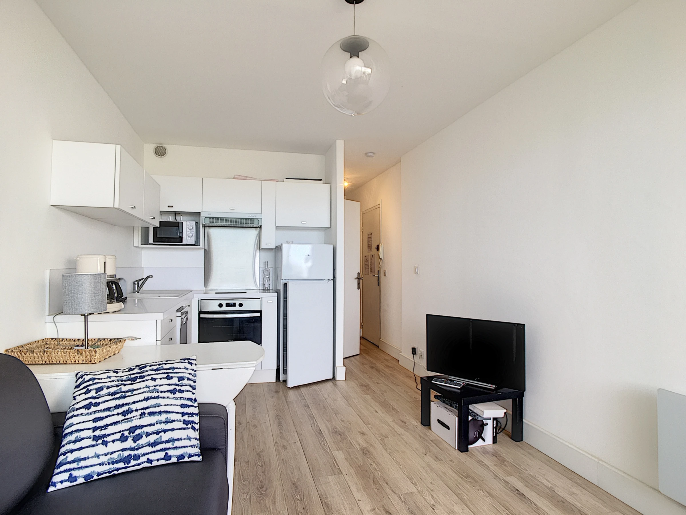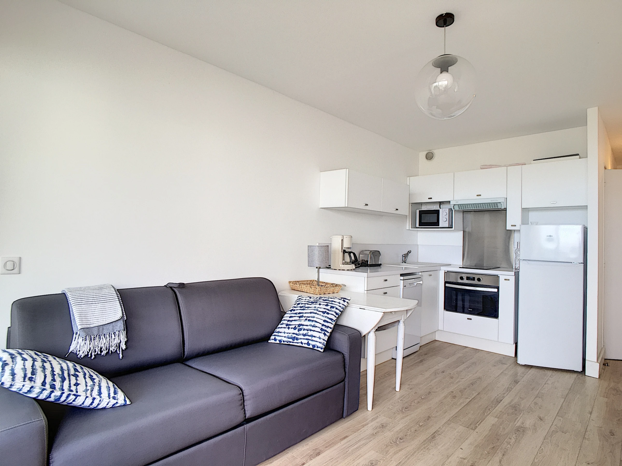 Alquiler por temporada, Muy linda Cabaña Estudio con todas las comodidades recientemente renovada y equipada para 4 personas. Situado en la planta baja de una residencia en la playa, orientado al este, se beneficia de una agradable vista al mar. Consta de un hermoso salón con cocina americana totalmente equipada, un sofá cama, un camarote con cama de 140 cm, un baño con ducha y un aseo.