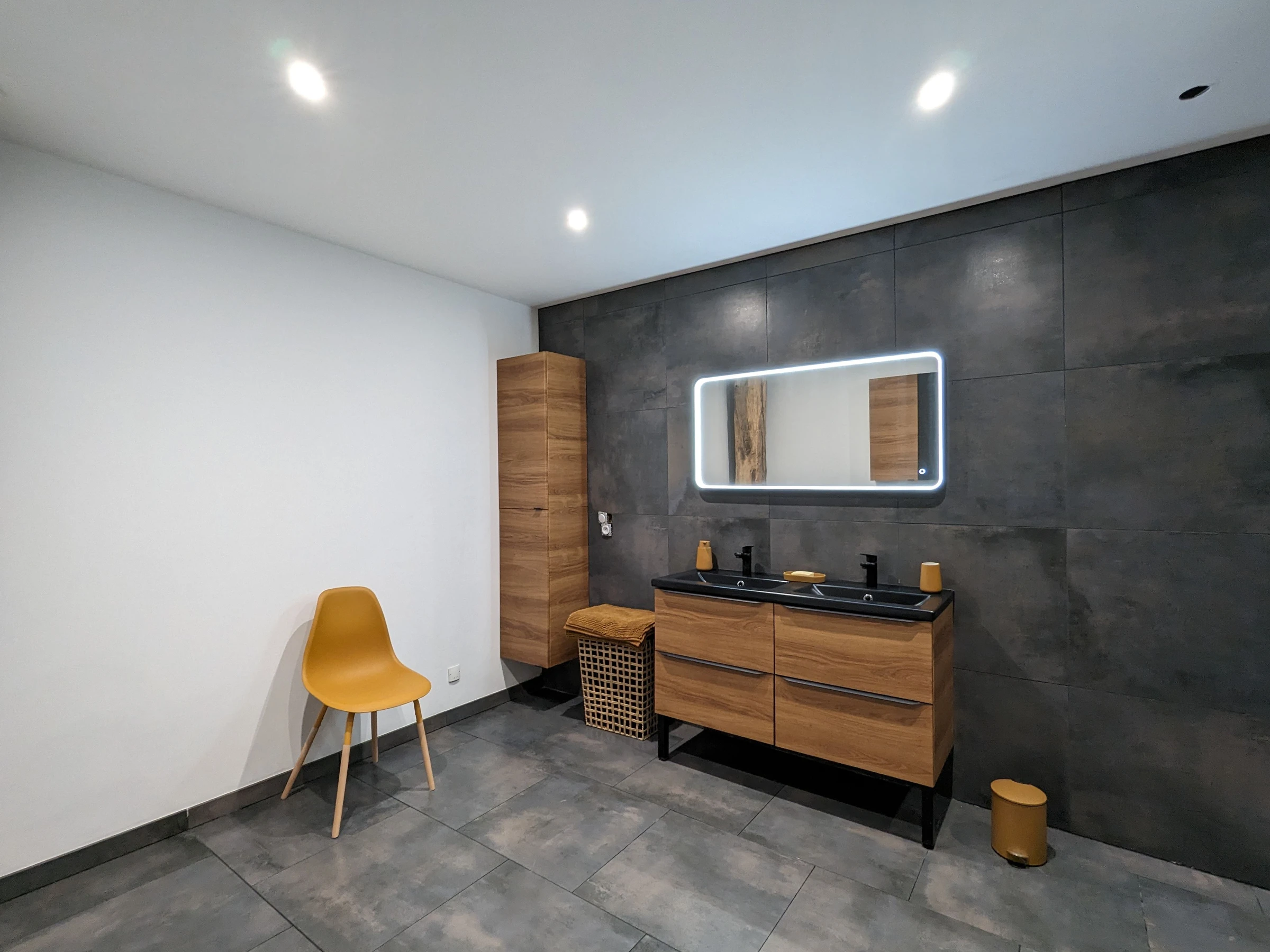 - Una gran entrada y zona de relajación de 50 m², un baño con ducha a ras de suelo, un aseo independiente, un dormitorio de 25 m² y un gran salón con cocina abierta y equipada, salón y comedor que dan a una terraza y gran jardín.