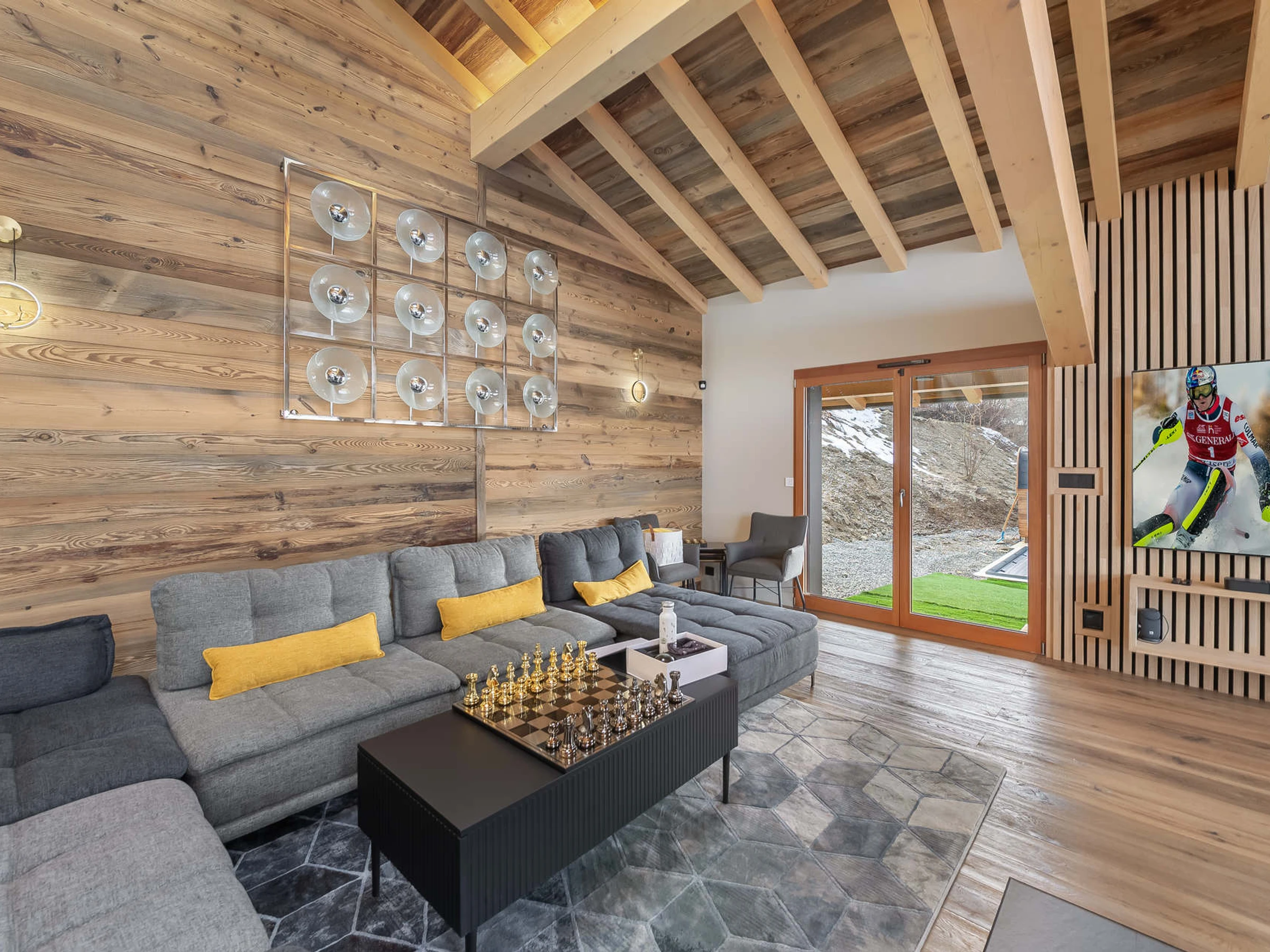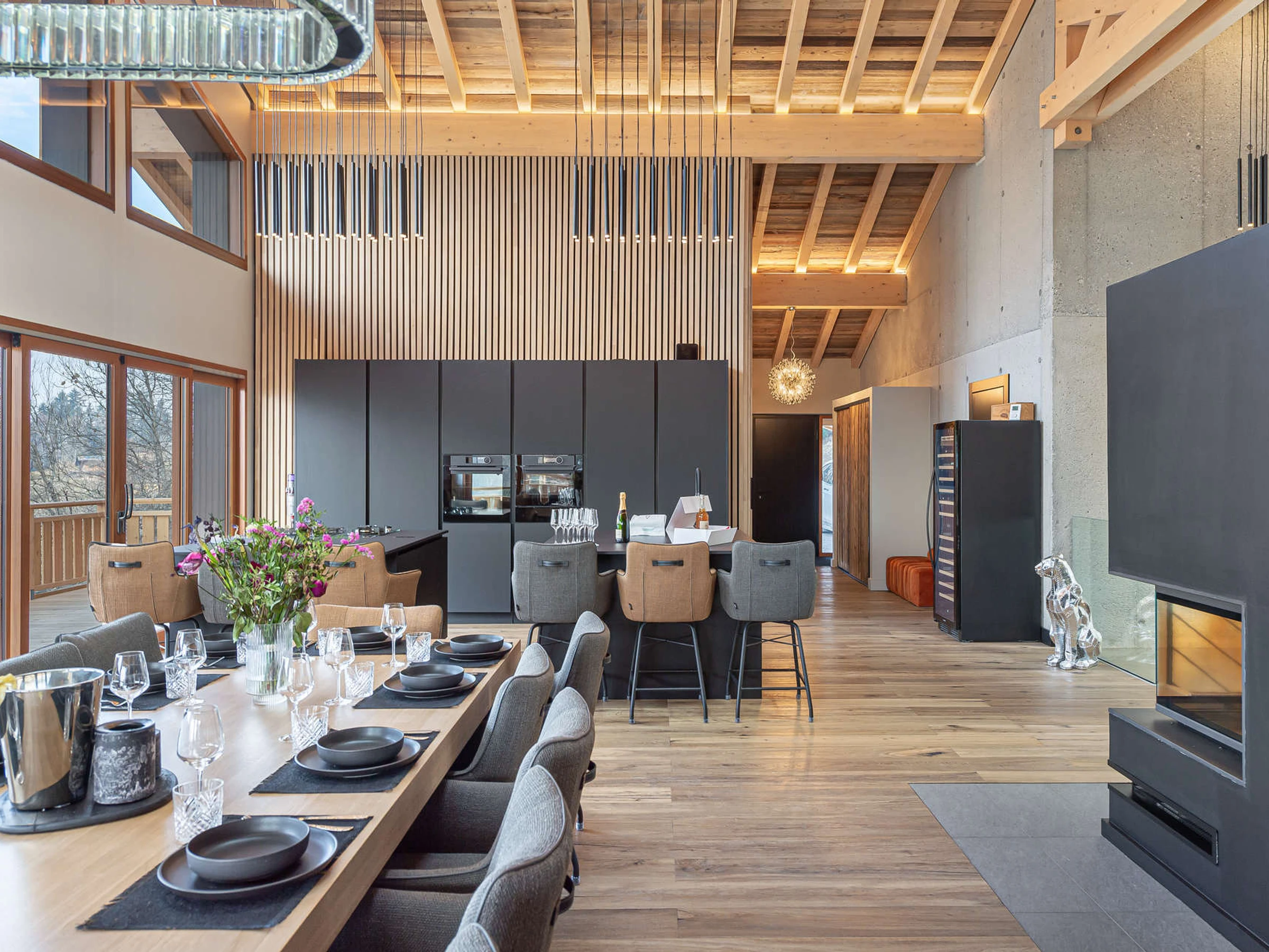 En un ambiente elegante que combina madera con toques escandinavos, el salón se organiza alrededor de una chimenea central y da a un balcón con vistas a Le Jaillet y Megève.