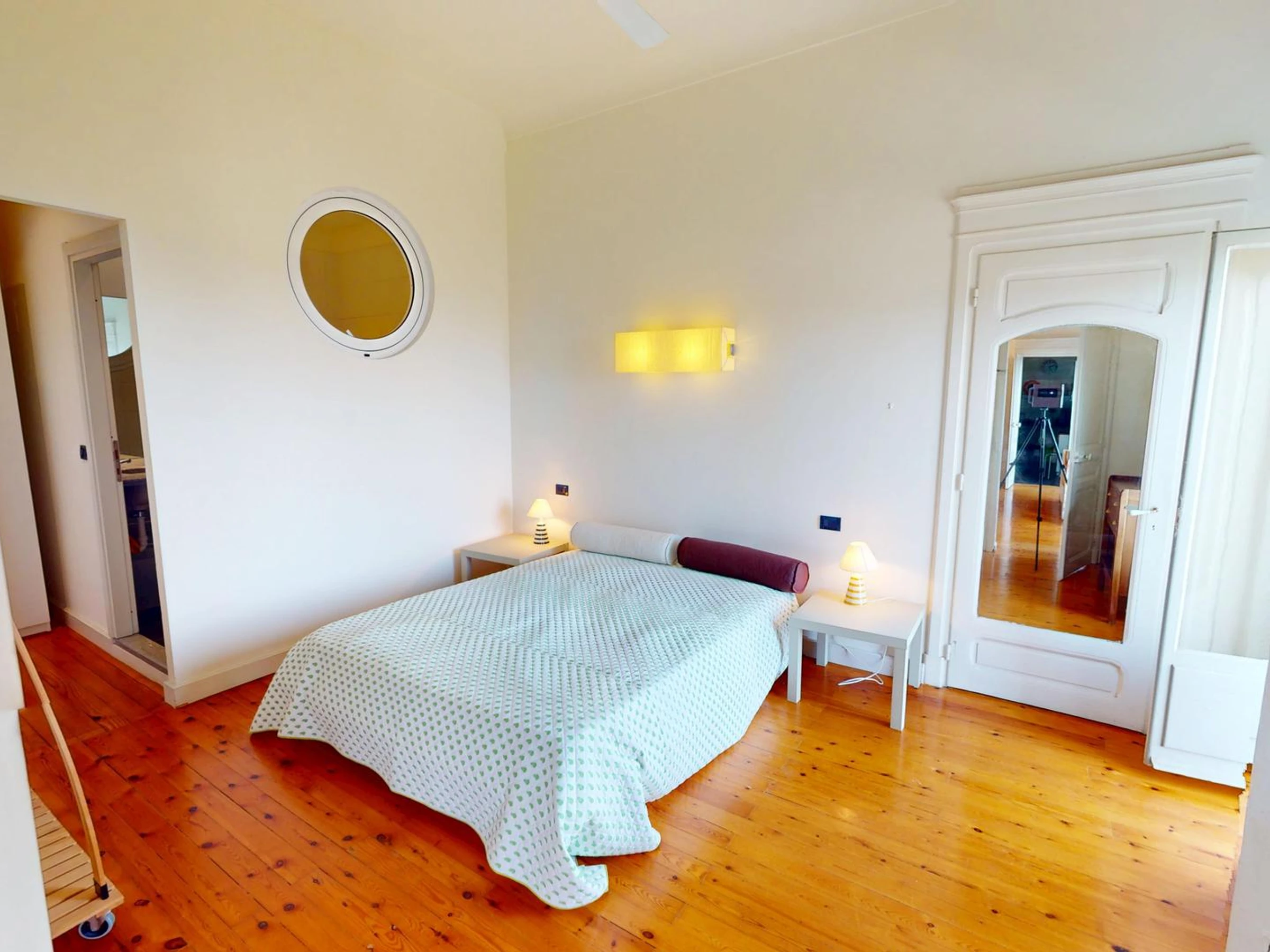 Un amplio dormitorio con una cama doble de 140 x 190 cm y armarios.