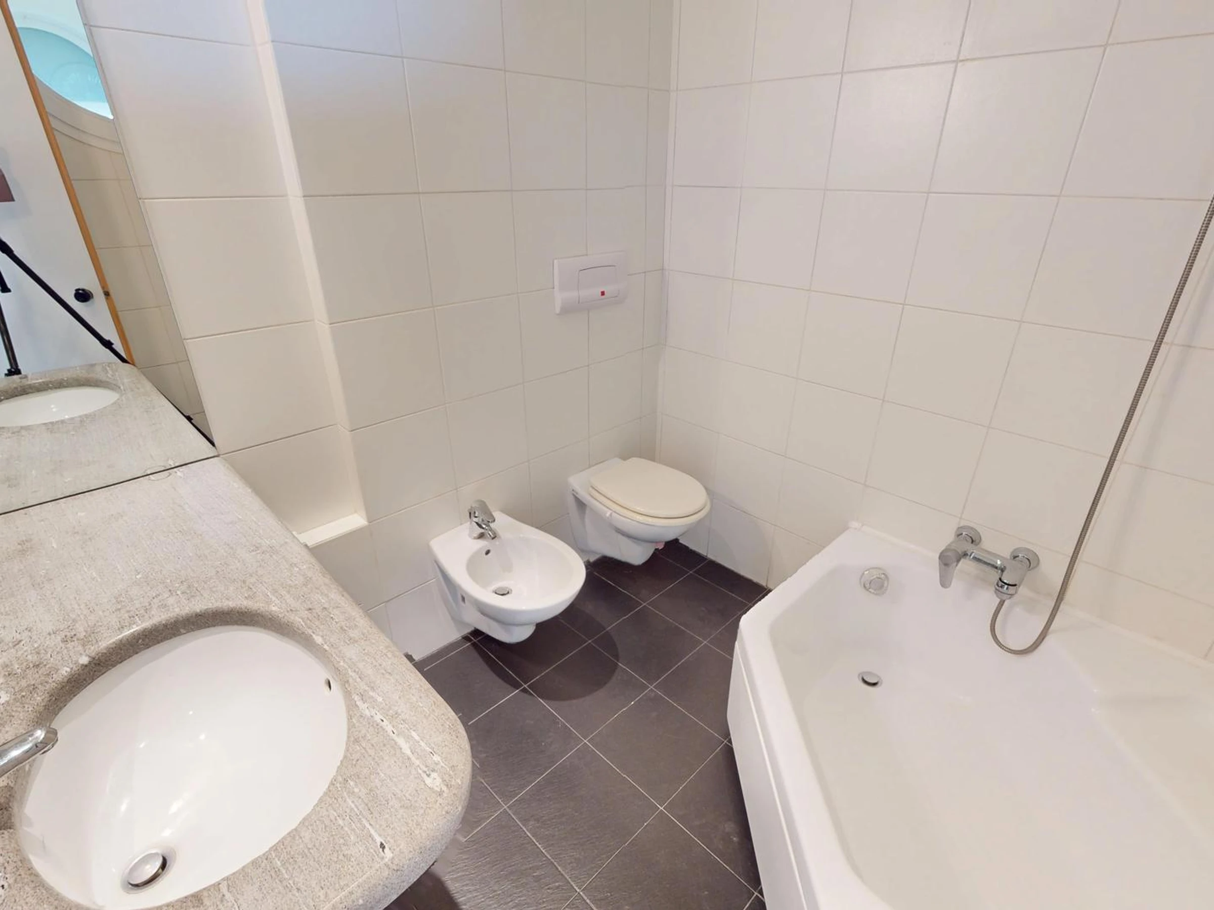 El segundo baño incluye lavabo, ducha a ras de suelo, inodoro y bidé.