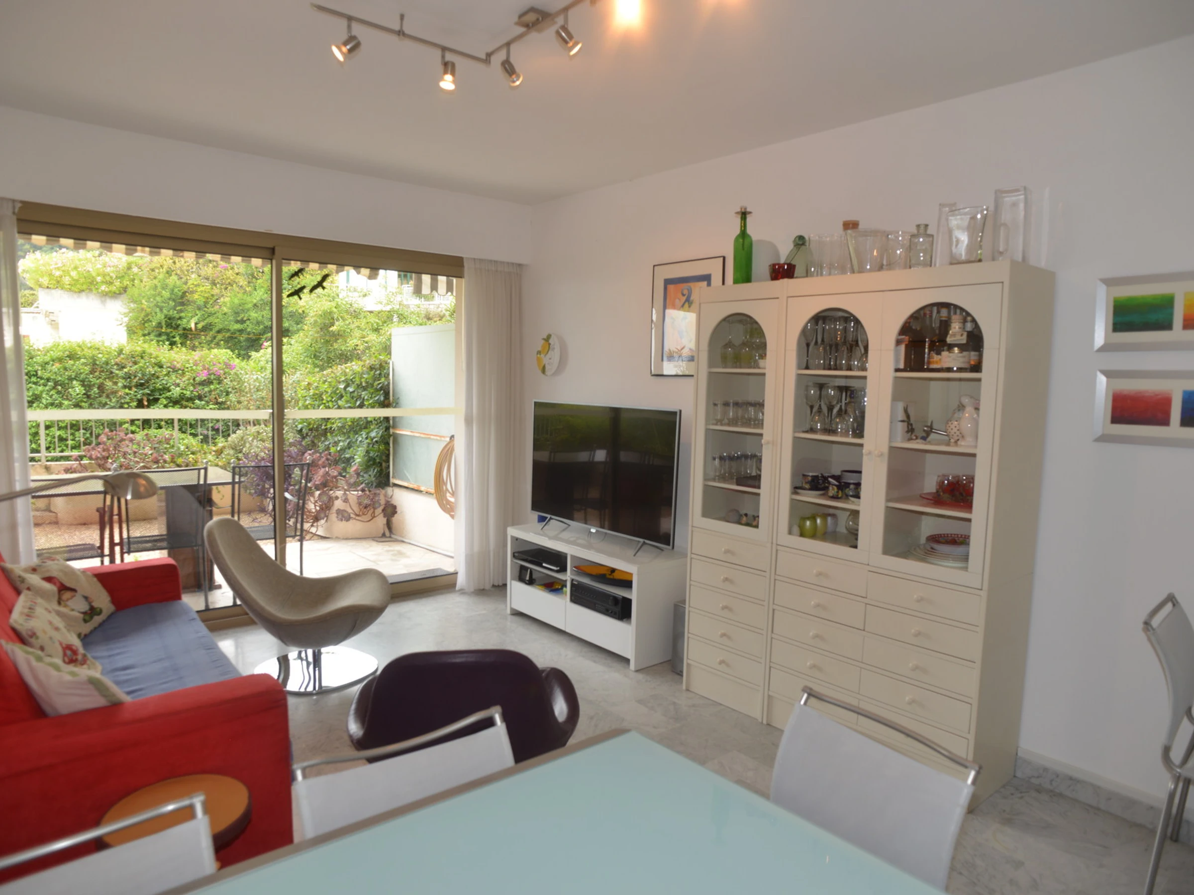 Agradable y espacioso apartamento de 2 dormitorios a nivel de jardín, con una amplia y tranquila terraza y vistas al mar, en una residencia con piscina en las alturas del barrio residencial de Garavan en Menton, cerca de la frontera con Italia.