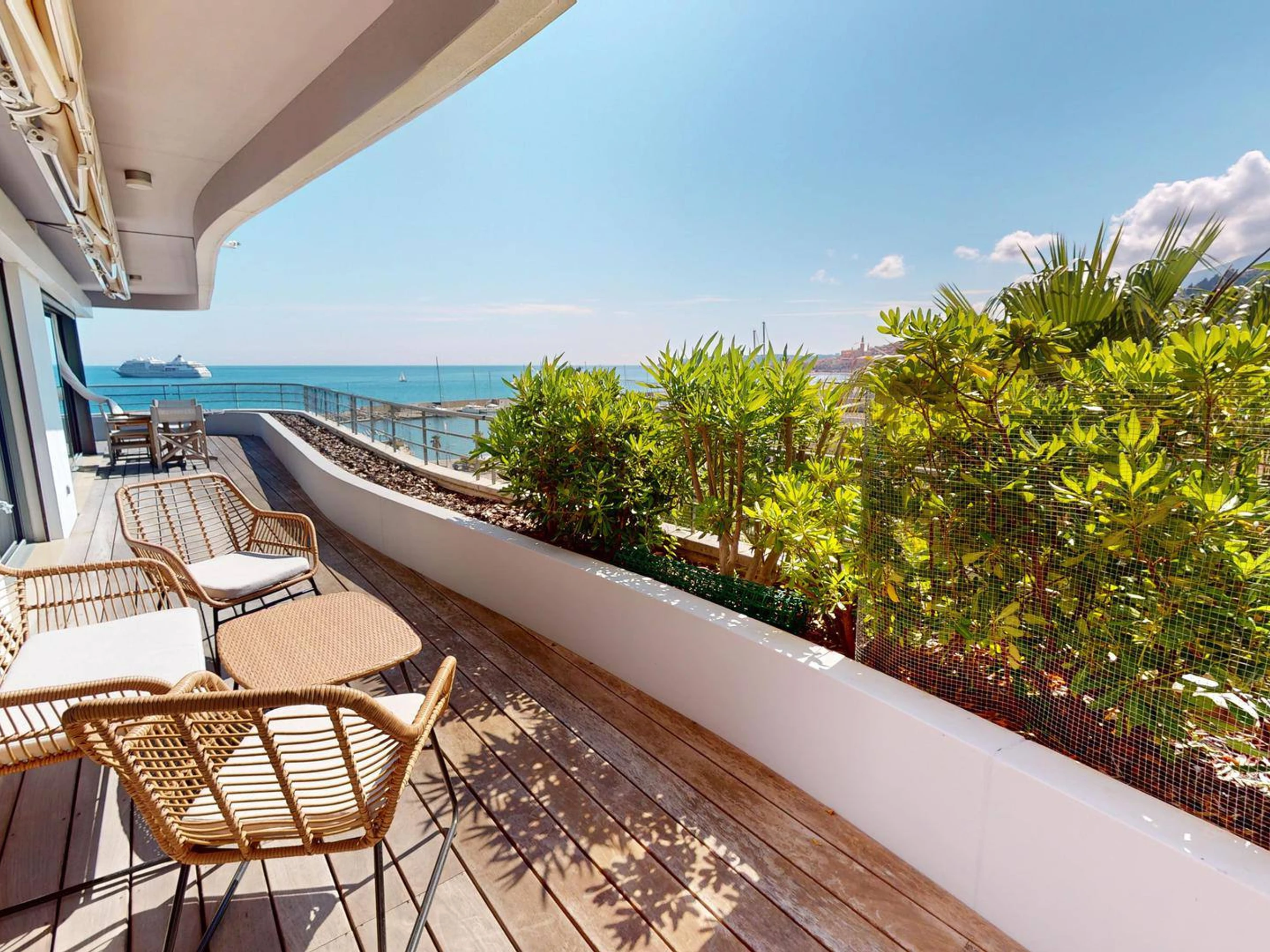 La agencia inmobiliaria GIOTTO le ofrece este magnífico y amplio apartamento de 3 habitaciones con aire acondicionado en el último piso con una gran terraza de 46 m² sobre el mar, una hermosa vista del casco antiguo de Menton y estacionamiento privado en el sótano.