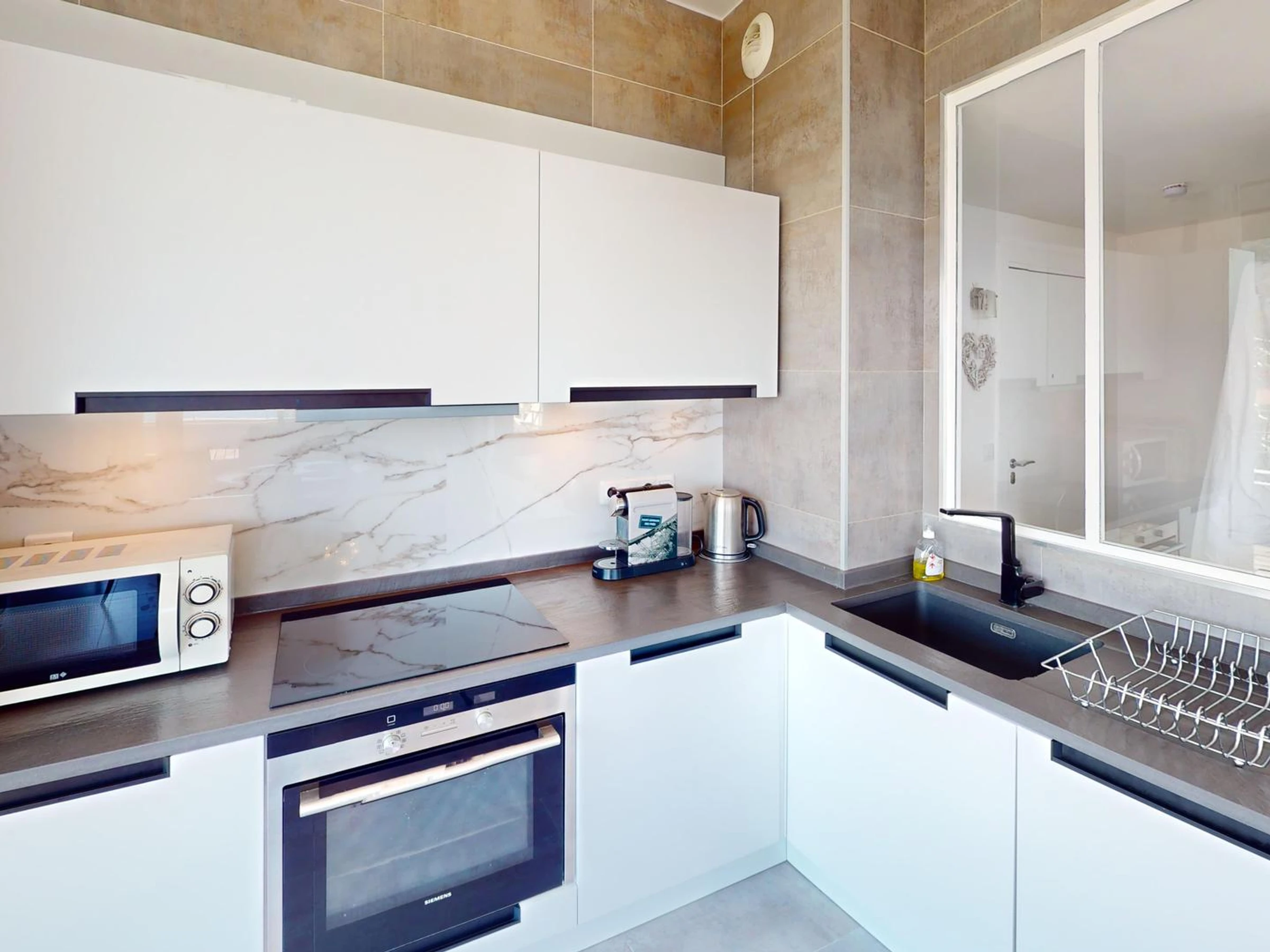 Área de cocina equipada con horno, microondas, lavavajillas y lavadora.