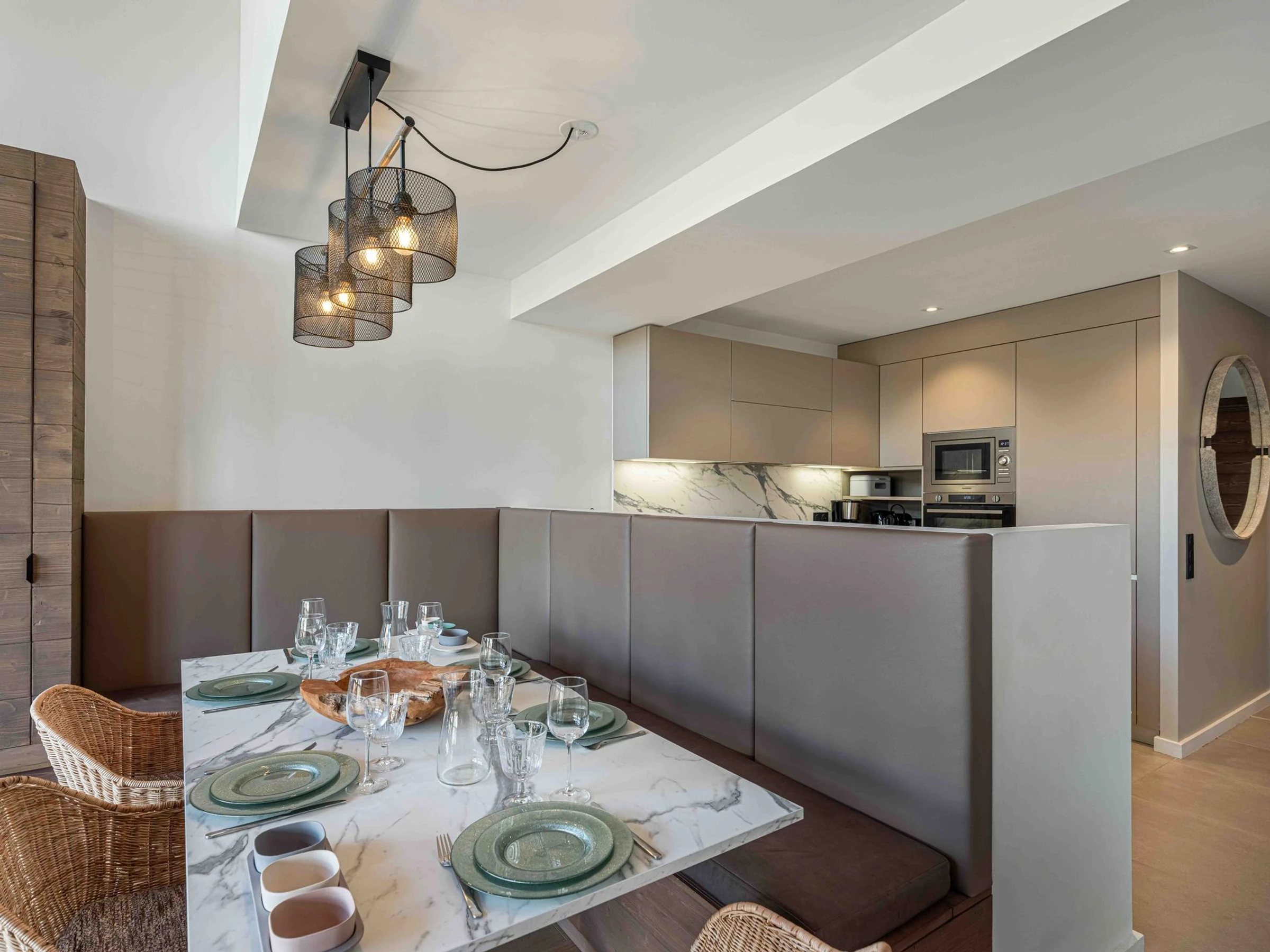 - Cocina abierta equipada con: campana extractora, horno, microondas, lavavajillas, nevera, cafetera Nespresso, hervidor de agua y tostadora.
