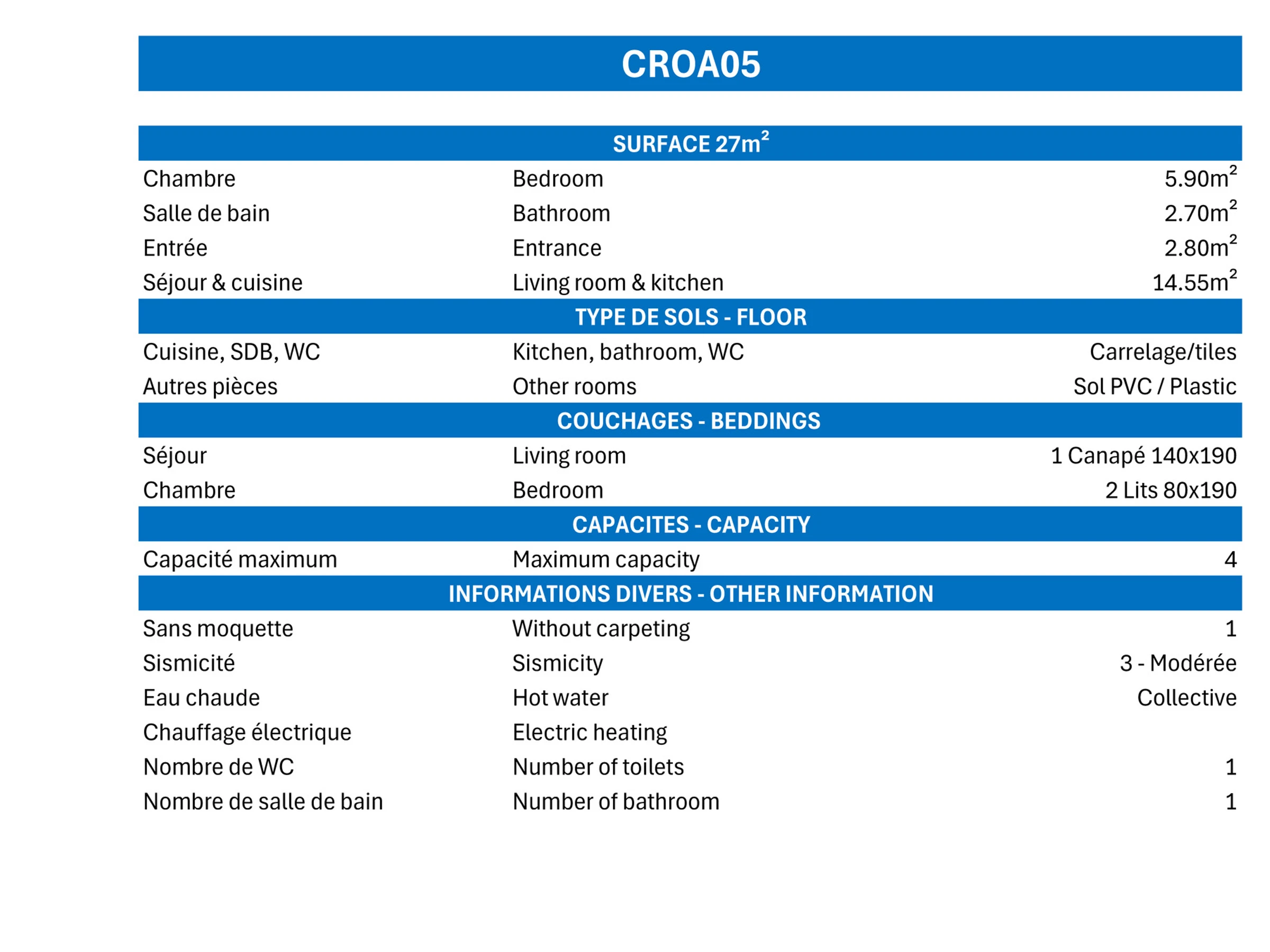 Habitación : 2 camas simples (80x190)