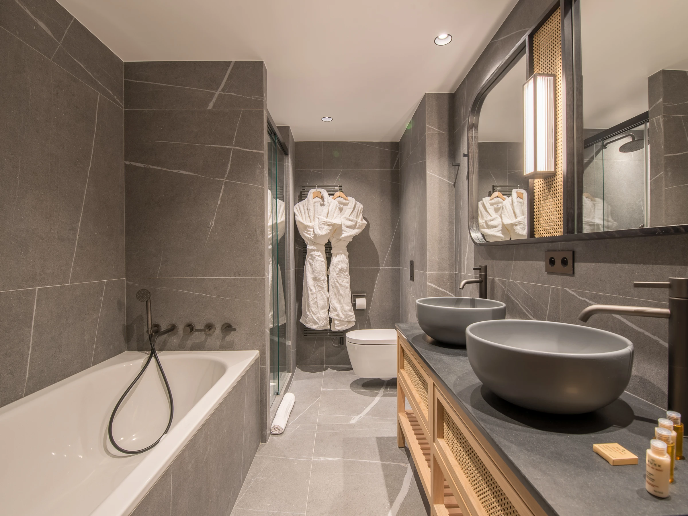- Dormitorio 1: cama doble + TV, baño con bañera, ducha, doble lavabo e inodoro