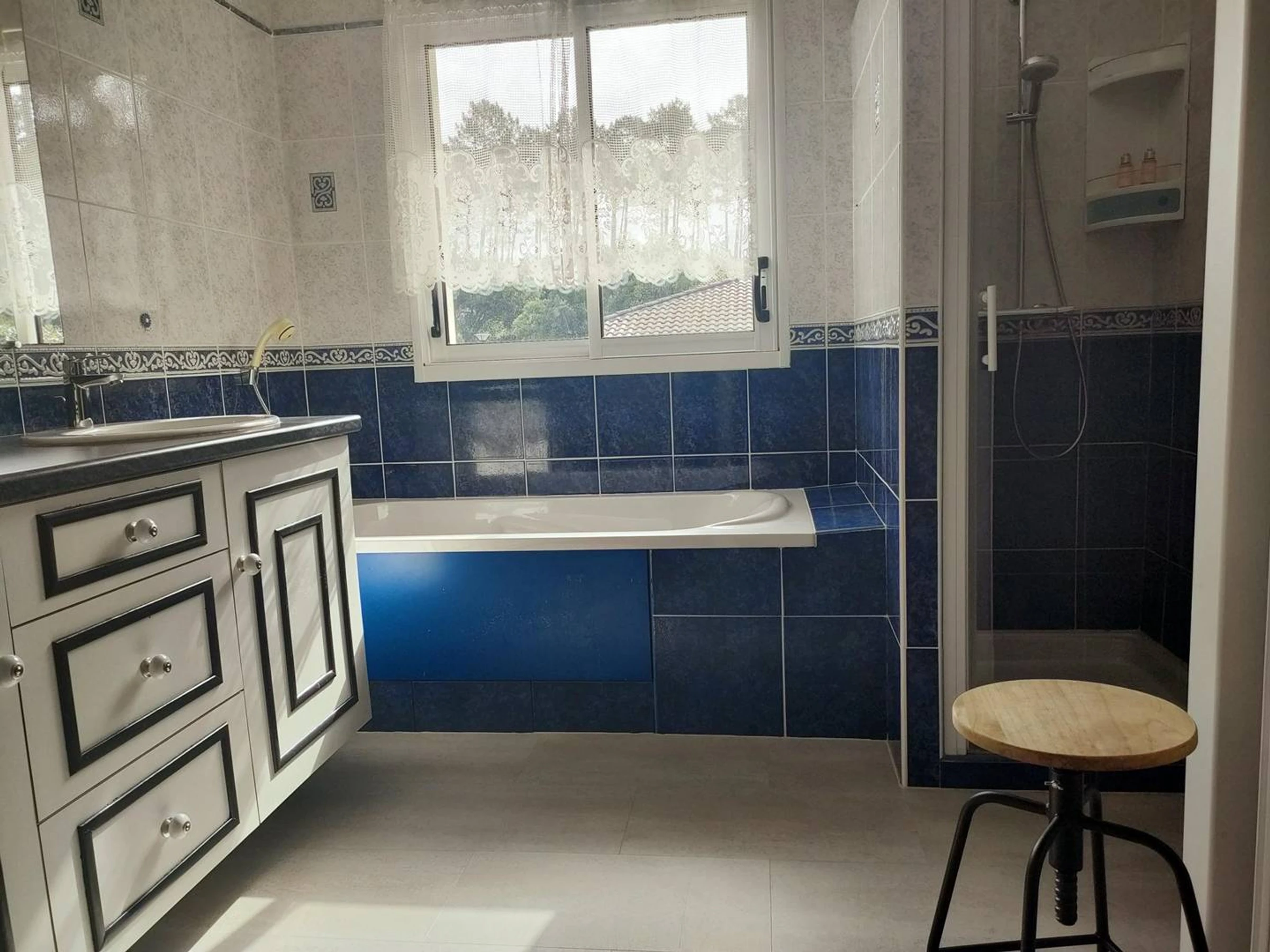 - Baño: lavabo doble, bañera y ducha.