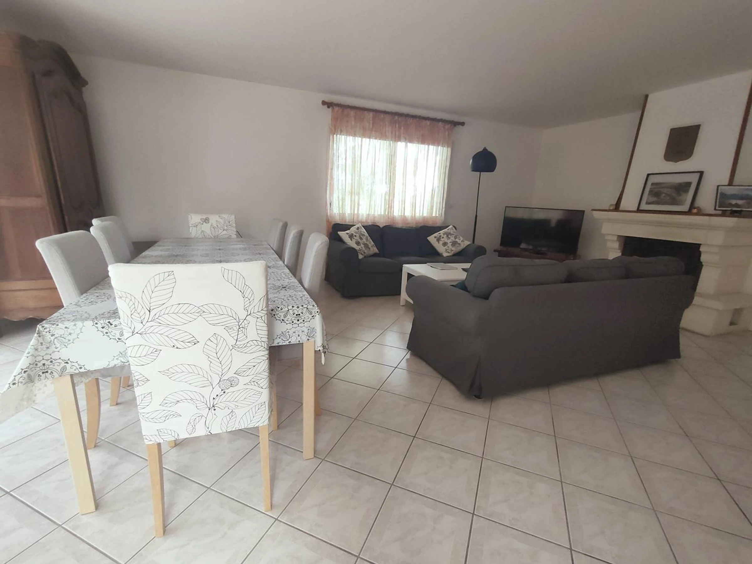 - Amplio salón-comedor con sofás, mesa de centro, mesa de comedor y sillas.