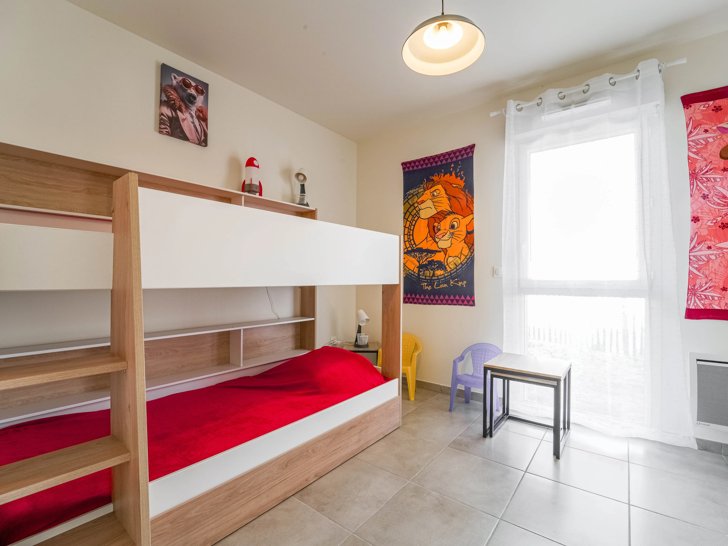 El apartamento dispone de tres dormitorios con capacidad para seis personas. El primer dormitorio cuenta con dos literas (90 cm), el segundo con dos camas individuales (90 cm) y el tercero con una cama doble (160 cm). Un baño con lavadora y secadora, un aseo adicional y un aseo independiente completan la propiedad.