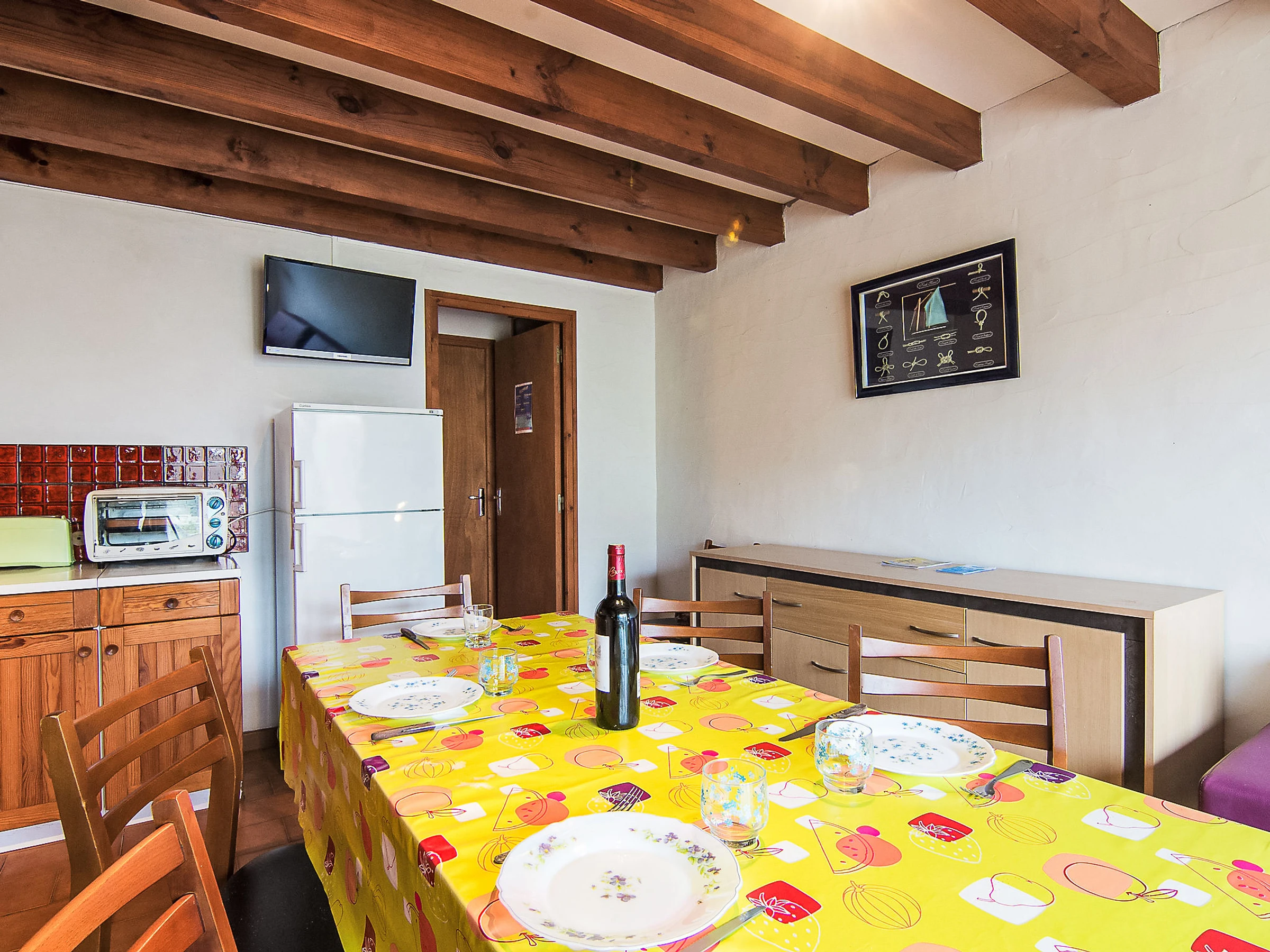 Casa adosada 3 estancias 50 m2 en 2 plantas. Con mobiliario sencillo: salón-comedor con TV y canales internacionales (pantalla plana). Salida a la terraza. Cocina abierta (1 fogón, horno pequeño, 4 fuegos, tostadora, hervidor de agua eléctrico, microondas, cafetera eléctrica, Cápsulas de café (filtre) extra). Ducha, WC separado. Calefacción no en todas las estancias. Planta superior: 1 dorm., abuhardillado con 1 cama de matrimonio (1 x 140 cm, 190 cm de longitud). 1 dorm., abuhardillado con 1 cama (90 cm, 190 cm de longitud), 1 cama de matrimonio (1 x 140 cm, 190 cm de longitud). Terraza. Muebles de terraza, tumbonas (1). El alojamiento dispone de: Internet (Wifi, gratis). A tener en cuenta: permitido máximo 1 mascota / perro. Detector de humo.