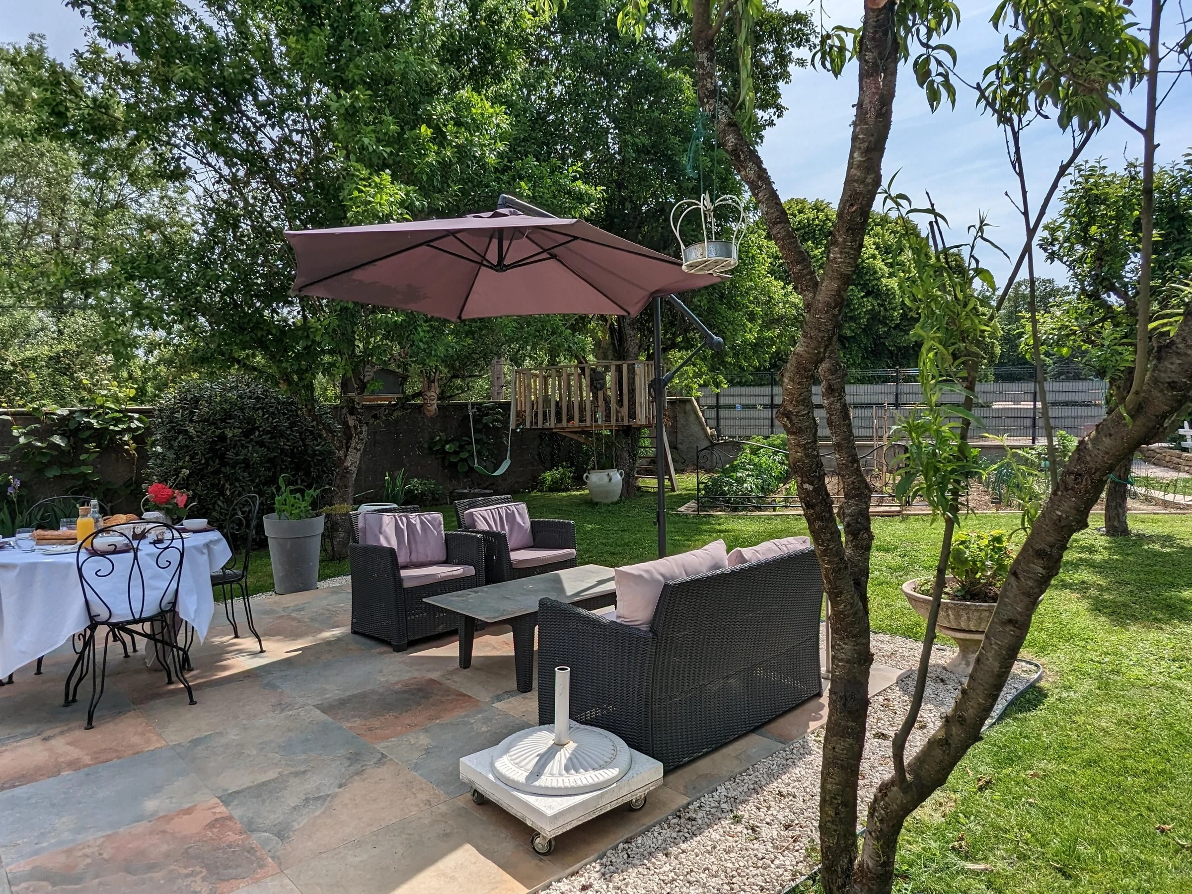 El jardín es ideal para relajarse; Muriel, la propietaria, le dedica mucho tiempo. Dispone de una cocina de verano con nevera y plancha.
