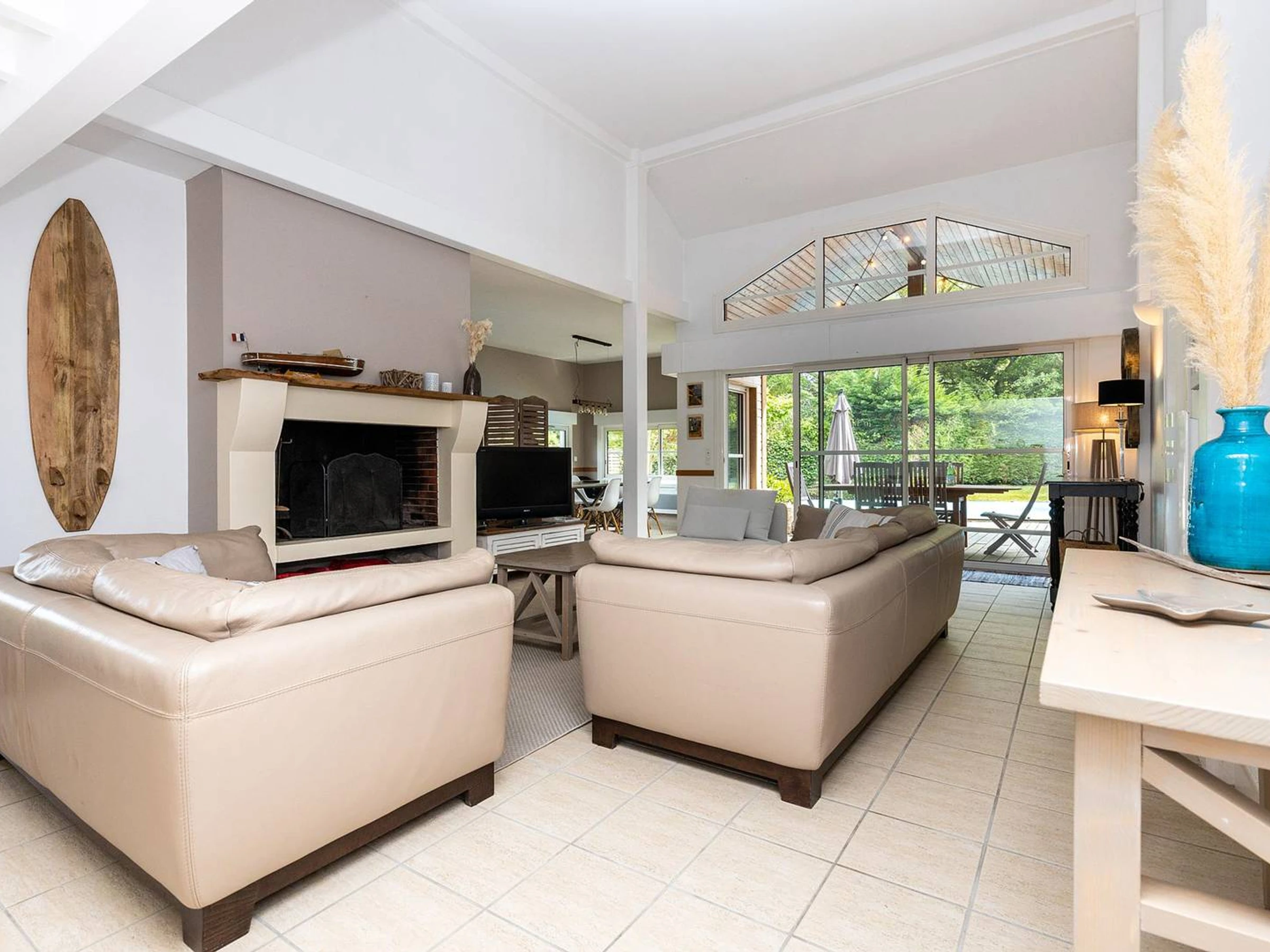 - Sala de estar con sofá, sillones, mesa y sillas, y puertas francesas que dan a la terraza.
