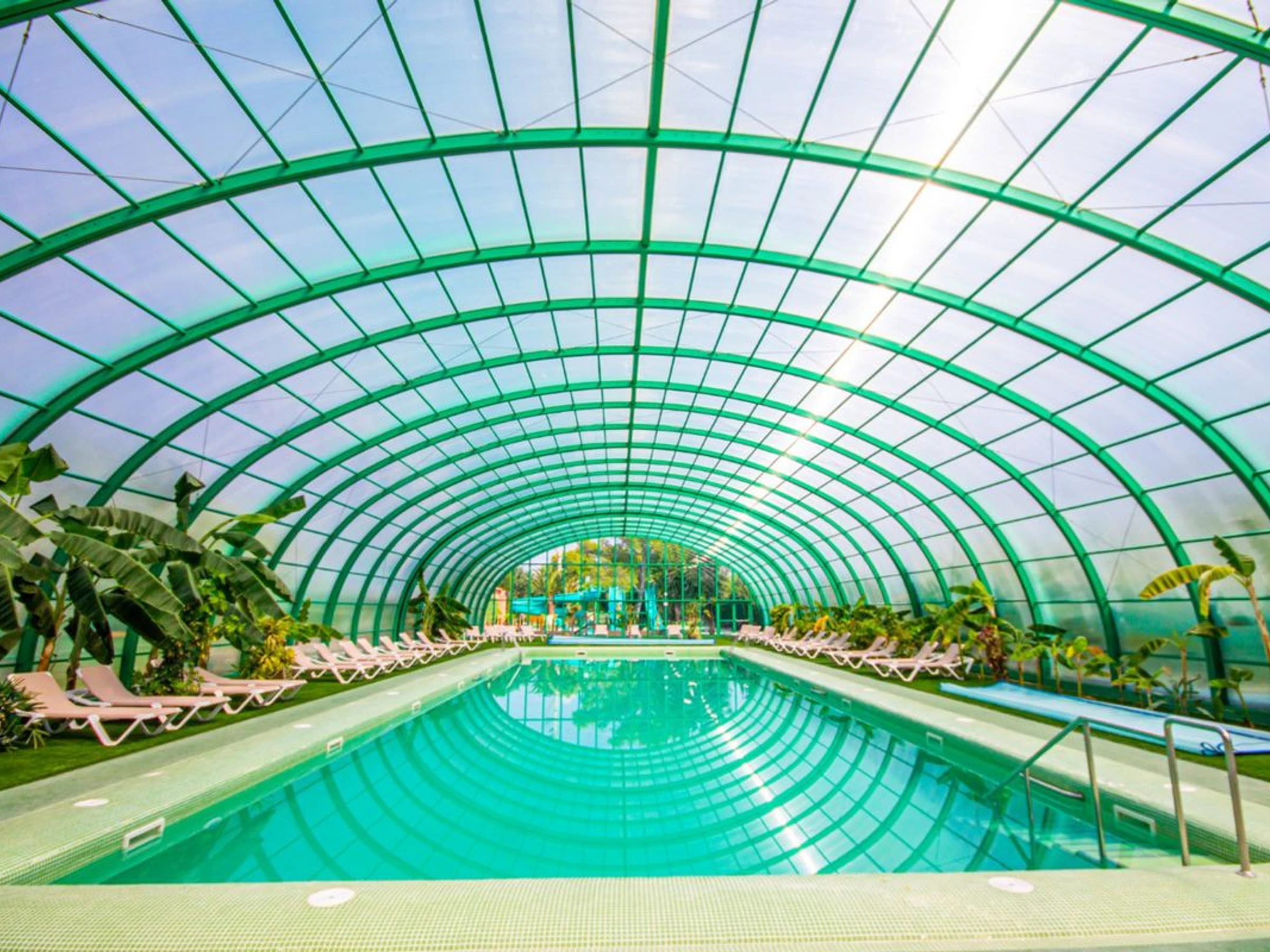 Piscina cubierta con techo retráctil. IMPORTANTE: No se permiten bañadores, shorts ni ningún otro tipo de traje de baño; solo se permiten slips. Abierta toda la temporada.