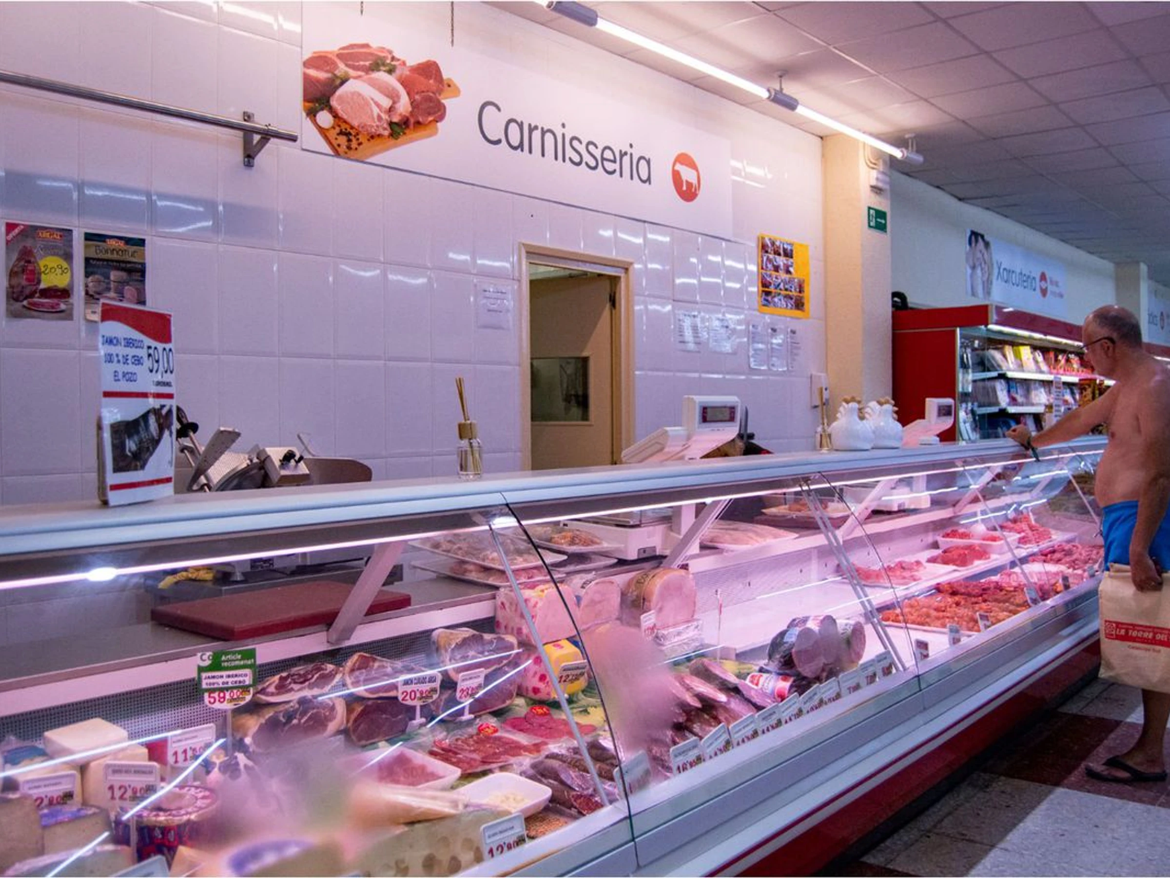 Supermercado con carnicería, sección de frutas y verduras, panadería, tienda de recuerdos con aperitivos y juguetes.