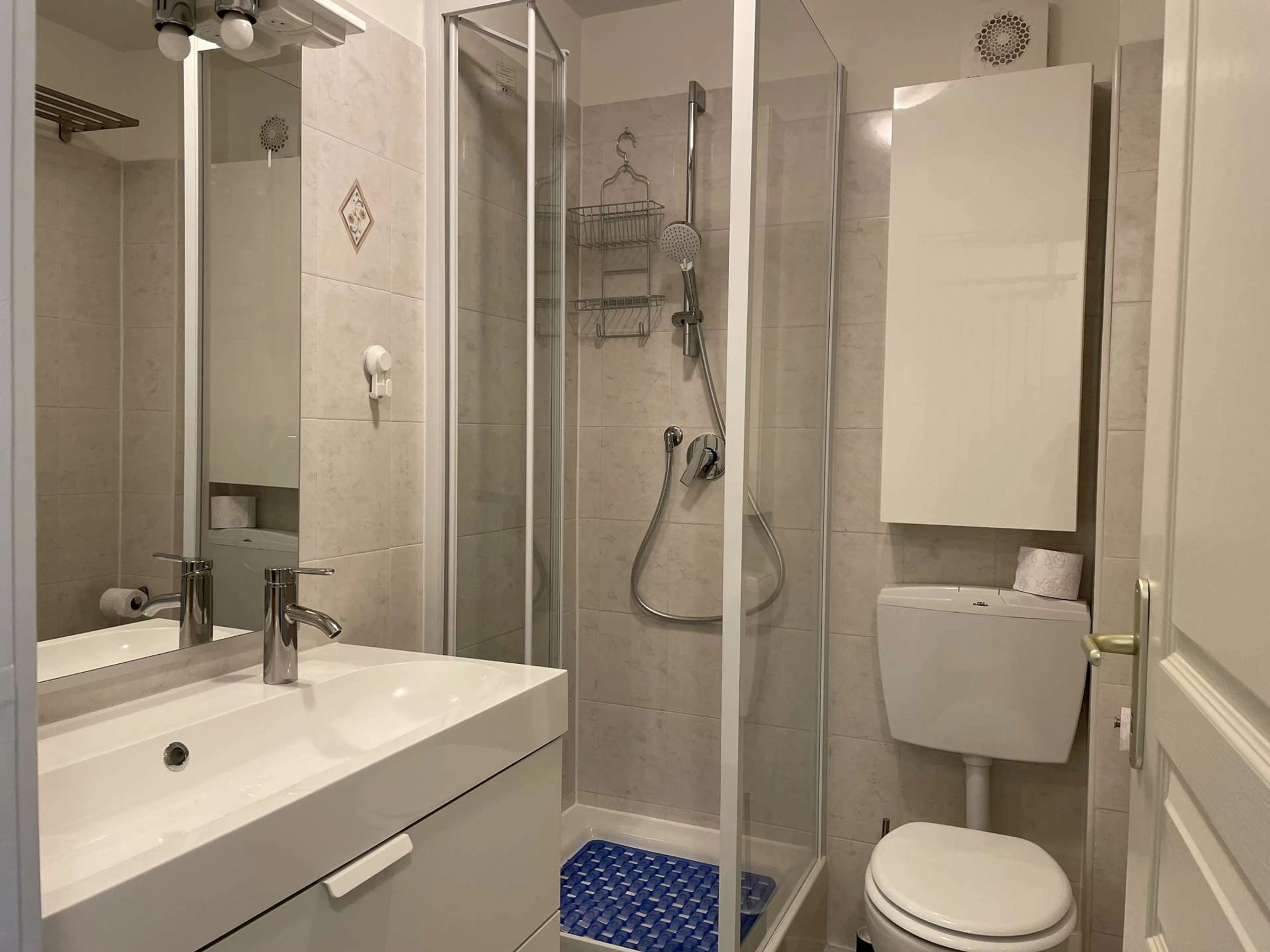 Baño con ducha, lavabo e inodoro.