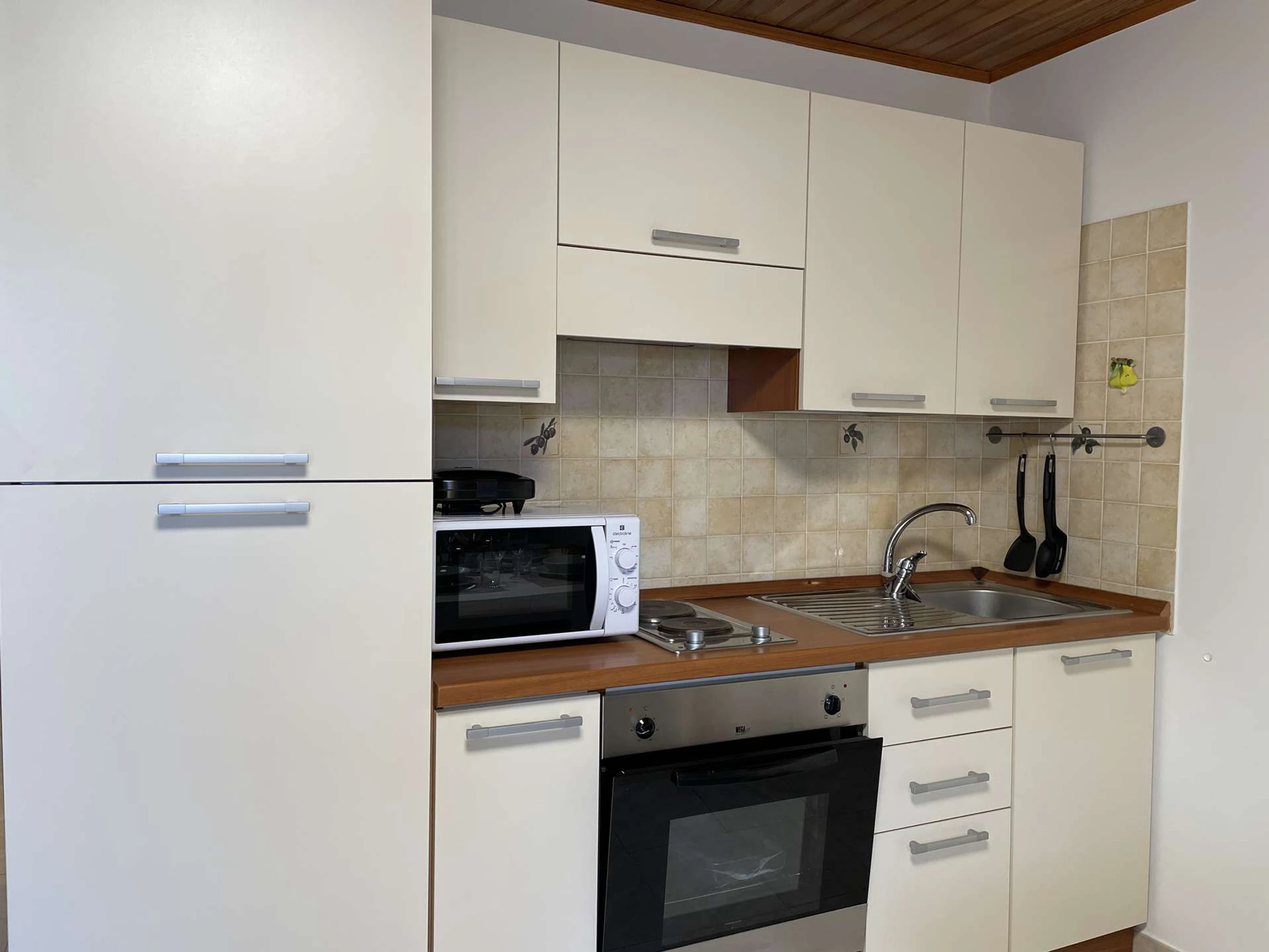 Cocina americana con nevera pequeña con congelador, dos placas eléctricas, horno y microondas.