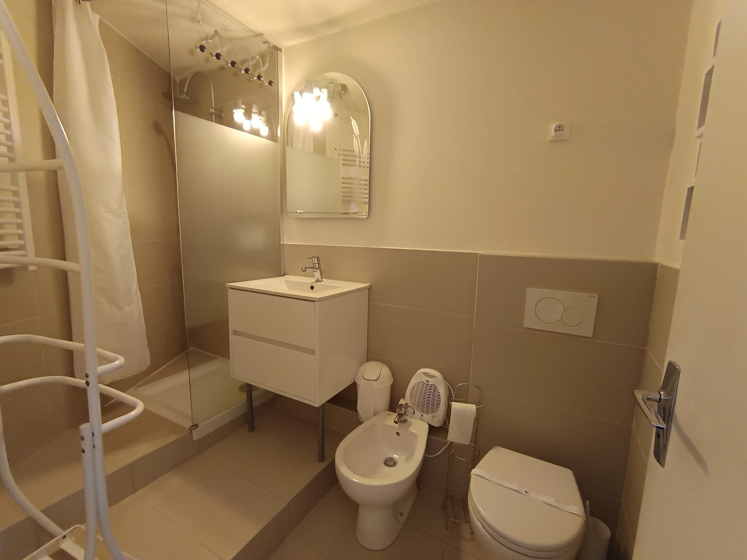 Baño: Ducha amplia con mampara, lavabo, toallero calefactado, armario, espejo grande con iluminación, bidé, inodoro, estanterías y lavadora.