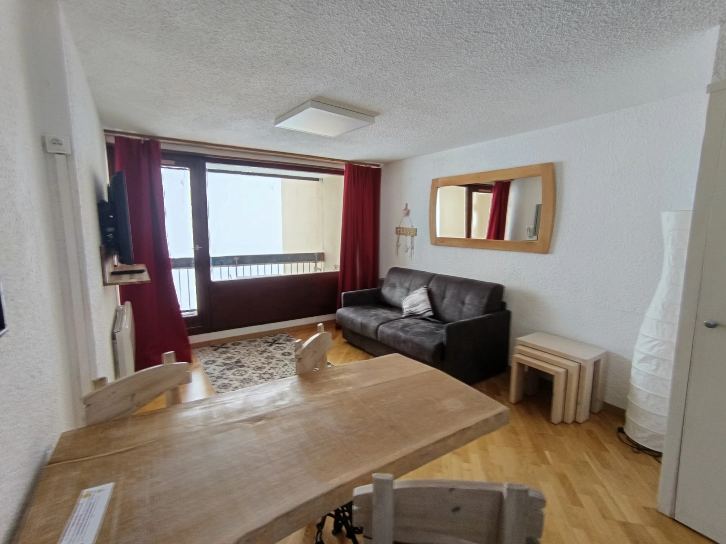 Salón: Pantalla de televisión - Sofá de 3 plazas - Mesas nido (apilables para ahorrar espacio) - Taburetes de madera estilo montaña - Estante de pared, lámpara de noche, iluminación de diseño en el pie, espejo grande y mesa. Acceso al balcón con vistas a las pistas.