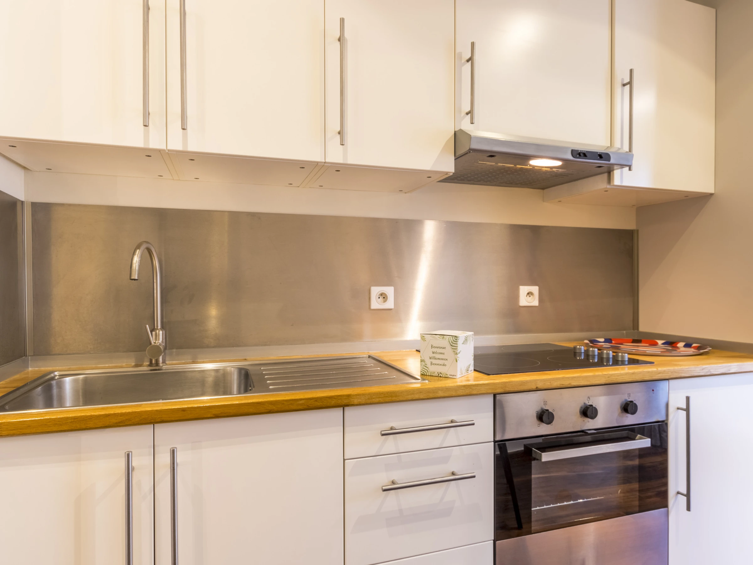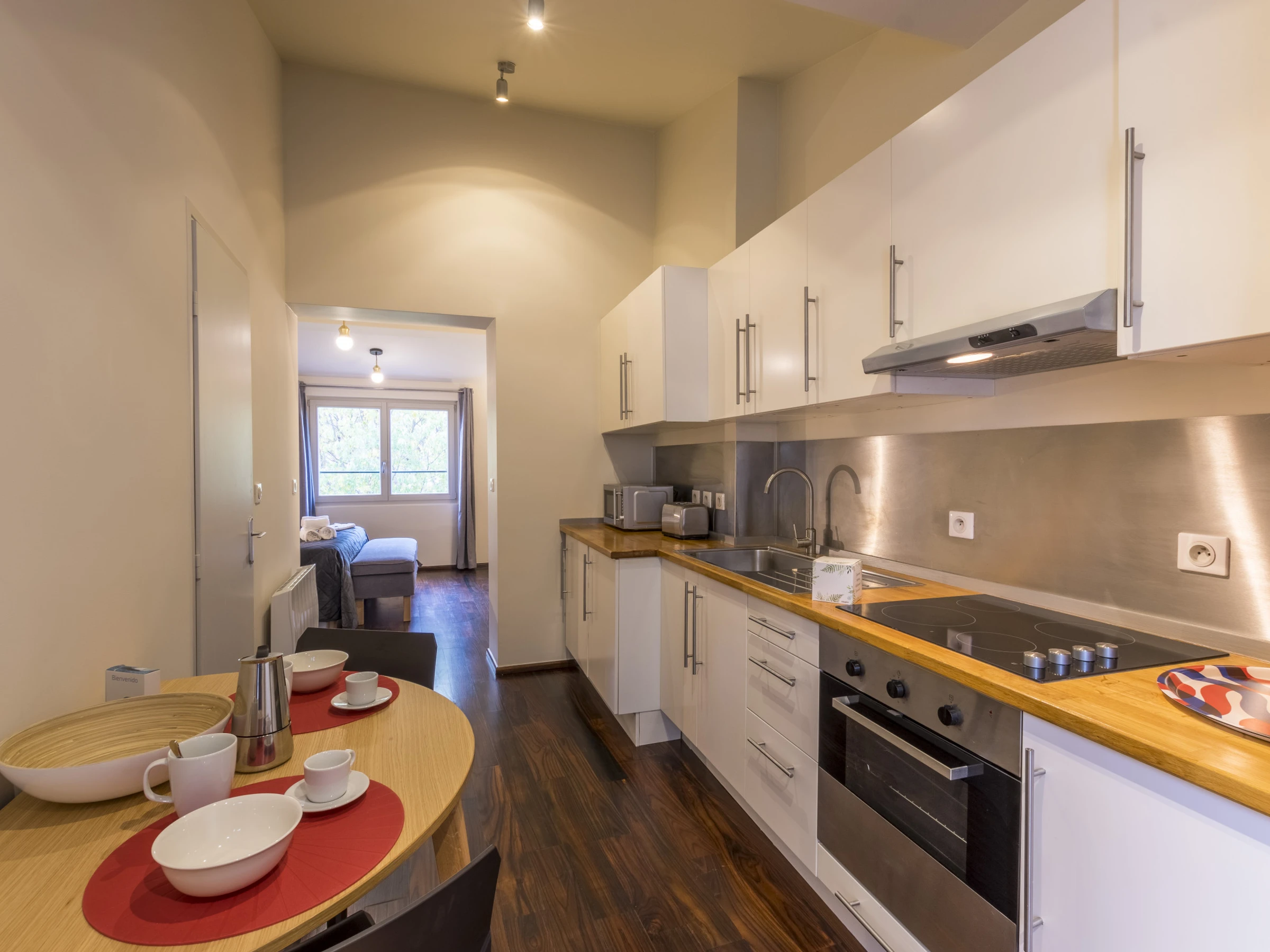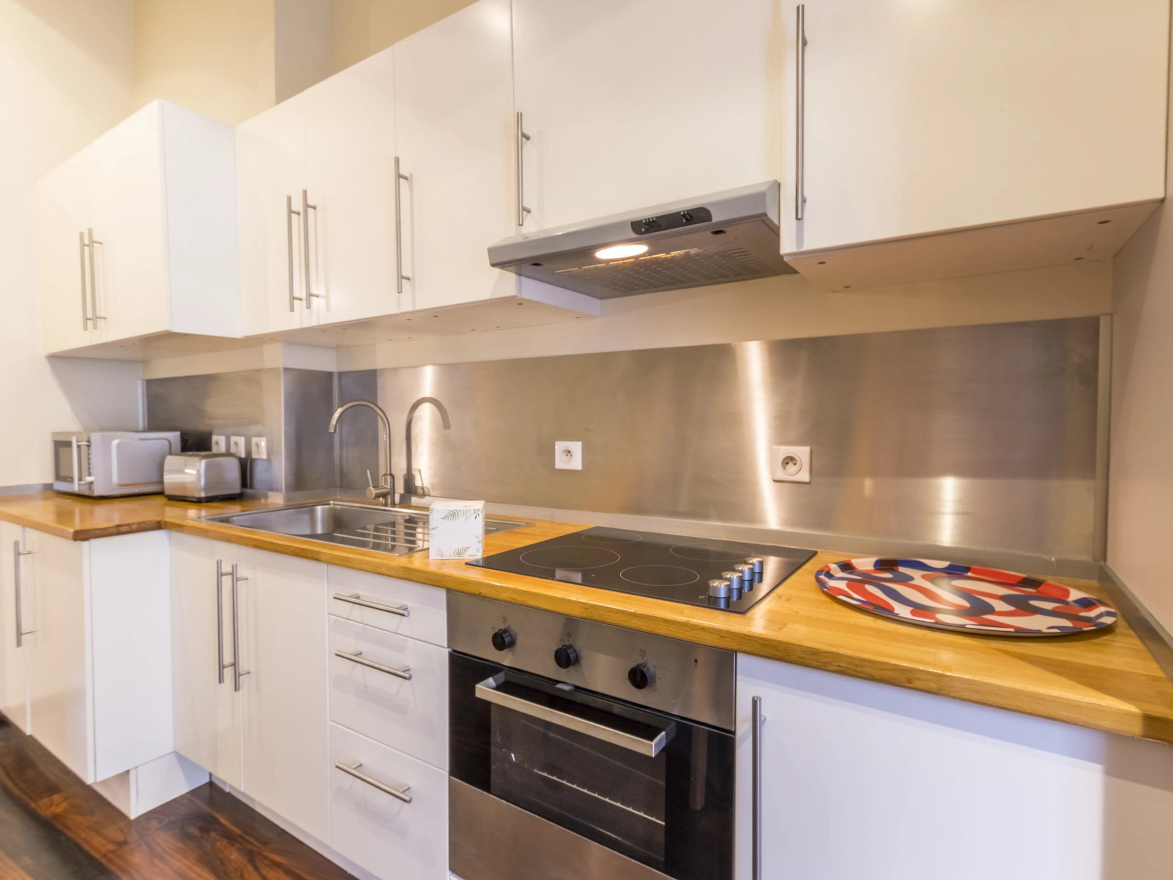 L'autre partie du logement est dédié à une spacieuse cuisine américaine entièrement équipée avec des équipements de qualité.