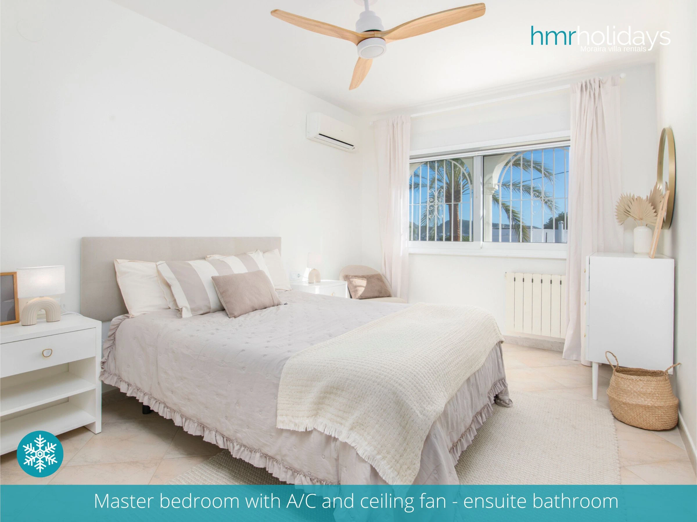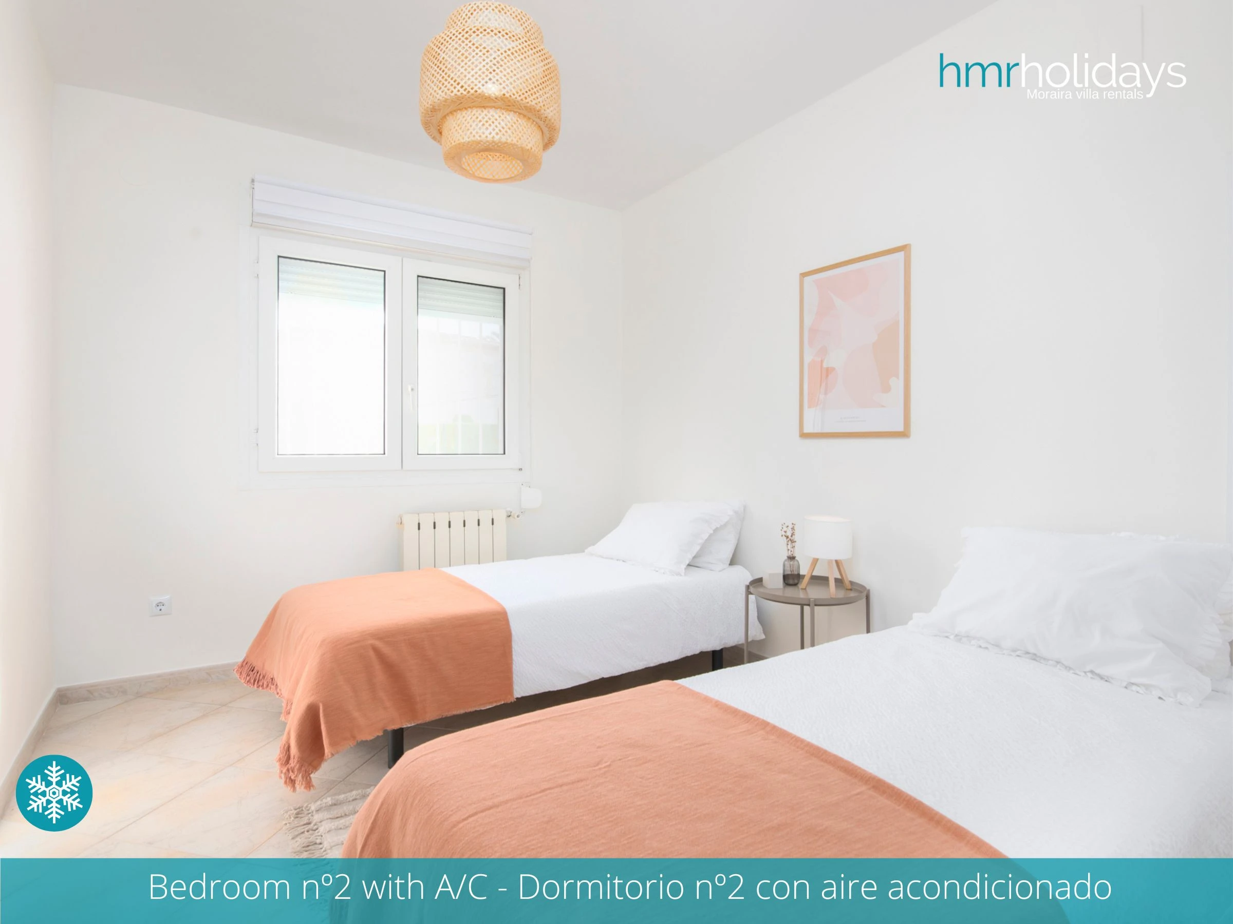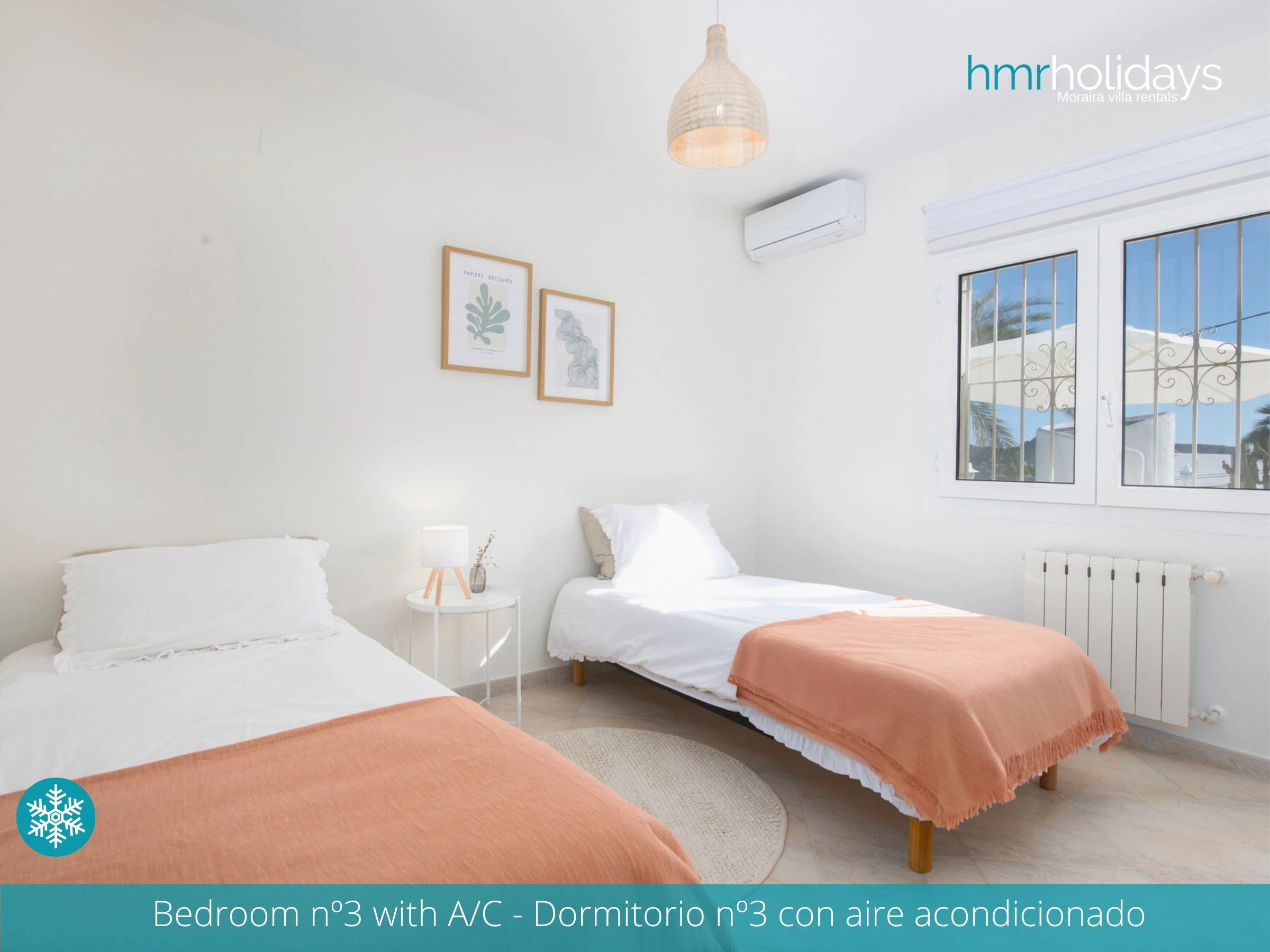 La villa dispone de aire acondicionado en todas las estancias, lo que garantiza una estancia cómoda incluso durante los meses más calurosos. En el interior, la distribución es práctica y funcional, con tres dormitorios: un dormitorio doble y dos dormitorios con camas individuales, ideal para familias o grupos de amigos.