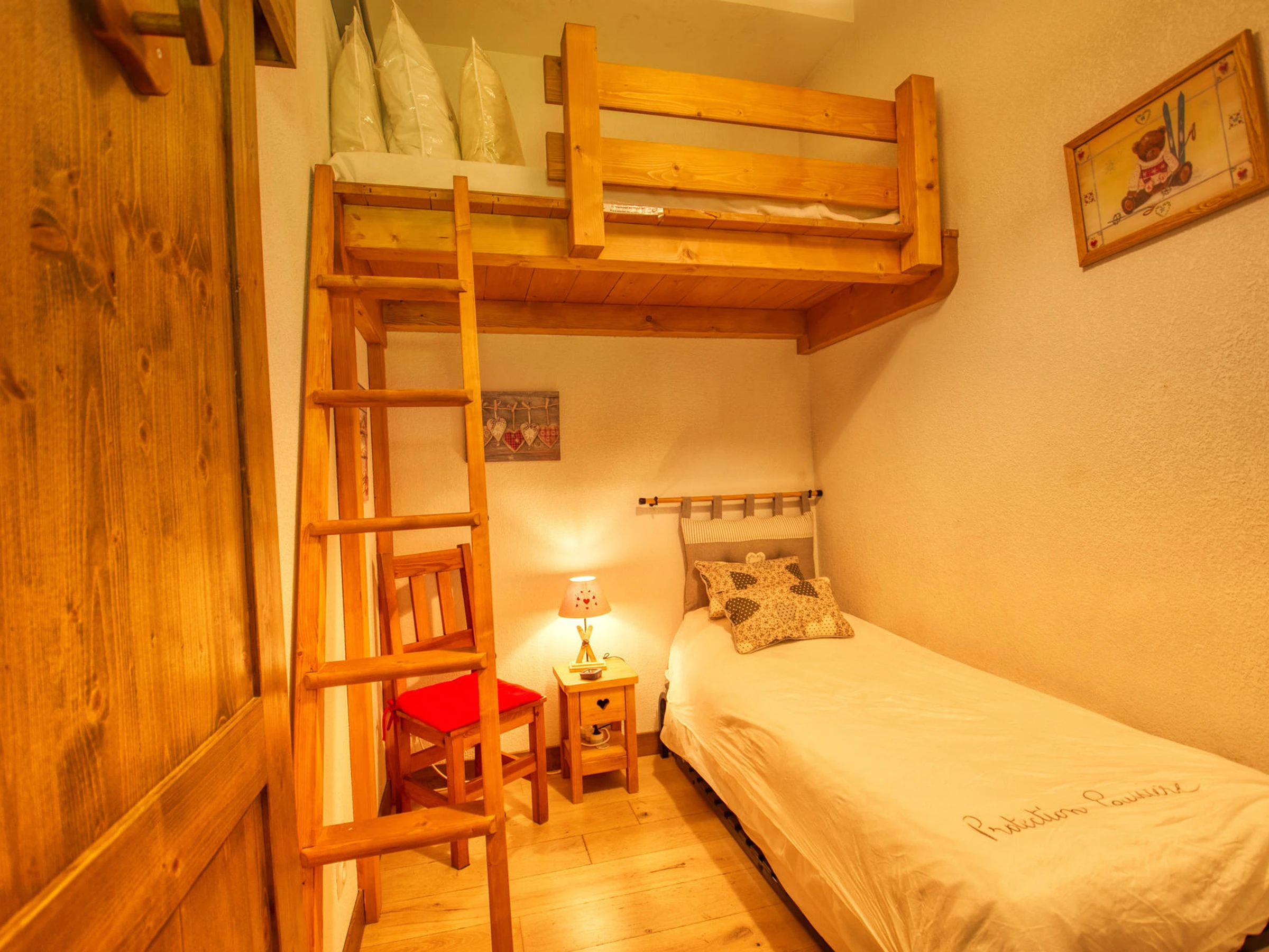 Dormitorio n.° 2: posibilidad de dormir en camas nido de 80 x 190 cm o dos camas individuales, una de ellas en el altillo con acceso por escalera.