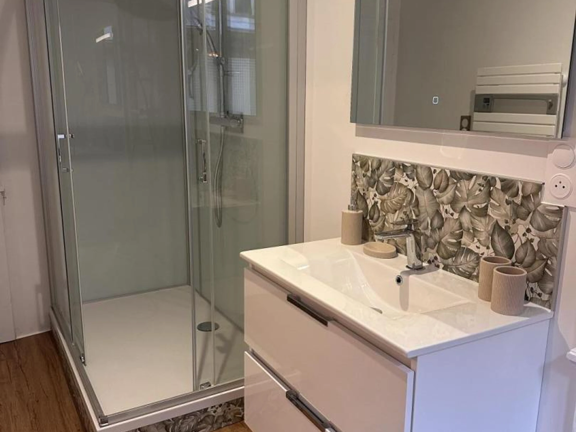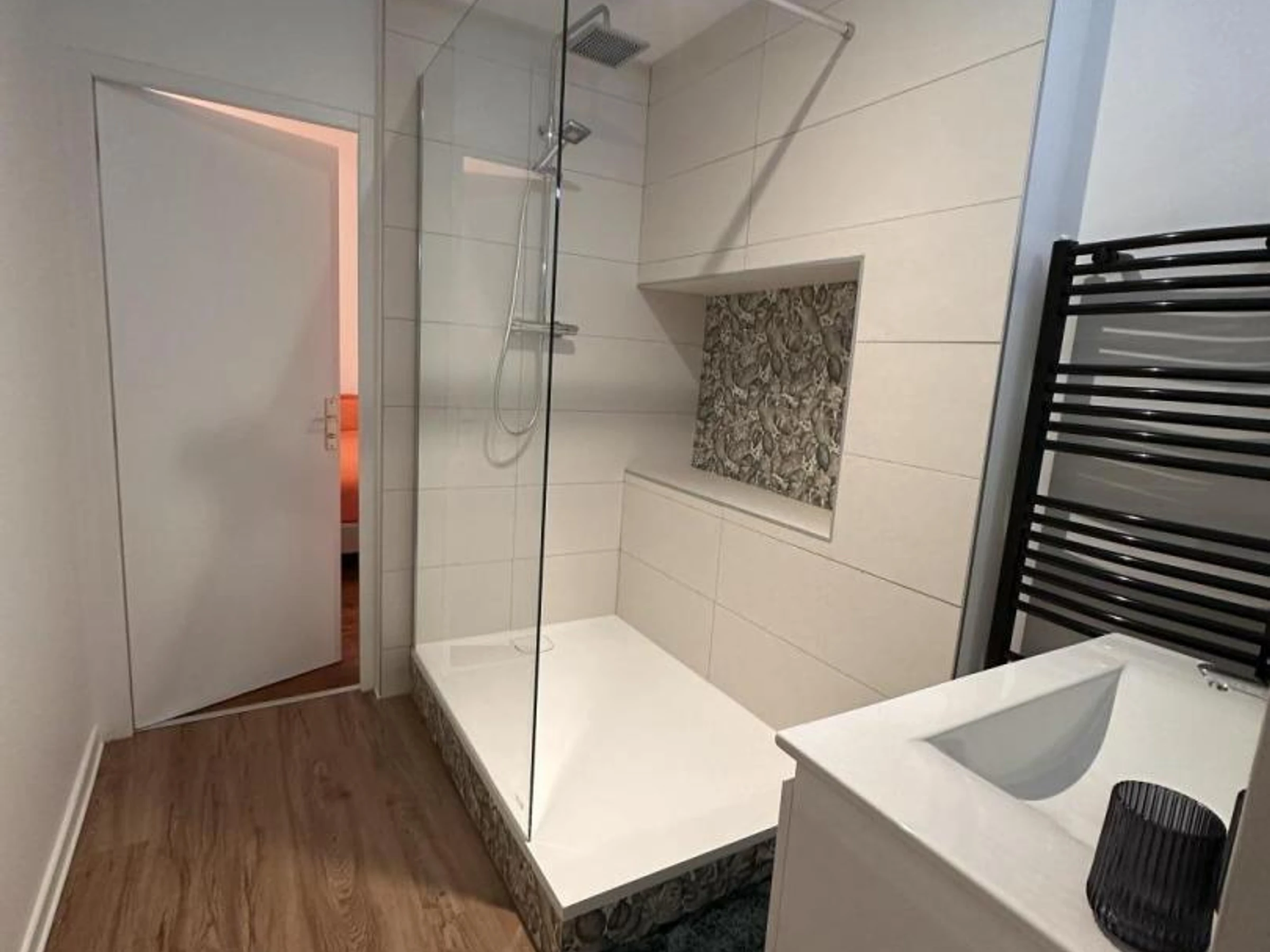 2ª planta: Desde la entrada, bajamos 5 escalones para acceder a la cocina abierta al salón y al salón. Una habitación doble (1 cama de 180x200) y una habitación doble (2 camas individuales de 90x200) donde cada una dispone de su propio baño privado (ducha/WC) para mayor privacidad. Uno de los baños es un Sanibroyeur.