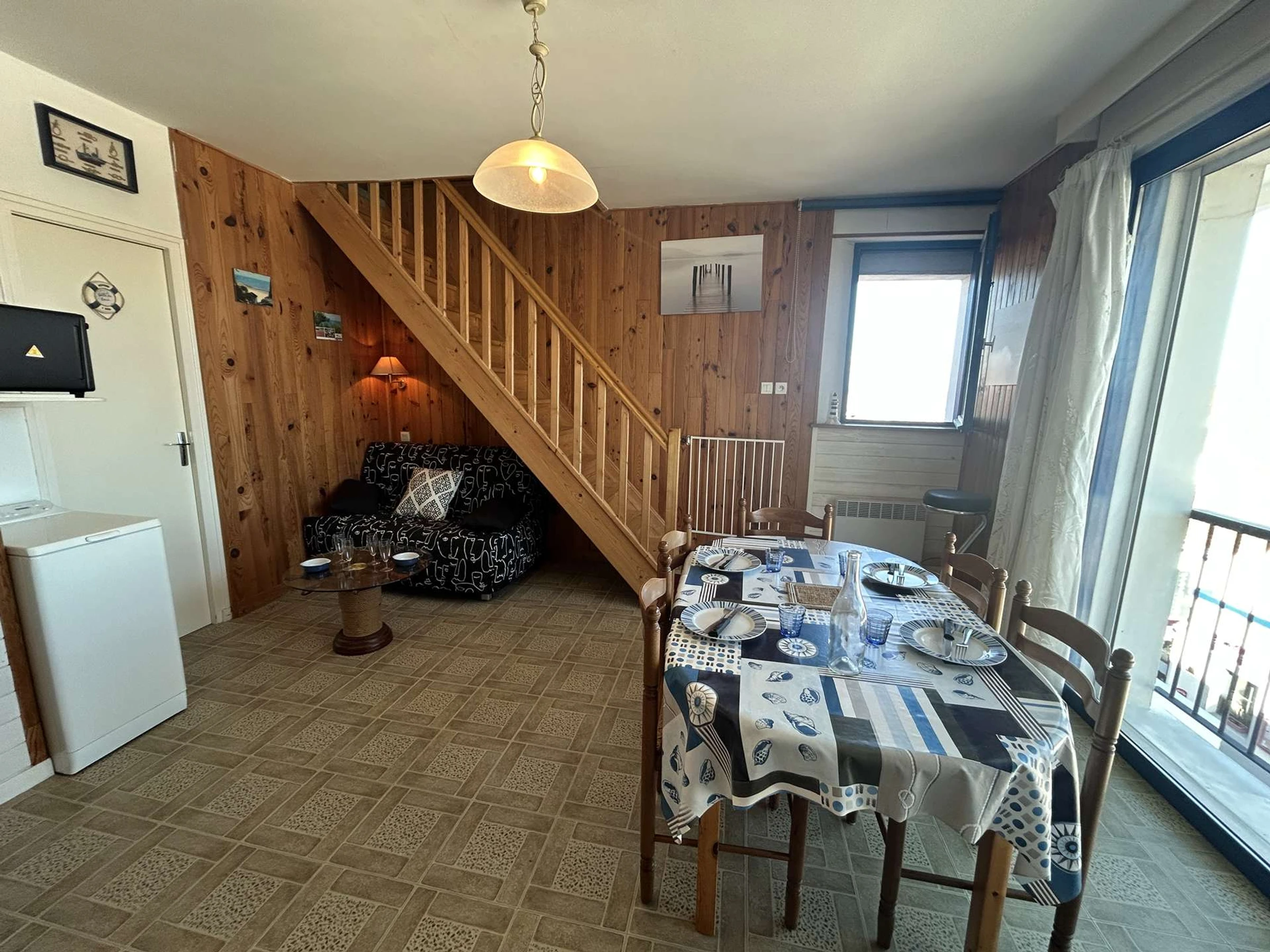 Este apartamento de vacaciones, situado en el segundo y último piso de una pequeña residencia, incluye una entrada con cocina americana, una sala de estar con un sofá cama de 2 plazas, una televisión, un baño (base de ducha elevada) y un WC separado. En la planta superior, un dormitorio abuhardillado (altura máxima 1,79) con cama de matrimonio y TV.
