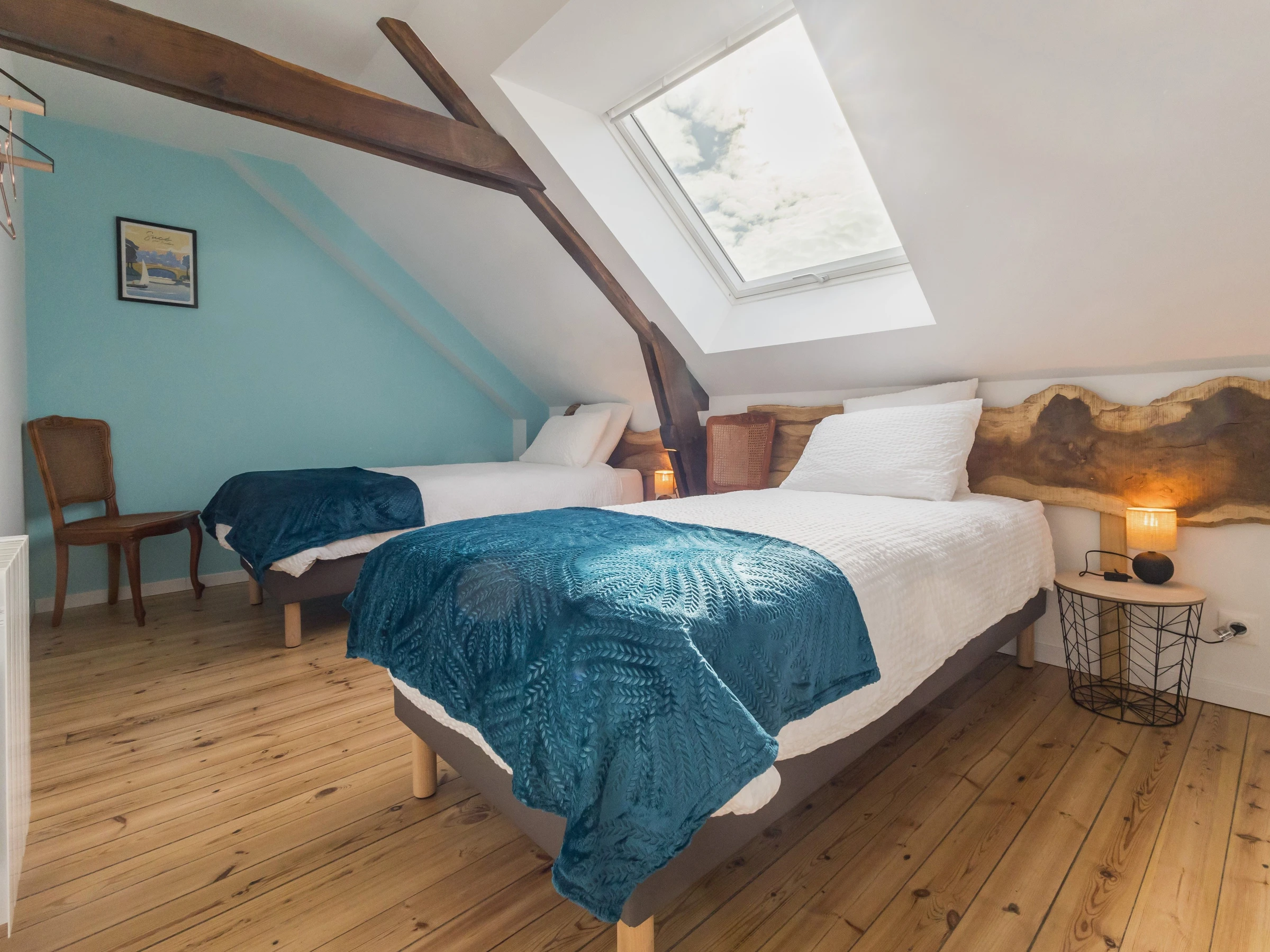 Planta alta: 2 dormitorios abuhardillados (cada uno con dos camas individuales) y baño con ducha/aseo.