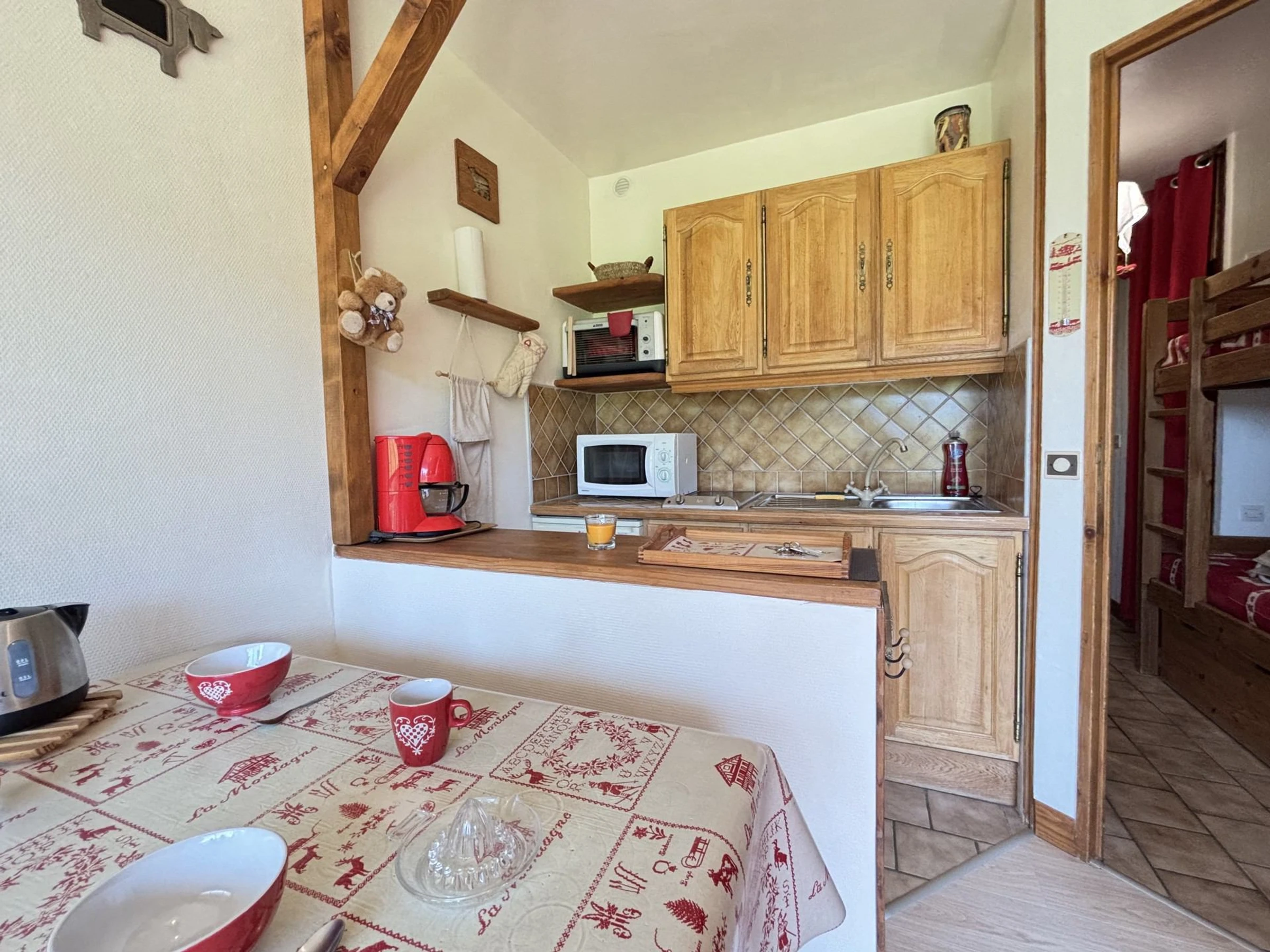 Este estudio de aproximadamente 18 m² se encuentra a pie de las pistas de esquí de Espace Diamant. Cuenta con un balcón orientado al sur, ideal para disfrutar del sol durante todo el día. Diseñado para alojar hasta cuatro personas. Situado en la planta baja del jardín, el apartamento ofrece vistas panorámicas al Mont Charvin.