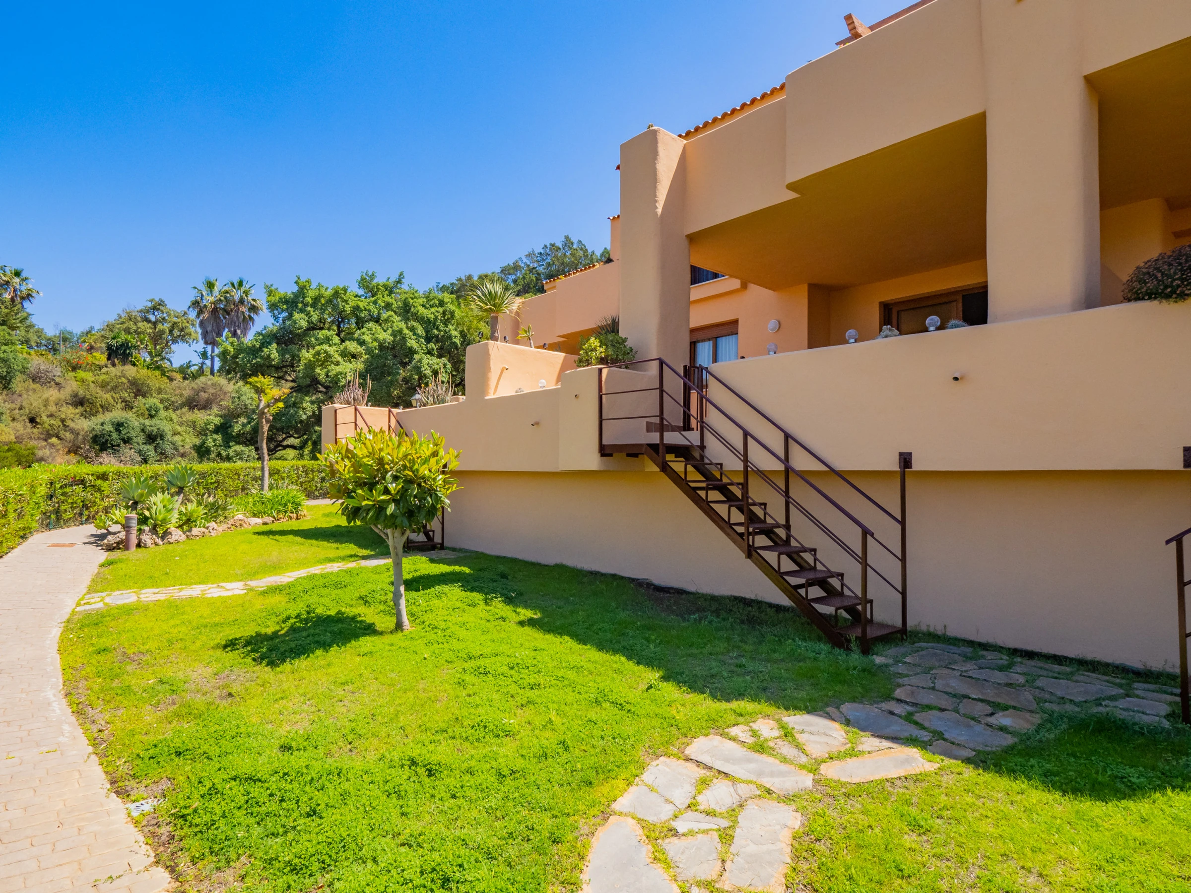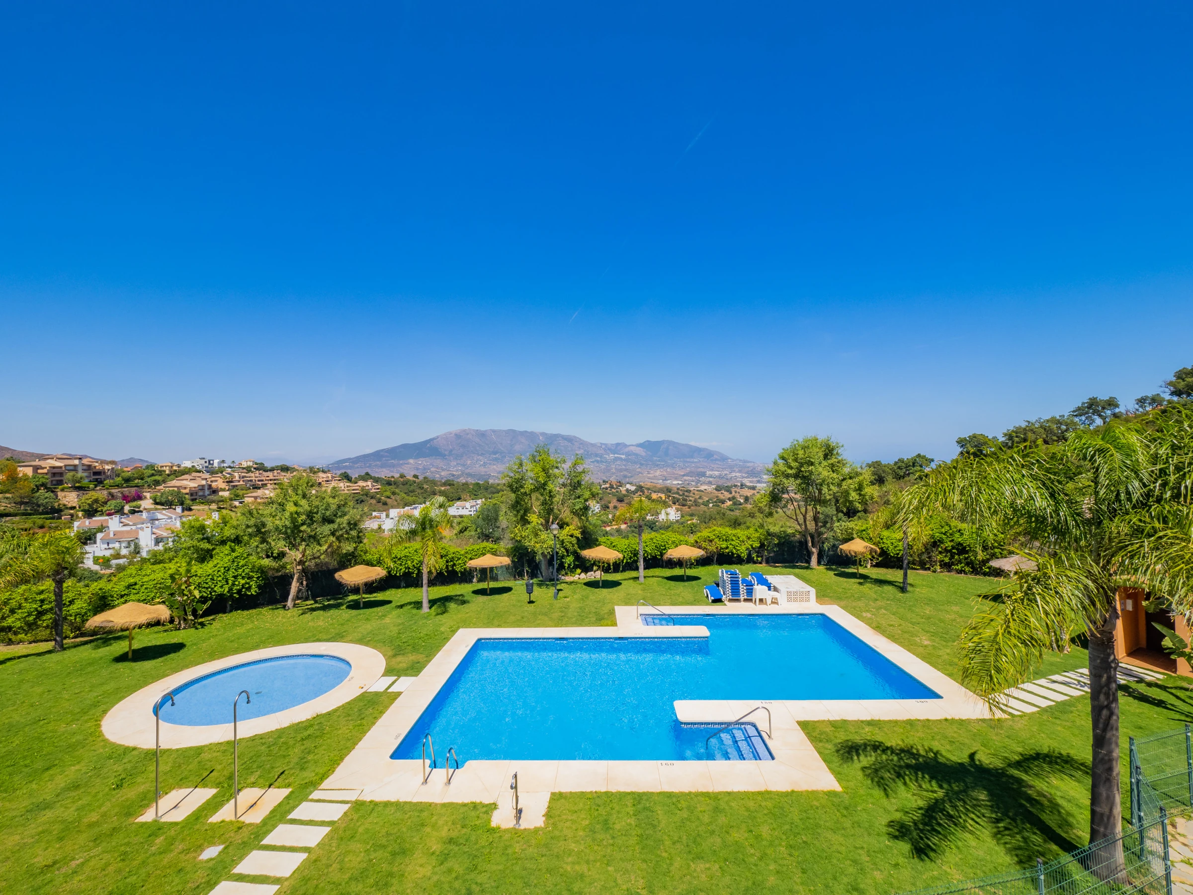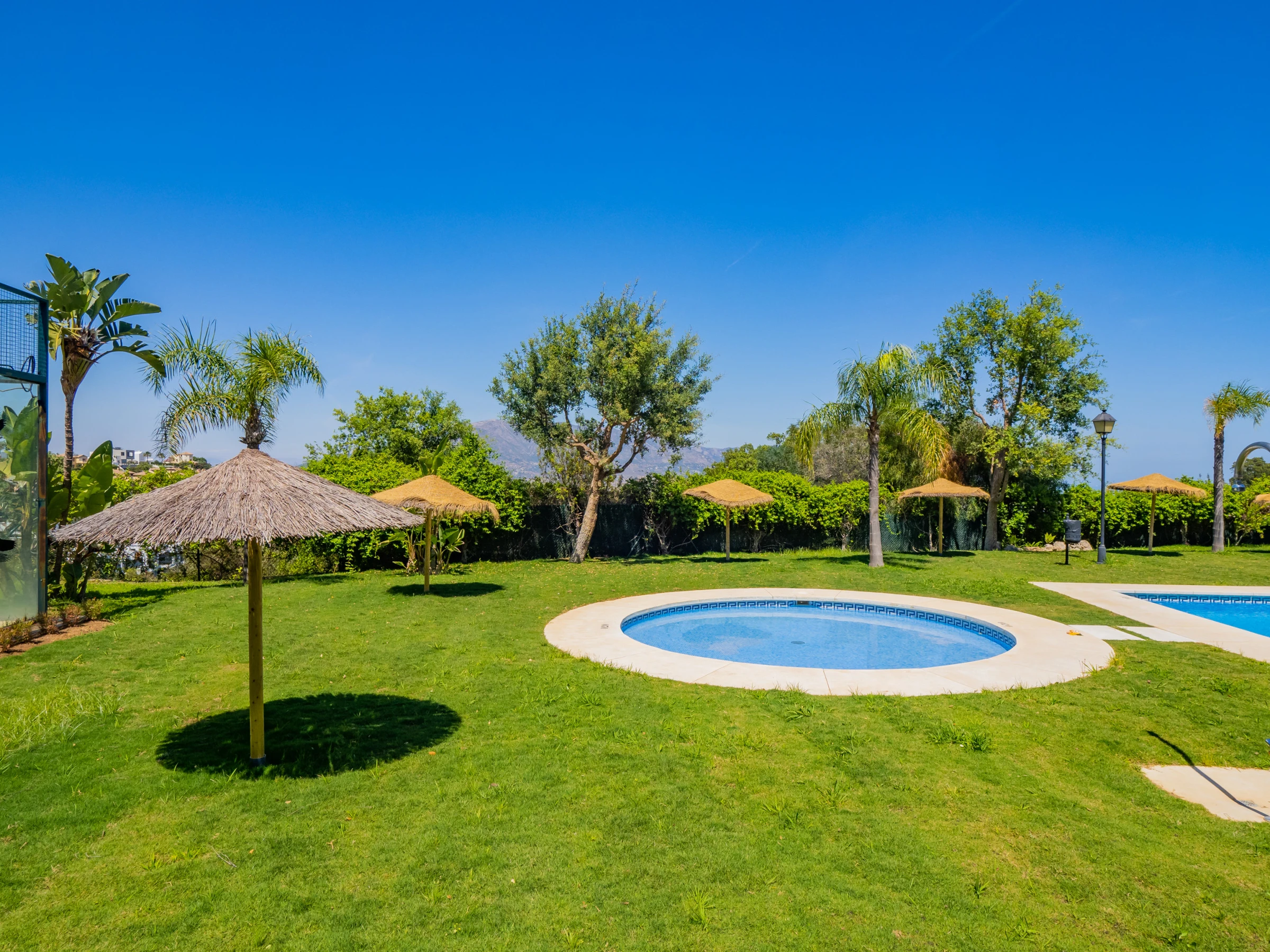 Este apartamento en una urbanización exclusiva en Soto de Marbella ofrece todo lo necesario para unas vacaciones inolvidables. Ubicado dentro de una comunidad tranquila con jardines cuidados, piscina comunitaria, piscina infantil y pista de pádel, el alojamiento permite también acceso al club social, que incluye gimnasio, sauna y pistas de pádel y golf, previa reserva. Podrás disfrutar de la amplia terraza cubierta con vistas a la montaña y al jardín, perfecta para desayunos, almuerzos o cenas en familia, sumergiéndote en un entorno natural y relajante.