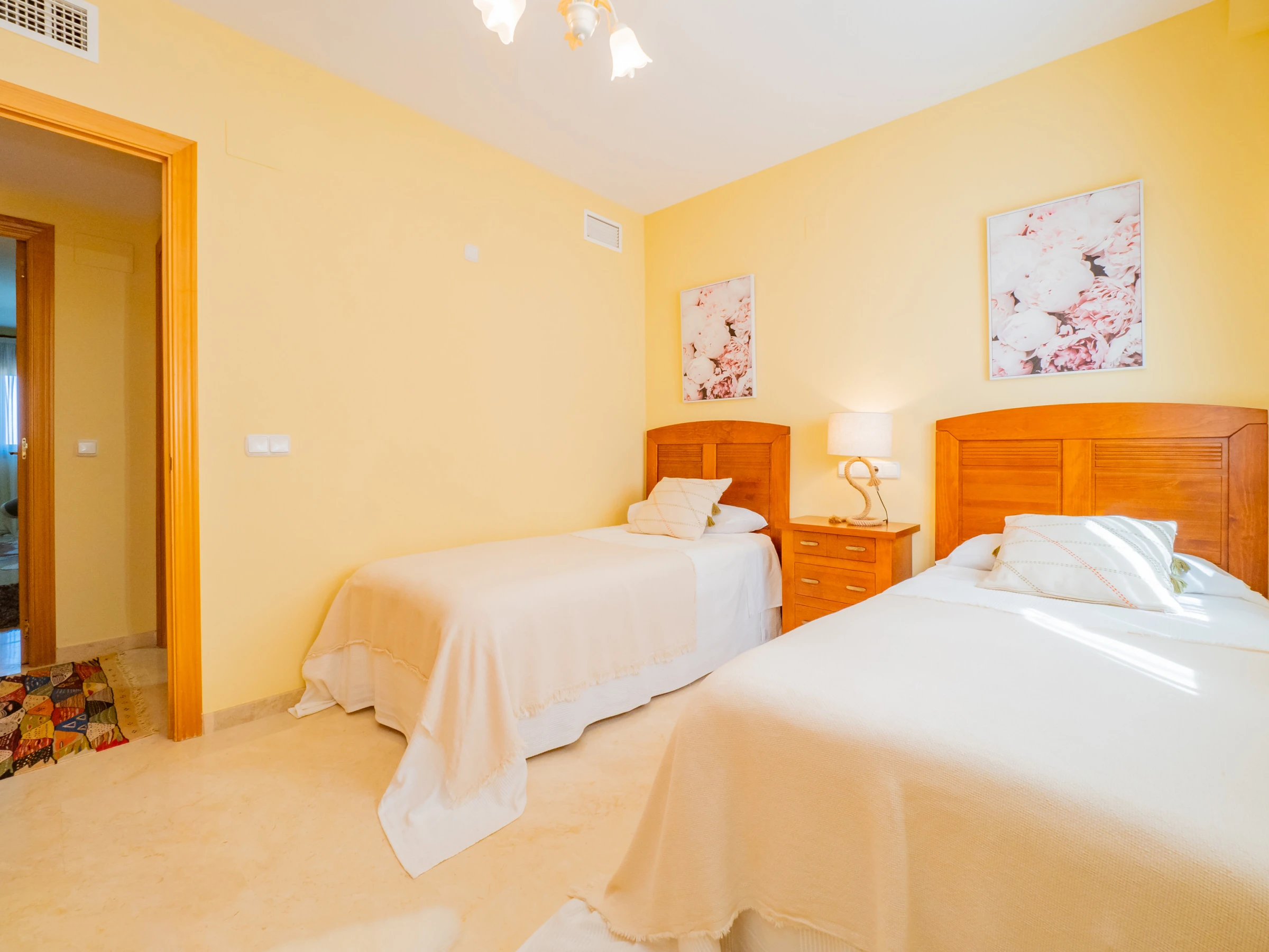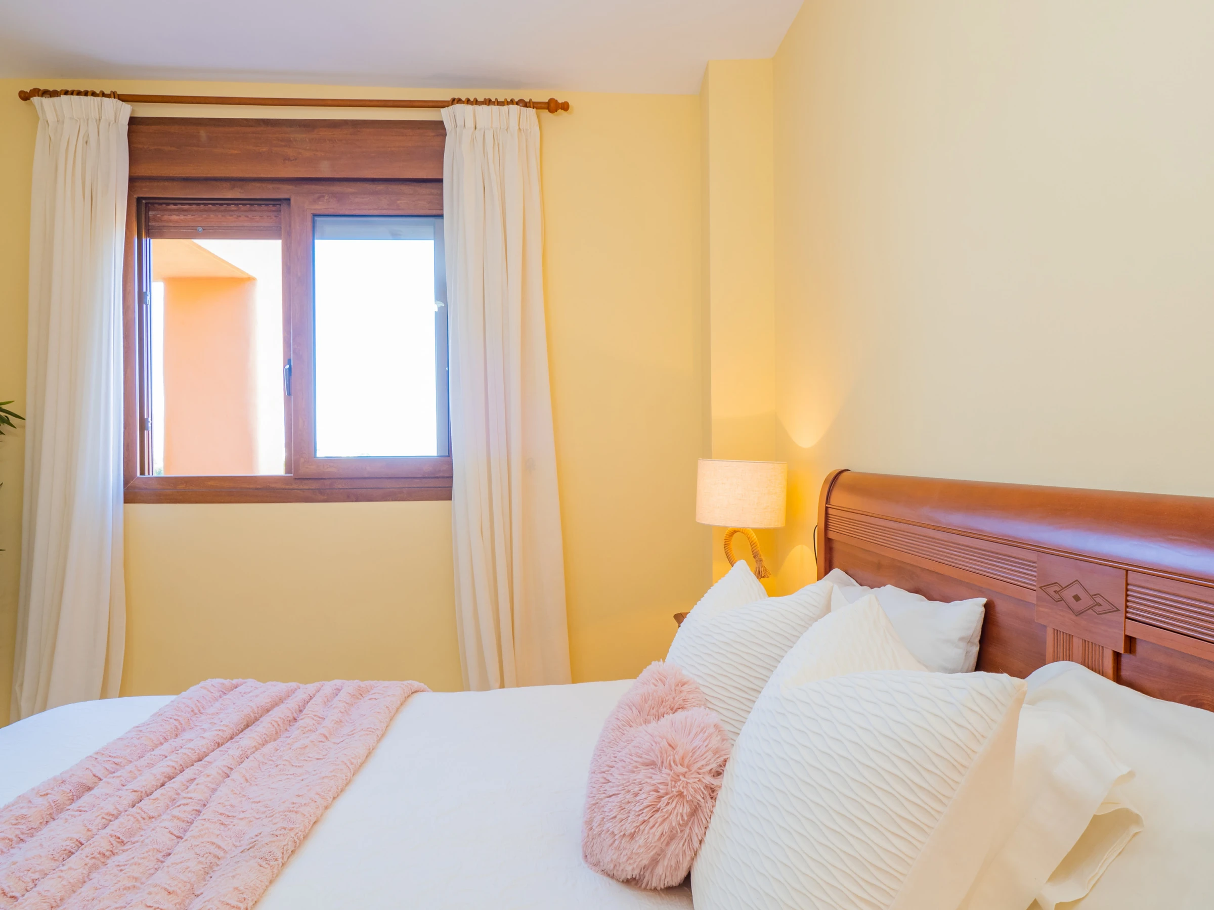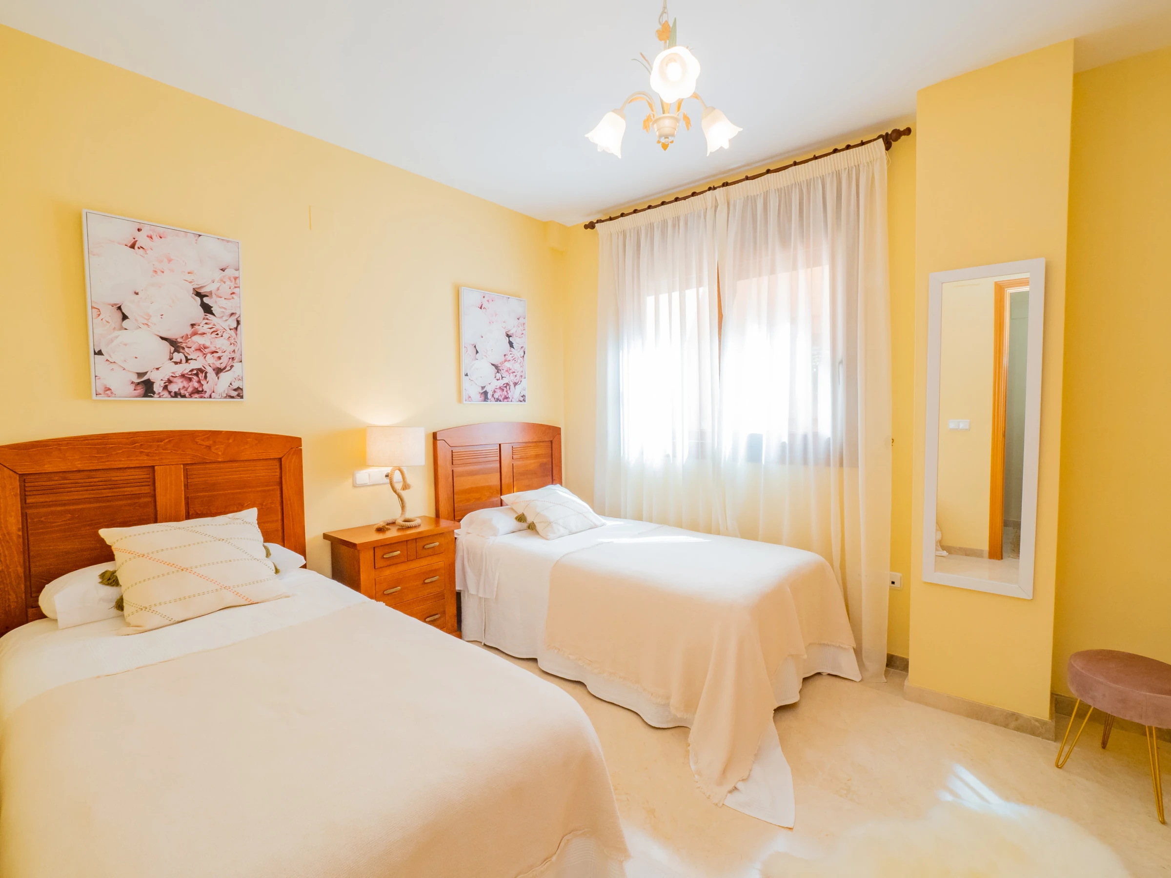 El apartamento dispone de dos dormitorios con capacidad para 4 personas: uno con cama de matrimonio y televisión, y otro con dos camas individuales. Ambos dormitorios tienen ventanas al exterior y suficiente espacio para guardar el equipaje. El baño completo incluye bañera. El aire acondicionado centralizado garantiza confort durante todo el año. Además, el alojamiento tiene wifi y una plaza de parking cubierta incluida en el mismo edificio.