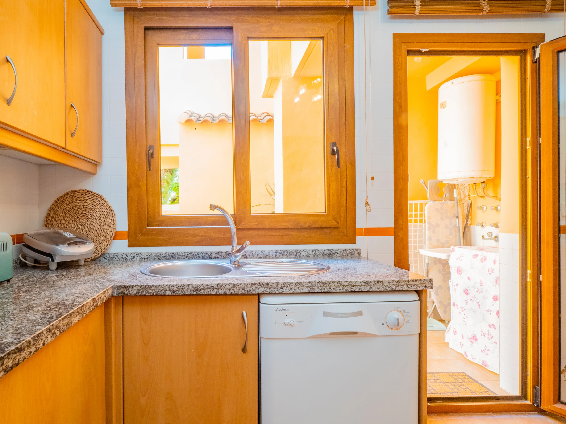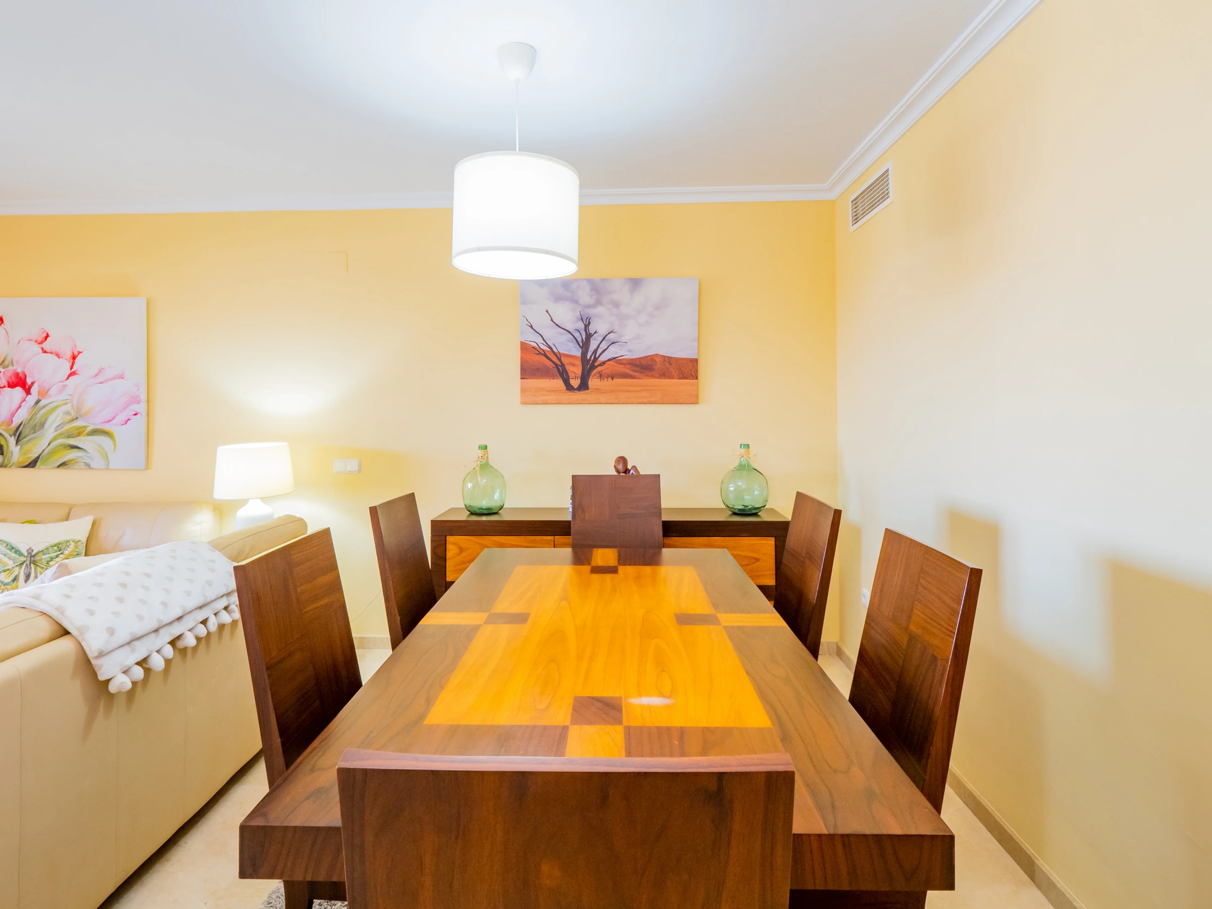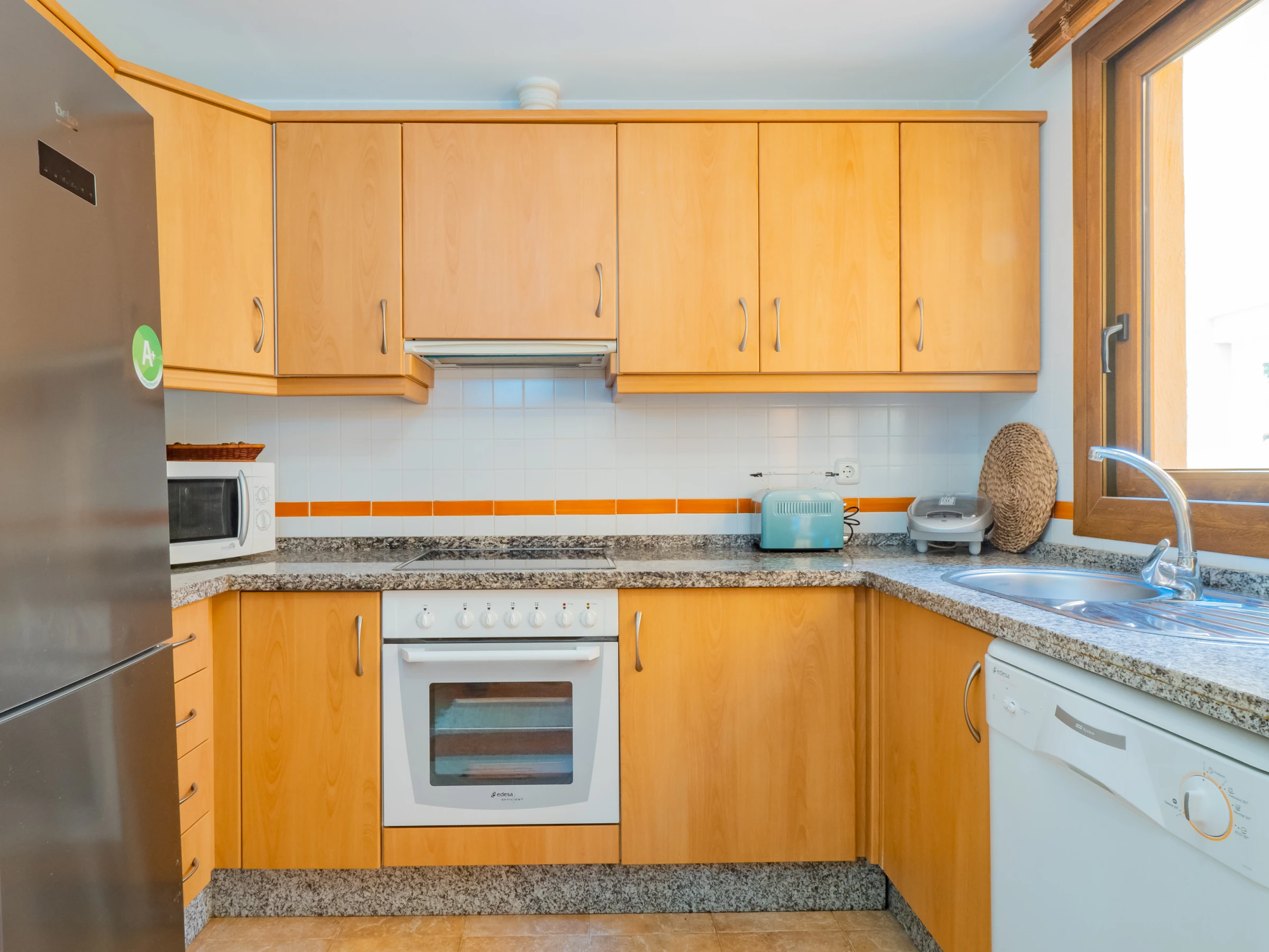 El interior cuenta con un salón comedor elegante y funcional, con dos zonas diferenciadas: un espacio de descanso con cómodos sofás y televisión, y una zona de comedor con una gran mesa de madera. La cocina independiente está totalmente equipada con electrodomésticos modernos: vitrocerámica, nevera combi, microondas, horno, congelador, lavadora, lavavajillas, cafetera, tostadora, hervidor y exprimidor, además de acceso a un patio interior que aporta luz natural.
