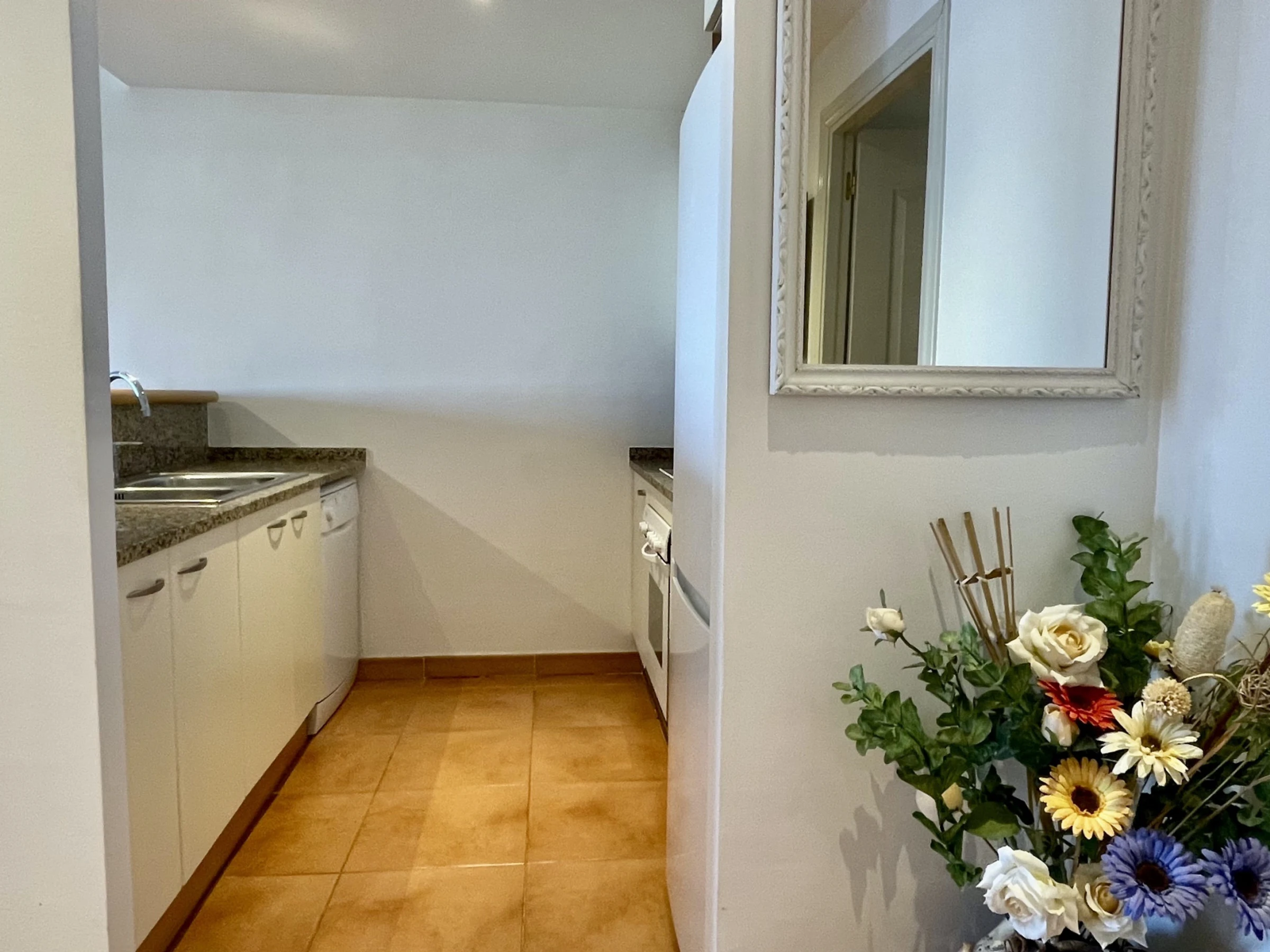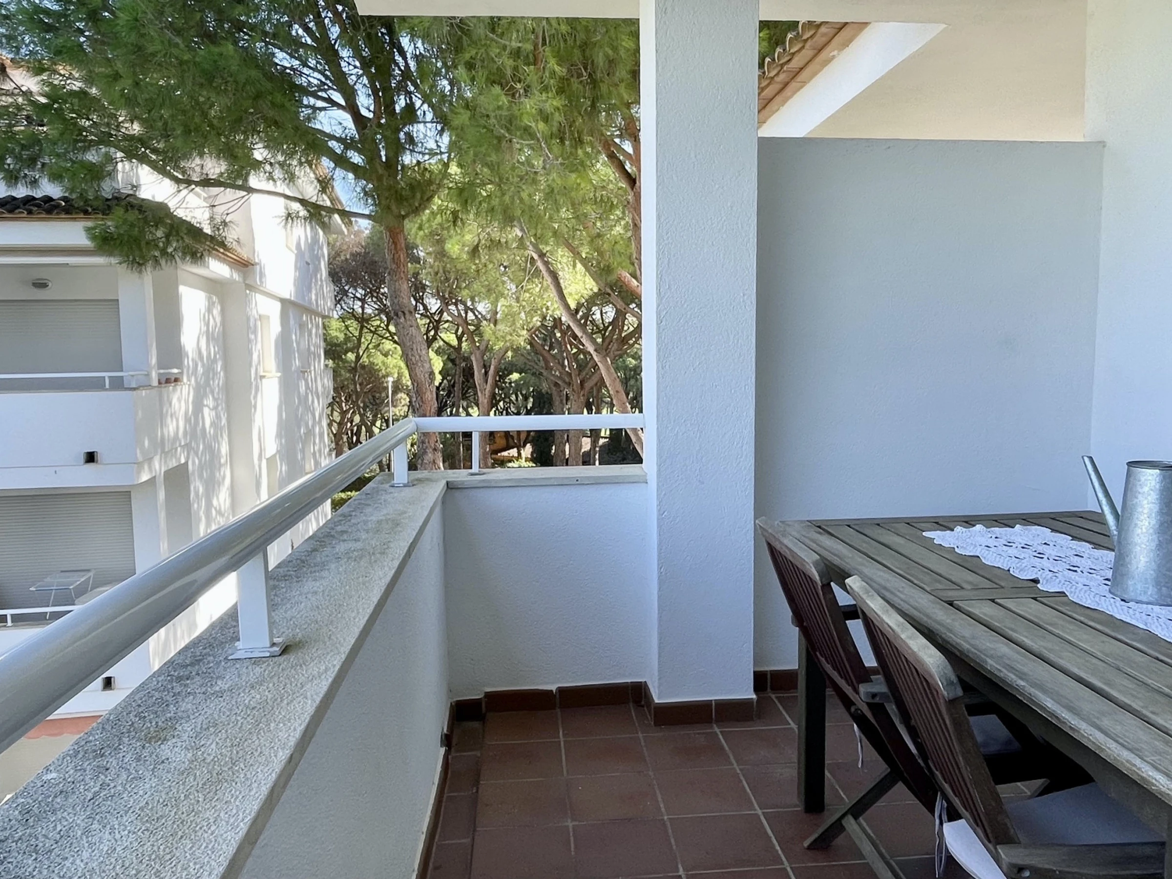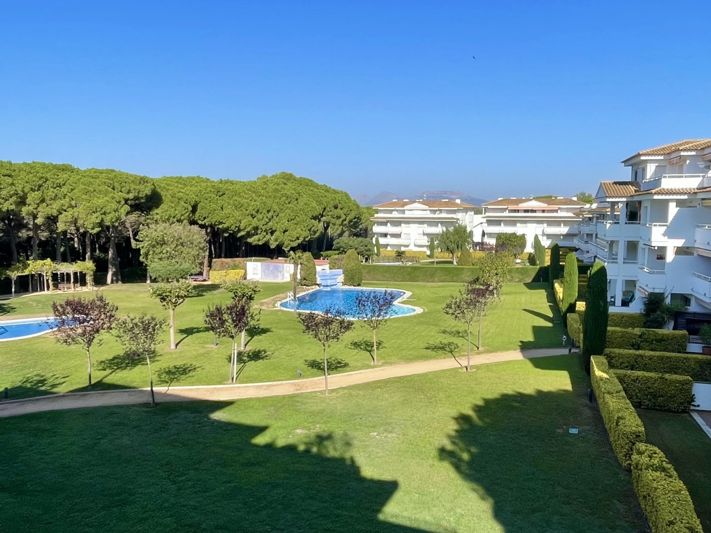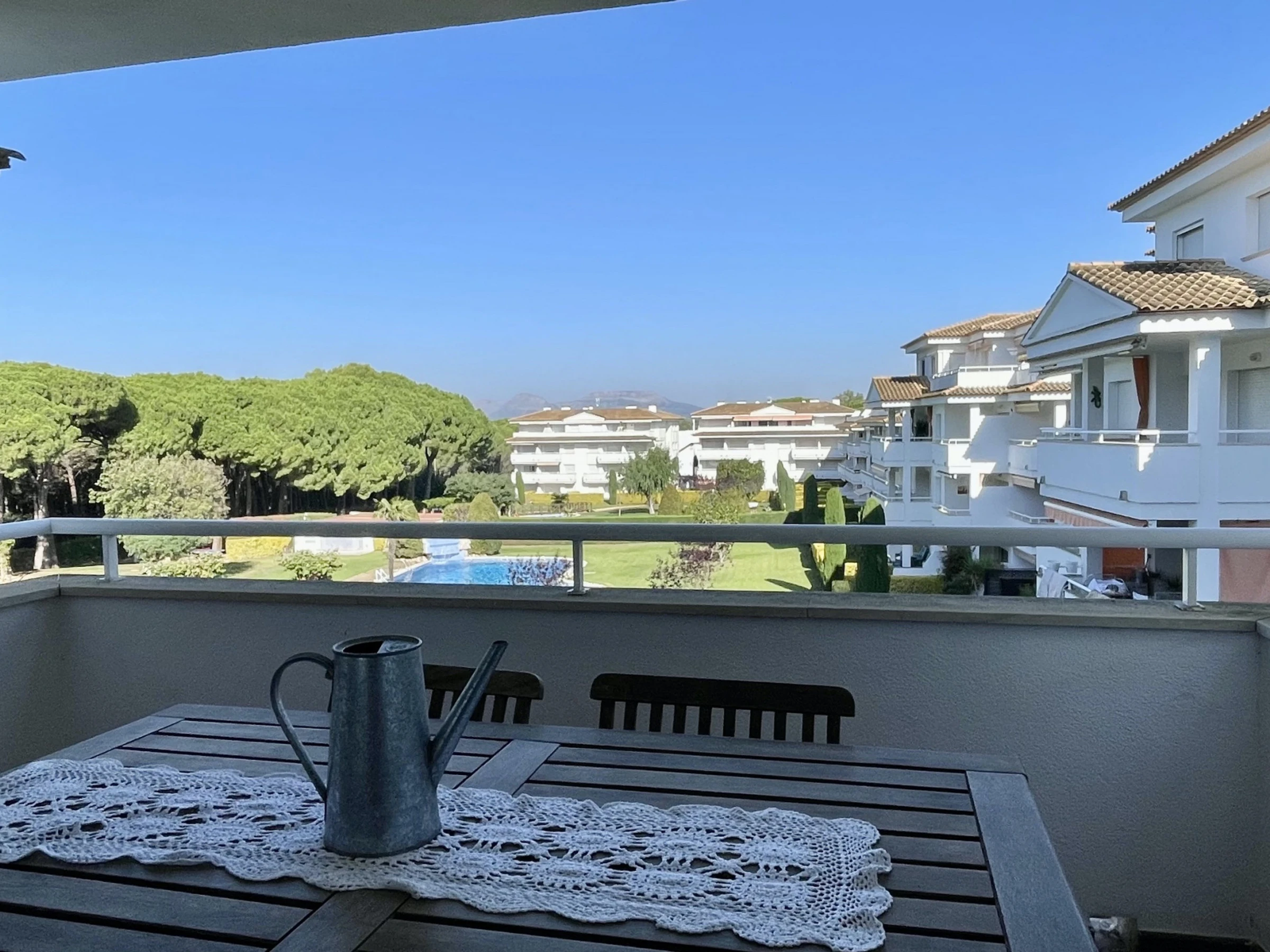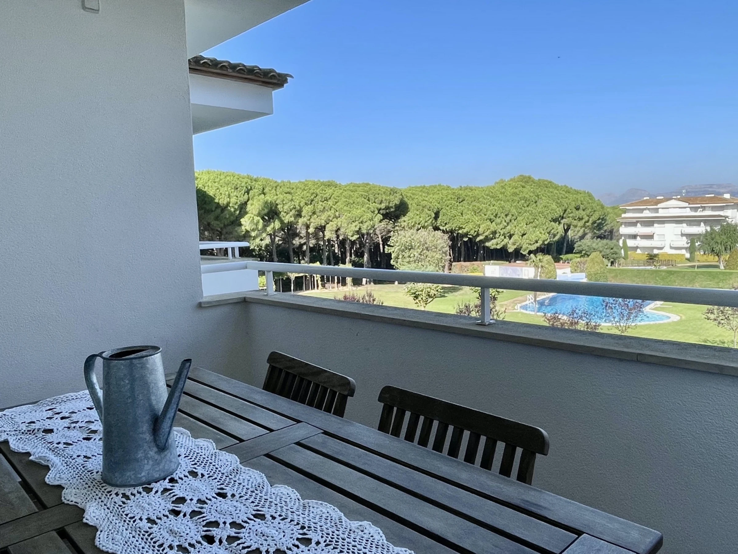 Apartamento en segunda planta compuesto por dos dormitorios, un cuarto de baño con bañera, cocina americana y el salón comedor. Dispone de balcón con vista a los jardines y a la piscina comunitaria . Ubicado en zona residencial tranquila y entorno natural, aconsejable para las vacaciones en familia. Se encuentra a 150 m del campo de Golf, 700 m del supermercado, 900 m de la playa de arena, 25 km de la estación de tren "FLAÇA" y 45 km del aeropuerto "GIRONA". Dispone de ascensor, plancha, balcón, calefacción radiadores eléctricos, piscina comunitaria+infantil, parking cubierto en edificio cercano, Televisió[hidden] cocina americana, de vitrocerámica, está equipada con nevera, microondas, horno, congelador, lavadora, lavavajillas, vajilla/cubertería, utensilios/cocina, cafetera y tostadora. Las sábanas están incluidas en el precio del alquiler. Si quieres, puedes añadir también las toallas al hacer la reserva a un precio de 4€ por persona.