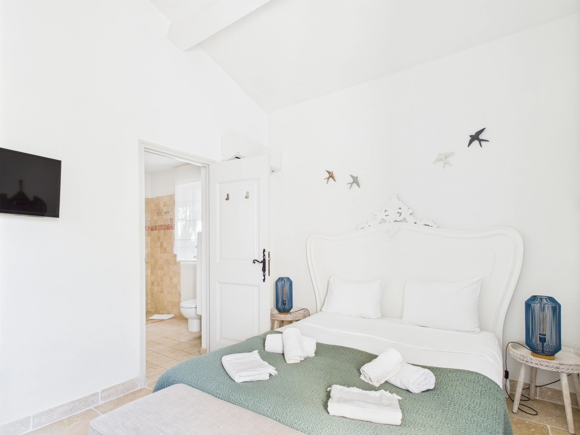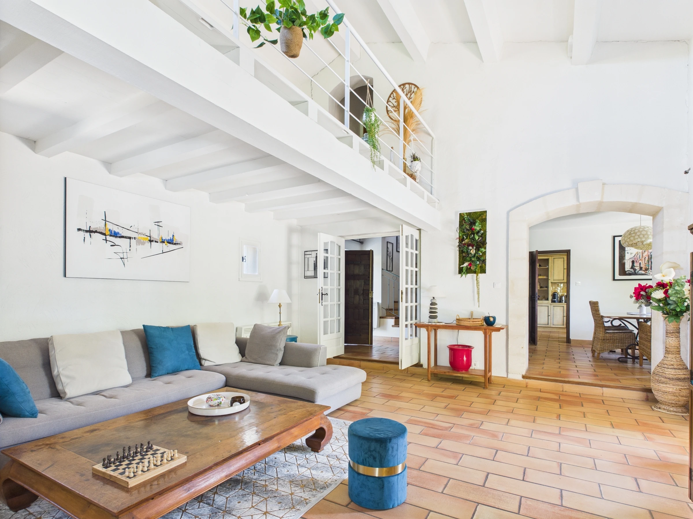 En el interior, esta masía de 220 m², distribuida en dos niveles, ofrece en la planta baja una sala de estar, una cocina, un comedor y dos dormitorios, cada uno con su baño. Arriba, otros dos dormitorios comparten un baño. Cada habitación tiene aire acondicionado, lo que garantiza un confort óptimo.